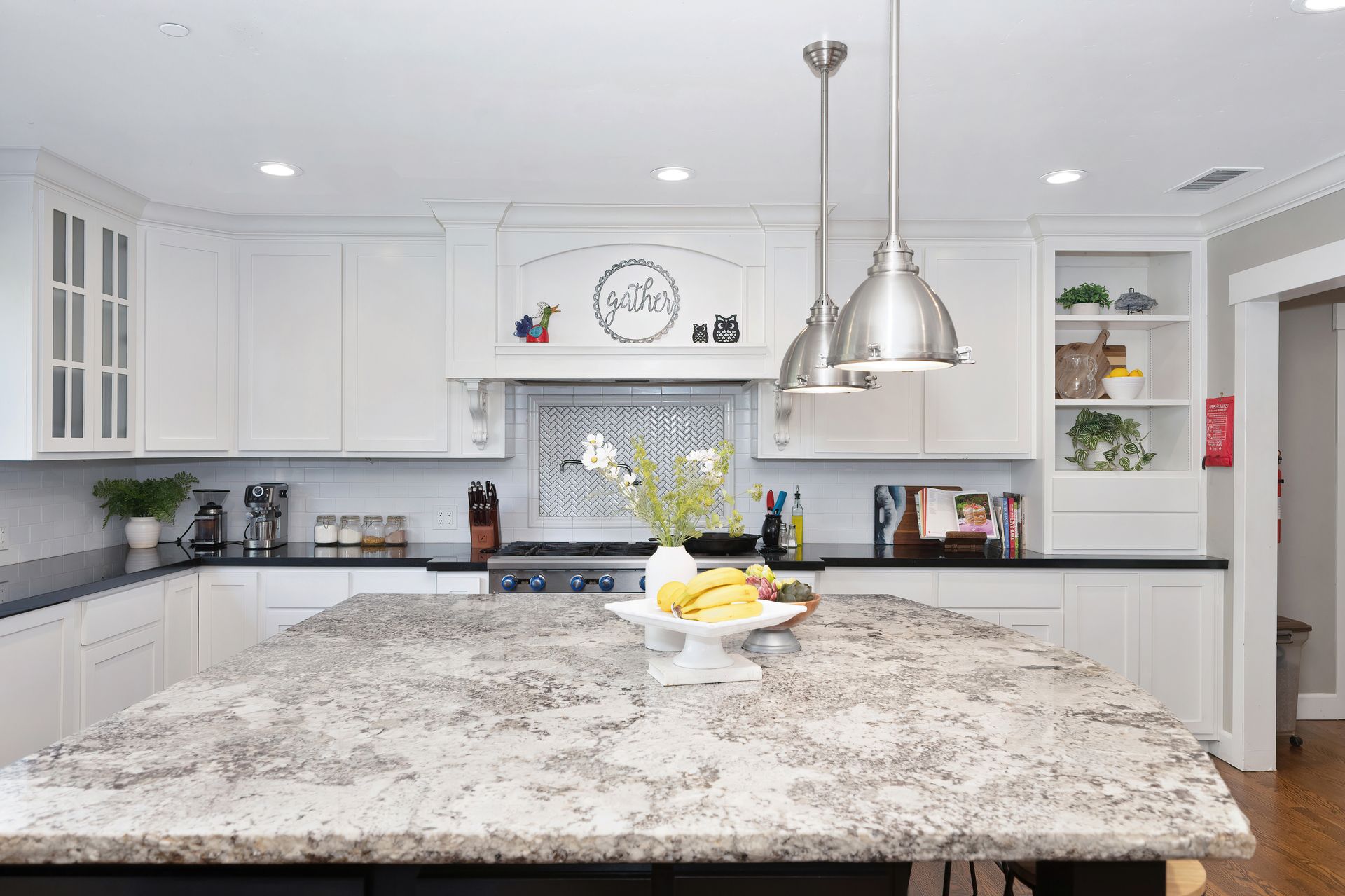 The chef’s kitchen features an expansive granite island (7' x 6.5"), impressive eight-burner commercial range, double ovens, a warming drawer, farmhouse sink, pot filler, abundant custom cabinetry, and a five foot commercial refrigerator/freezer.