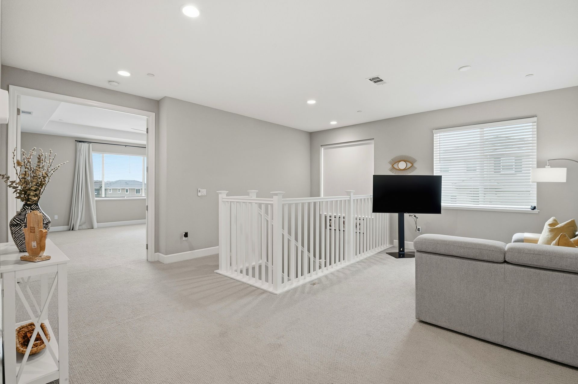 Just beyond the suite, a versatile loft provides flexible space for work, recreation, or quiet lounging. The primary suite is intentionally separated from the three additional bedrooms and their shared bathroom, creating an ideal sense of privacy and balance for the entire household.