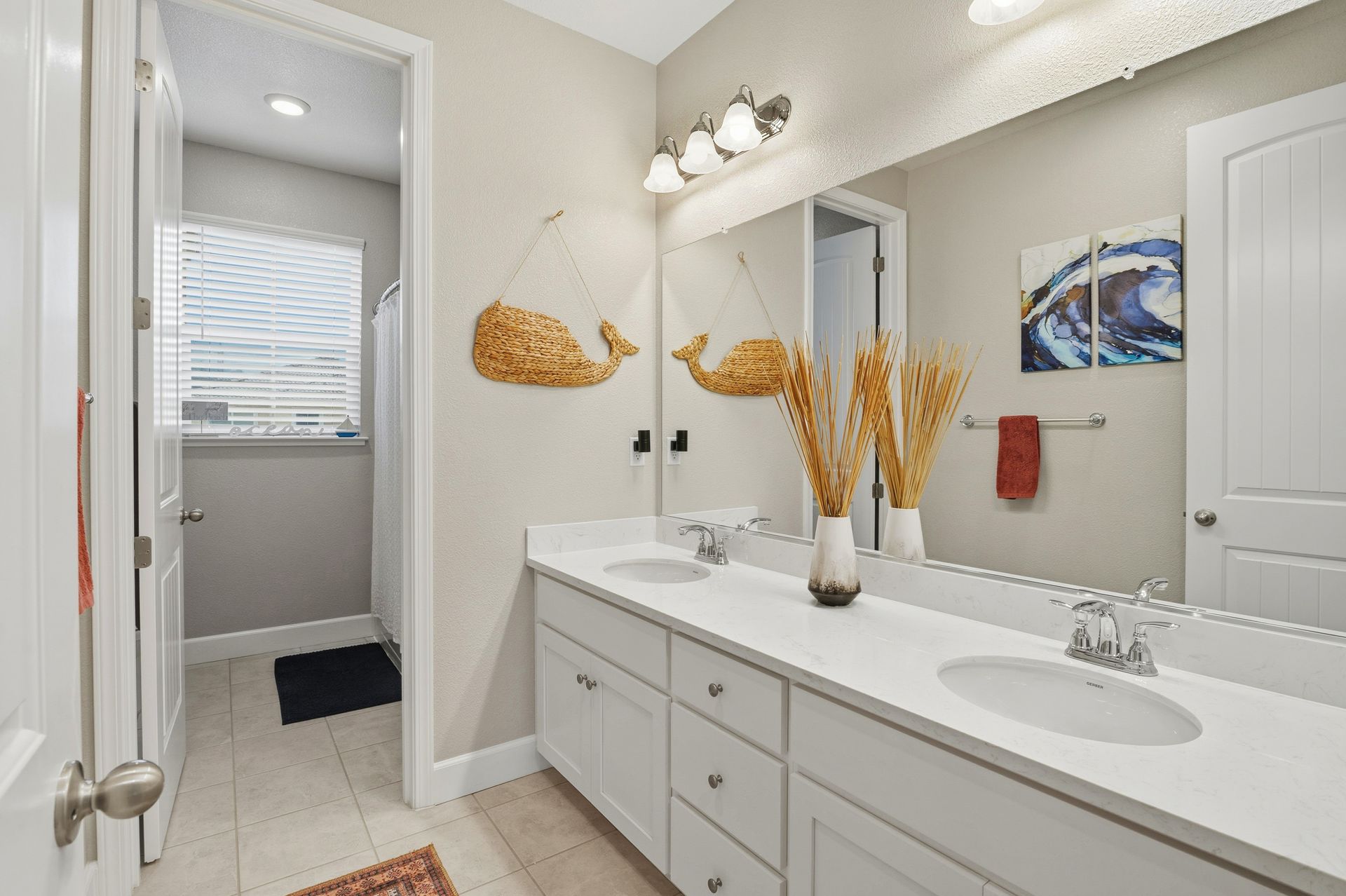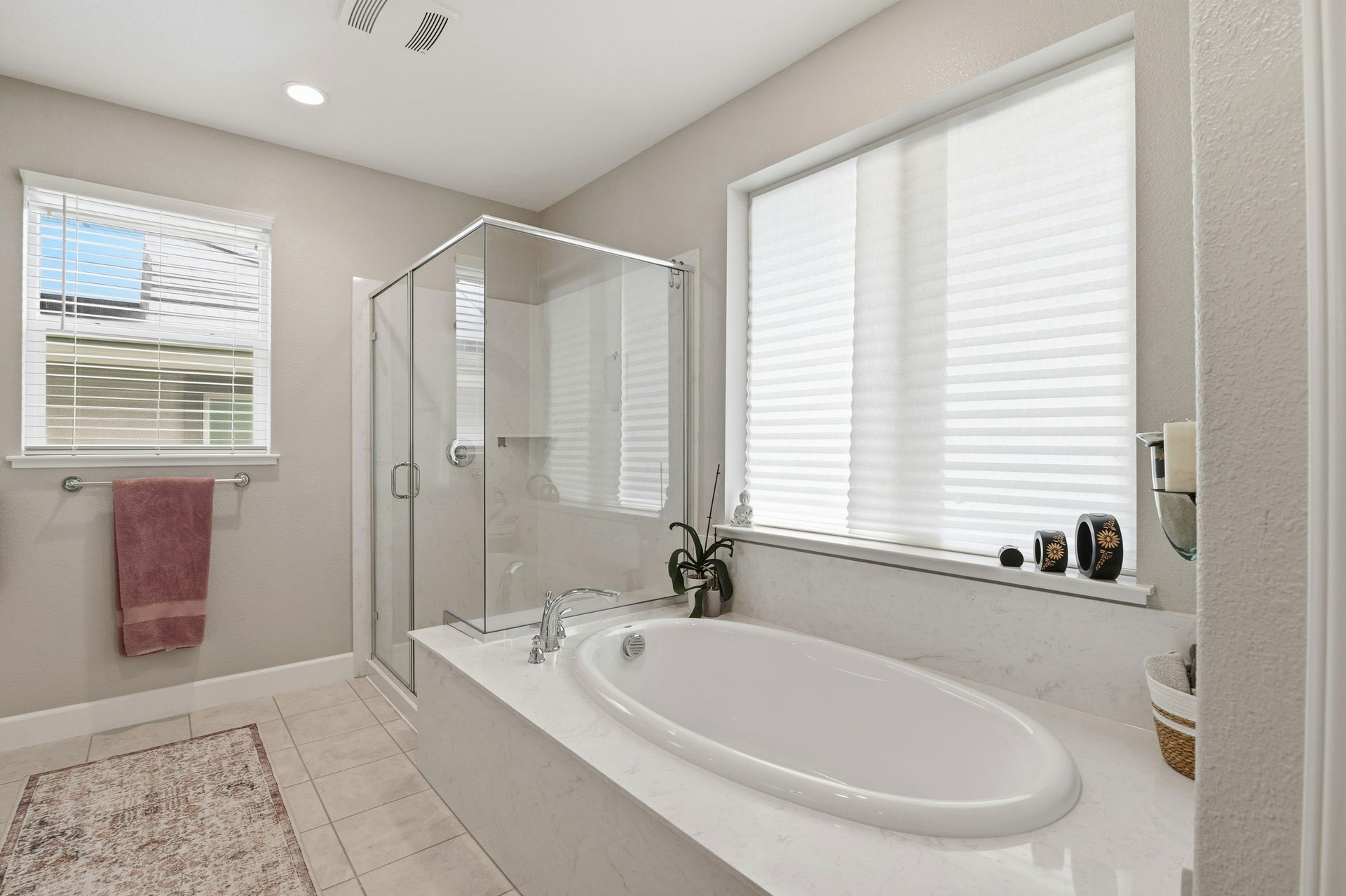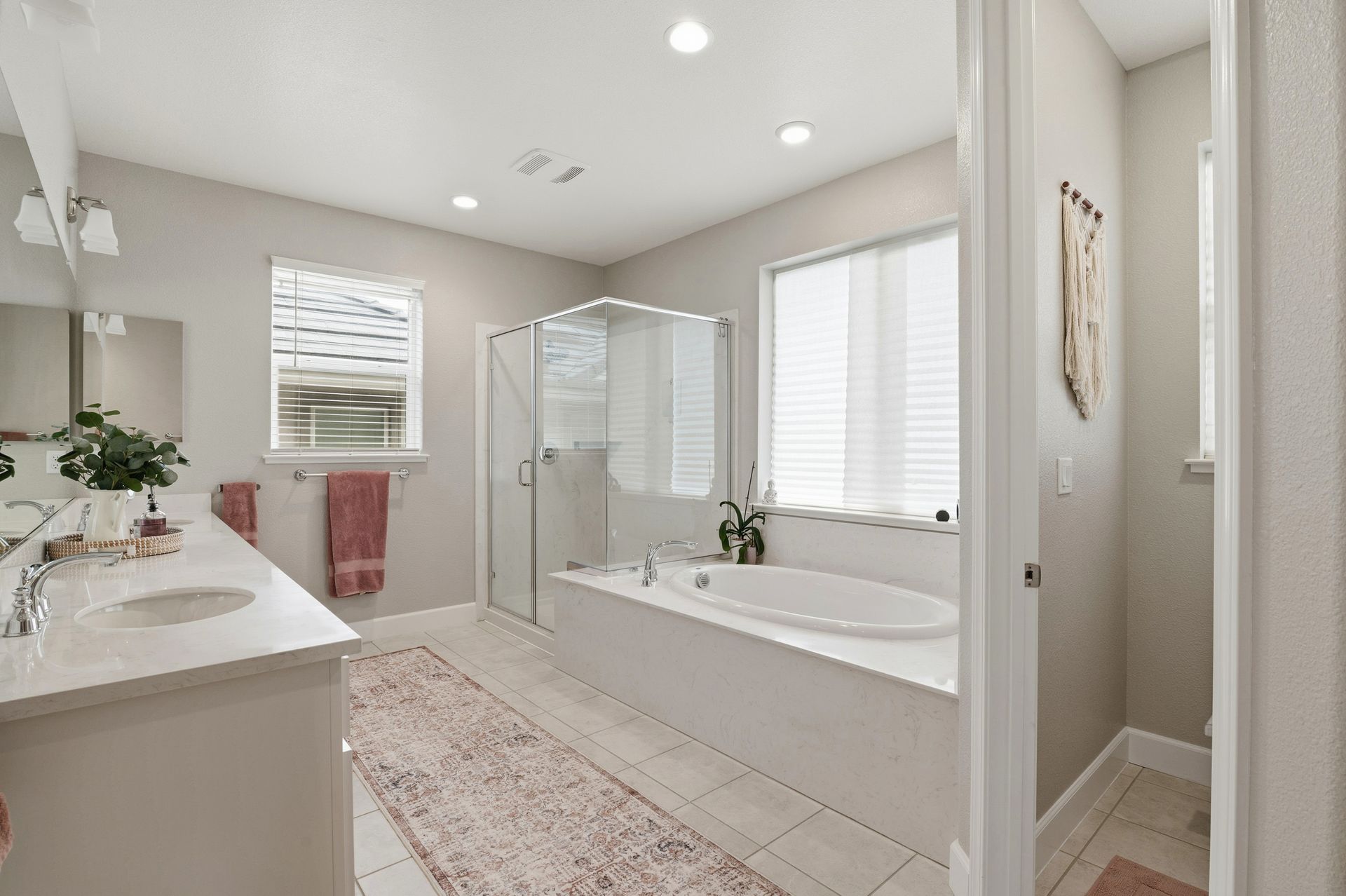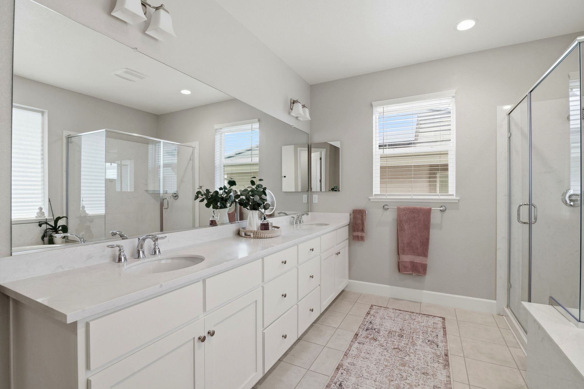 The spacious primary suite offers a tranquil sanctuary complete with a walk-in closet and a beautifully appointed bathroom featuring a marble soaking tub, a coordinated shower, and dual vanities. It’s a luxurious retreat thoughtfully crafted for rest and rejuvenation.