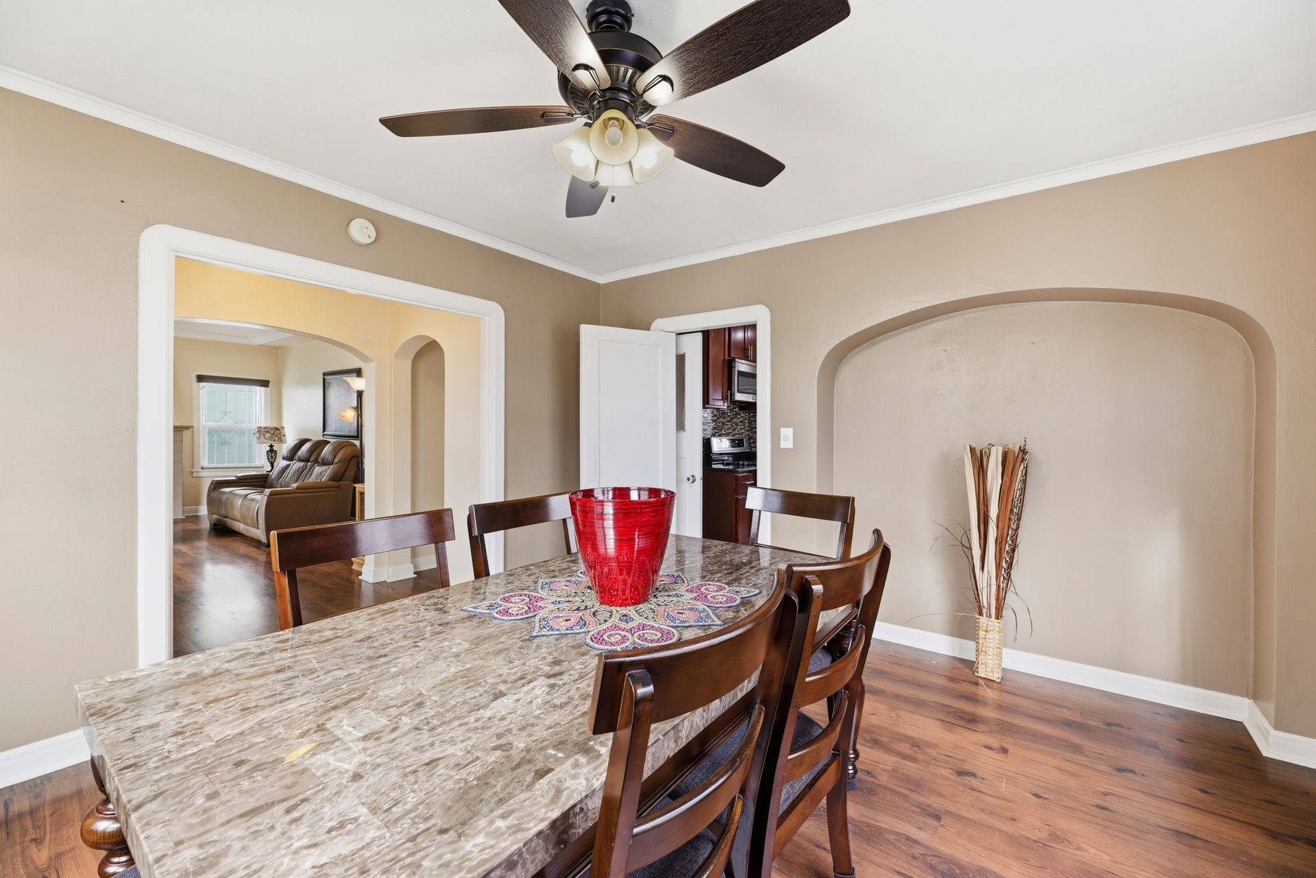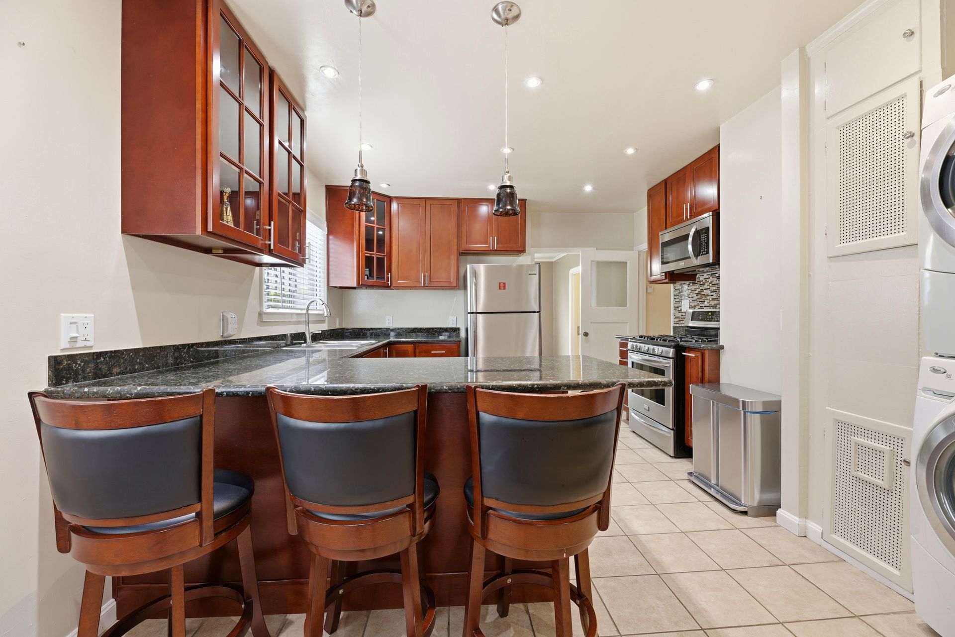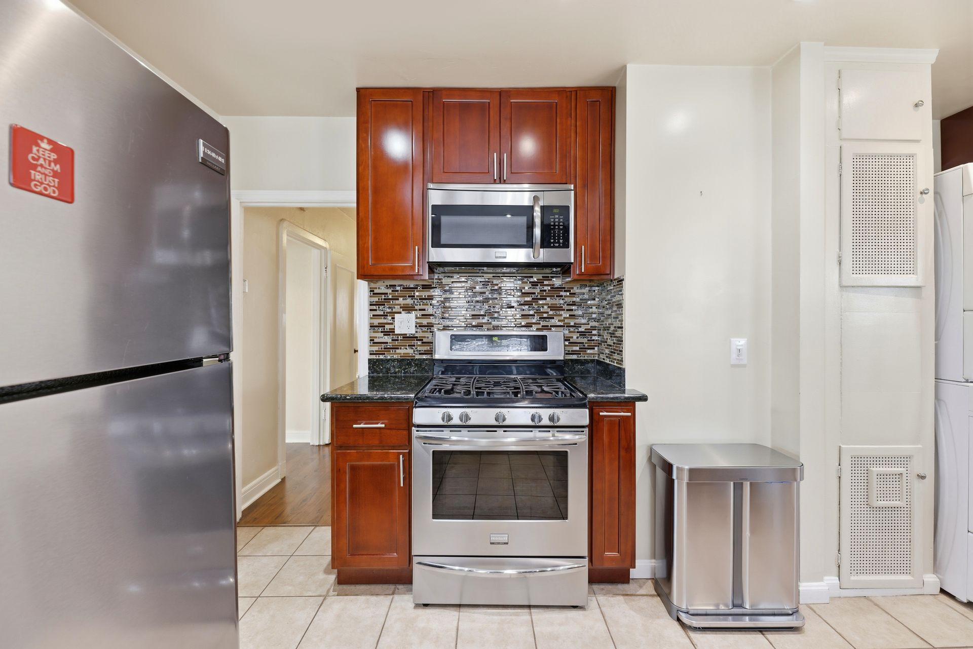 The refreshed kitchen showcases rich cherry-wood cabinetry, custom tile backsplash, stone countertops, tile flooring, and matching stainless steel appliances. From here, venture out onto the charming seating porch—ideal for enjoying the serene beauty of the backyard.