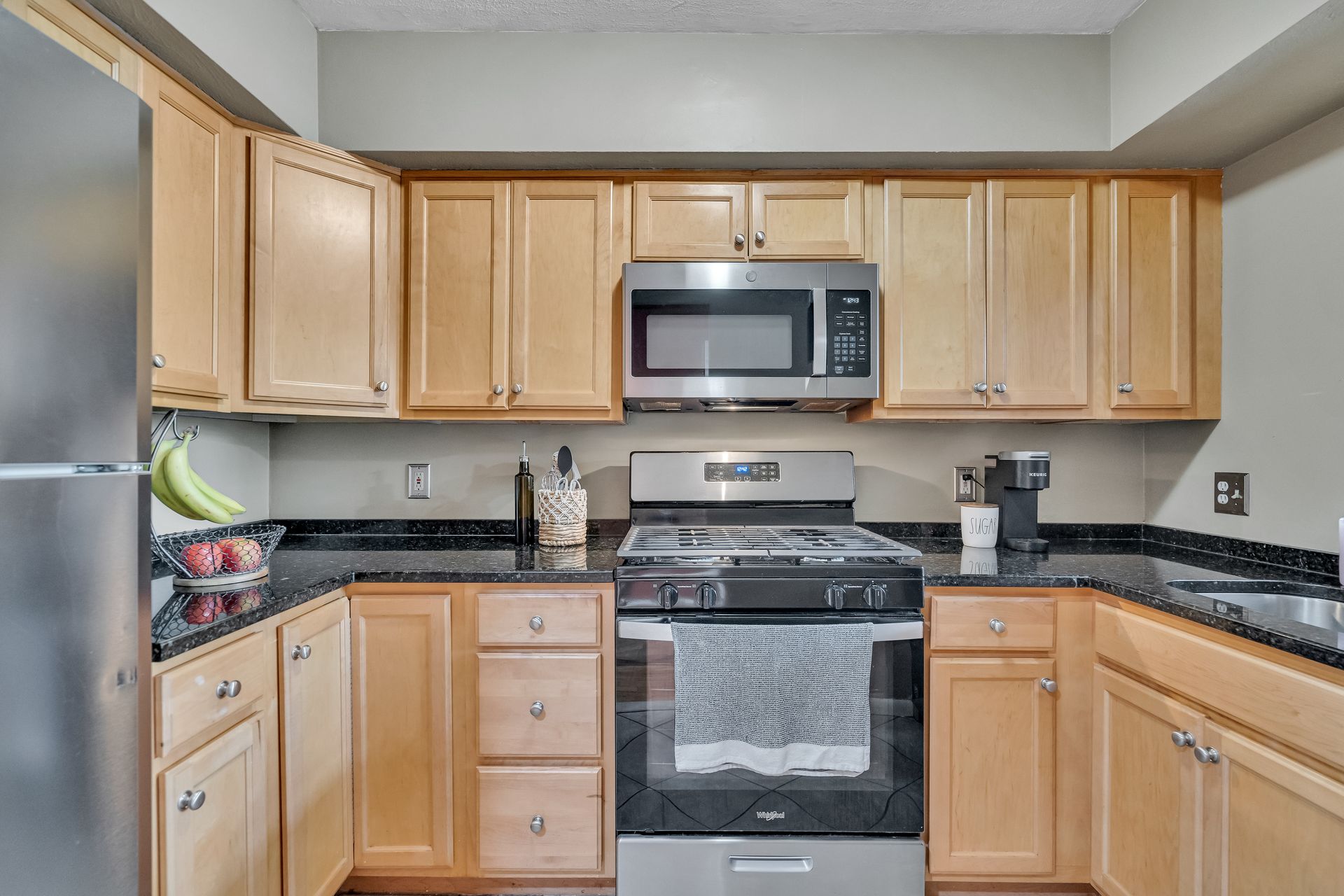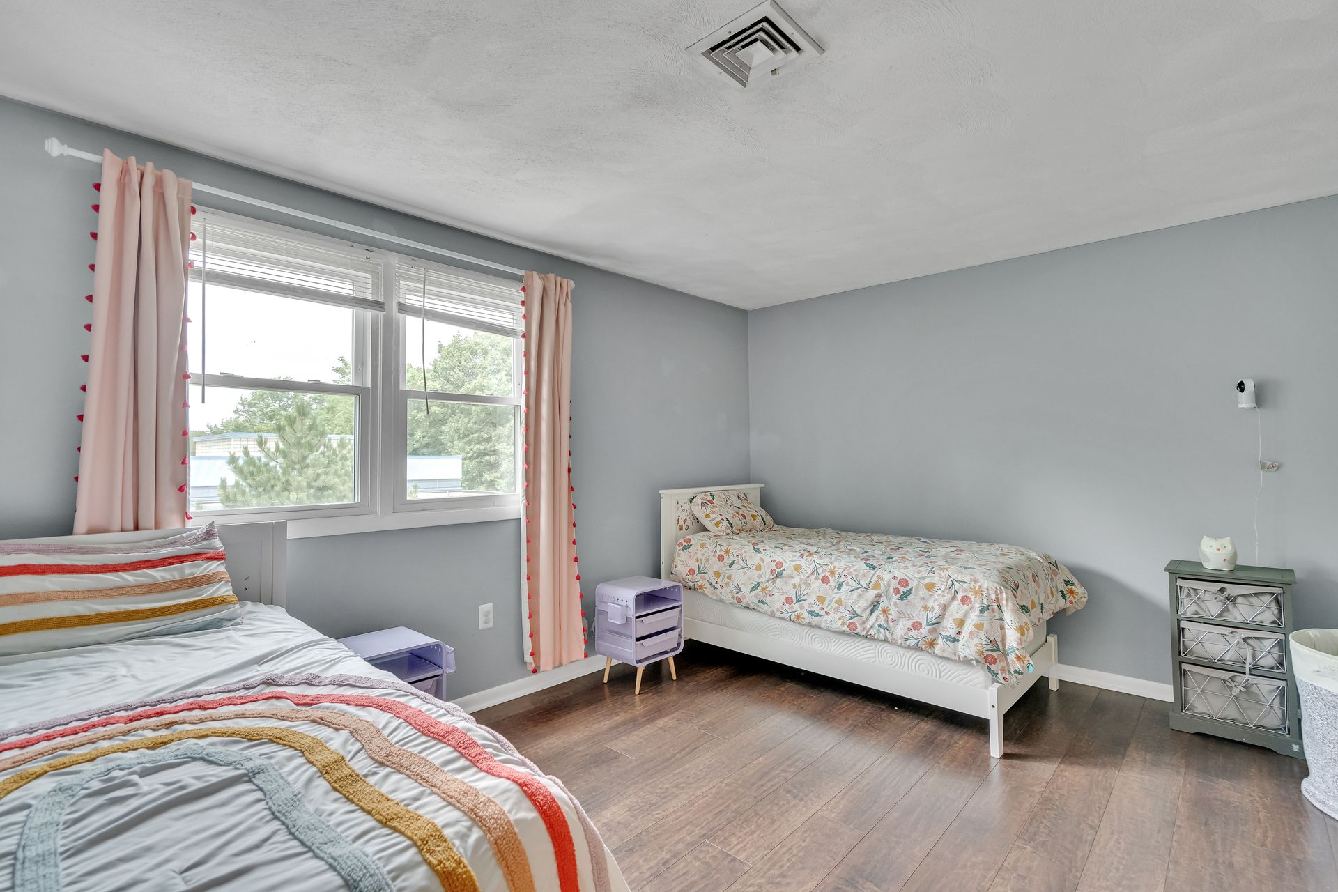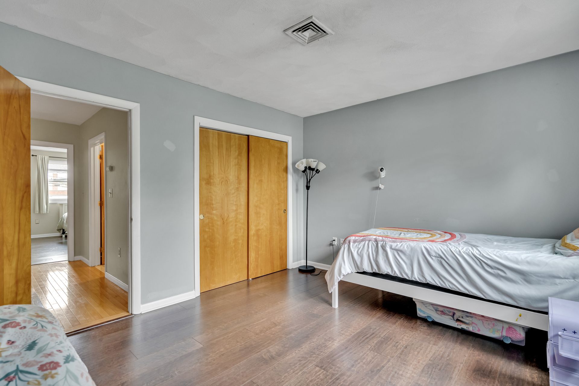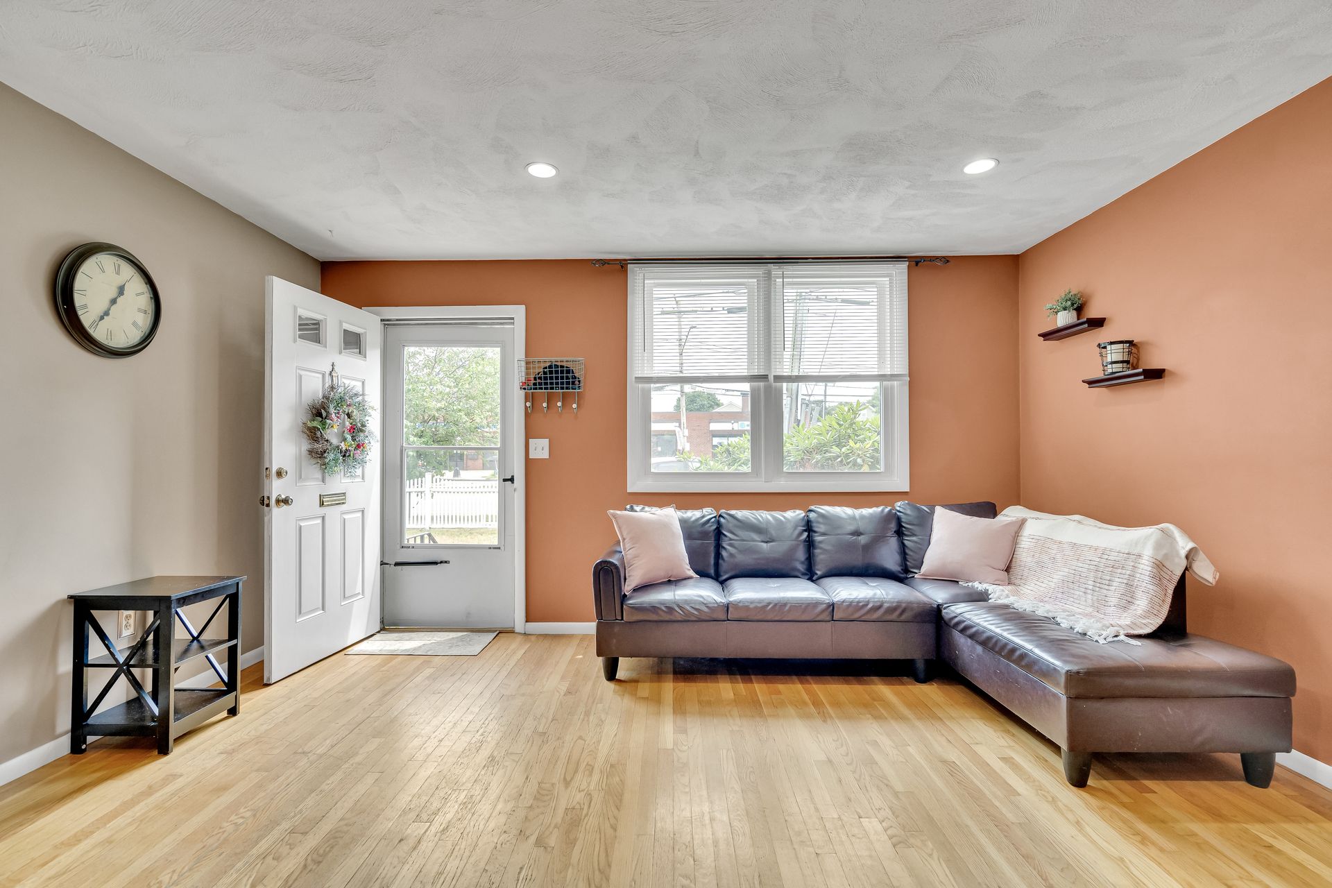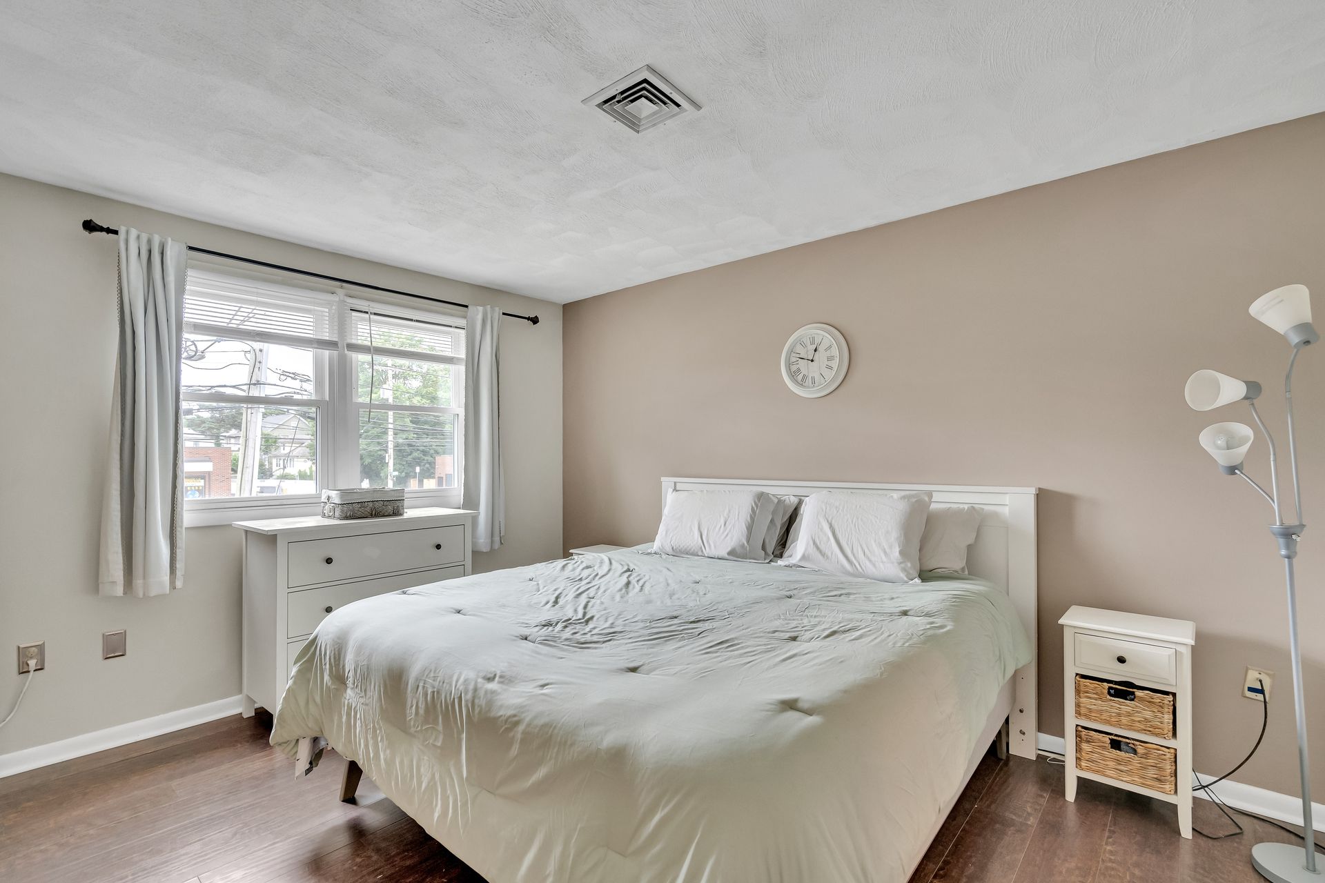Hardwood flooring and recessed lighting throughout the main living areas add warmth and a modern feel. The kitchen is equipped with ample storage and modern appliances, seamlessly blending style and function. The generous room sizes provide flexibility in furniture arrangement, and the neutral color palette allows for personalization.