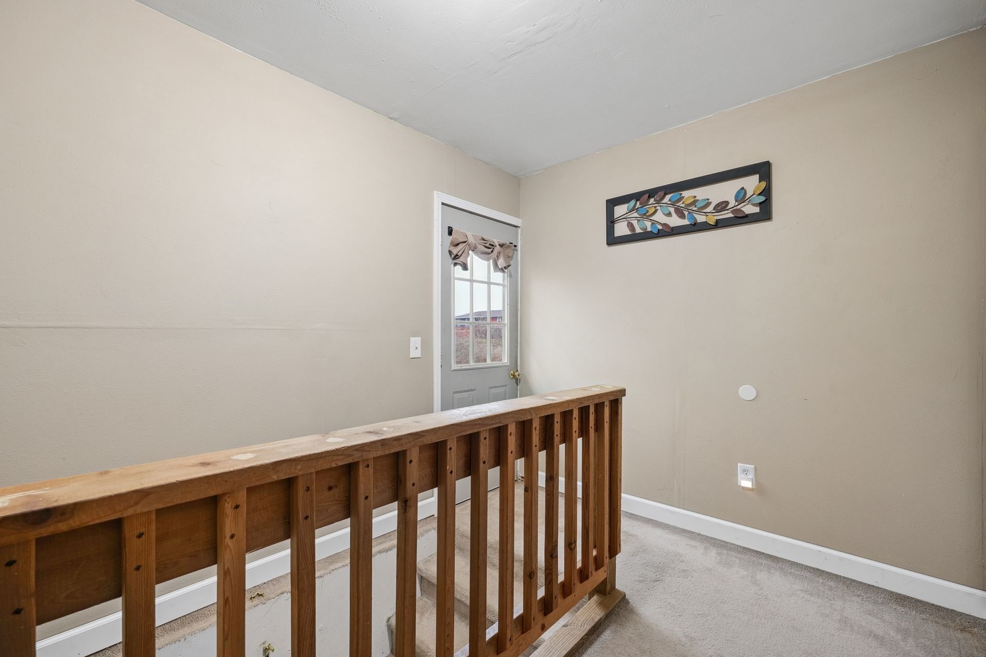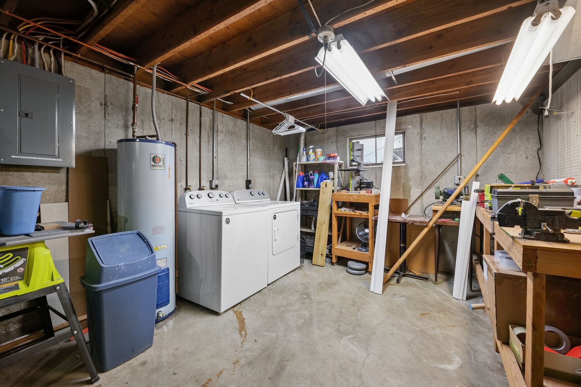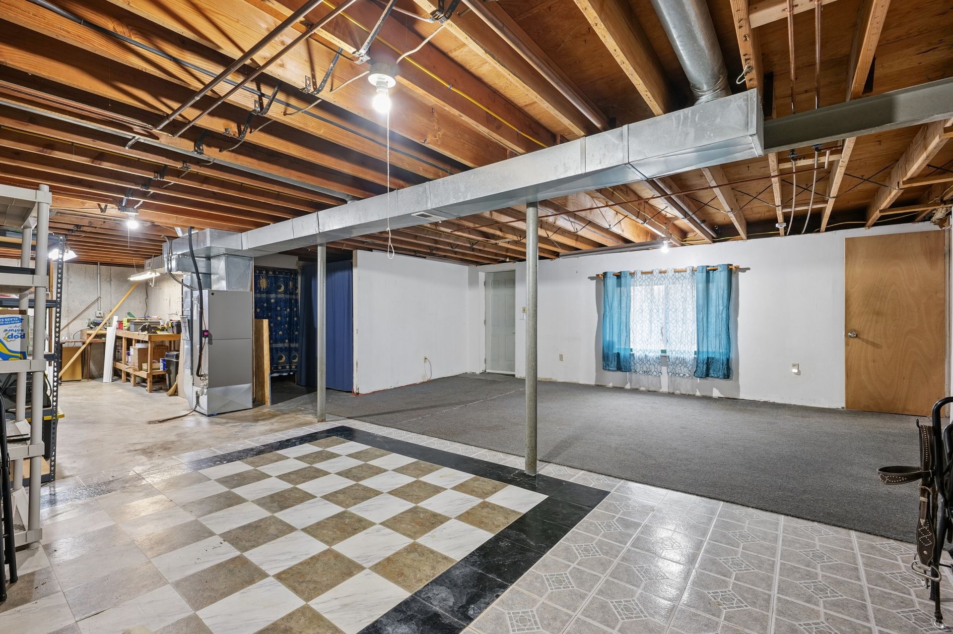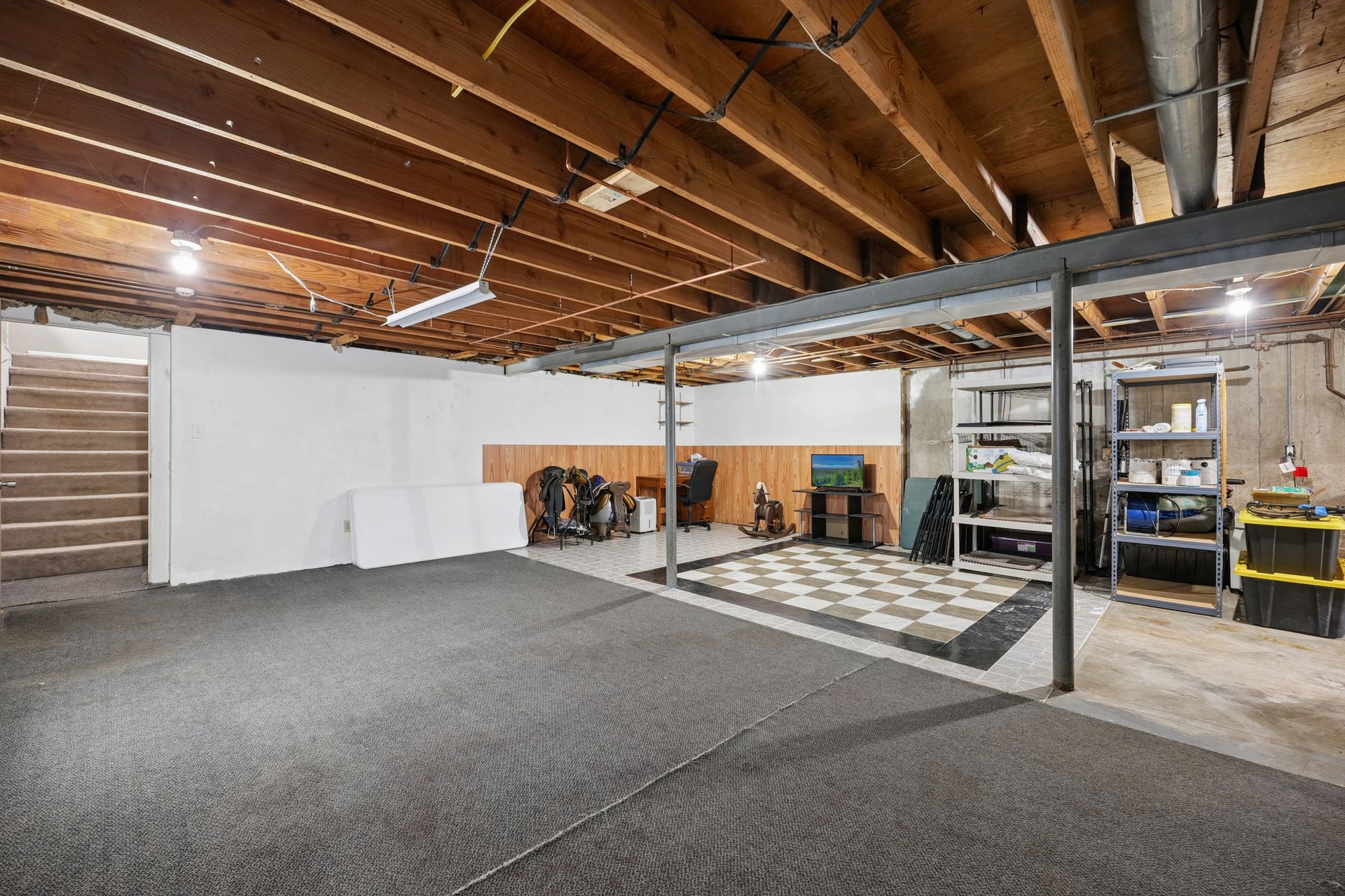 The full basement is partially finished and provides added living space. It is sectioned into rooms, including a game/recreation area, laundry/utility/workshop space, and a storage or sleeping area. The basement flooring is a combination of lay down carpeting and exposed concrete. There is a walkout door that provides easy access to the backyard.