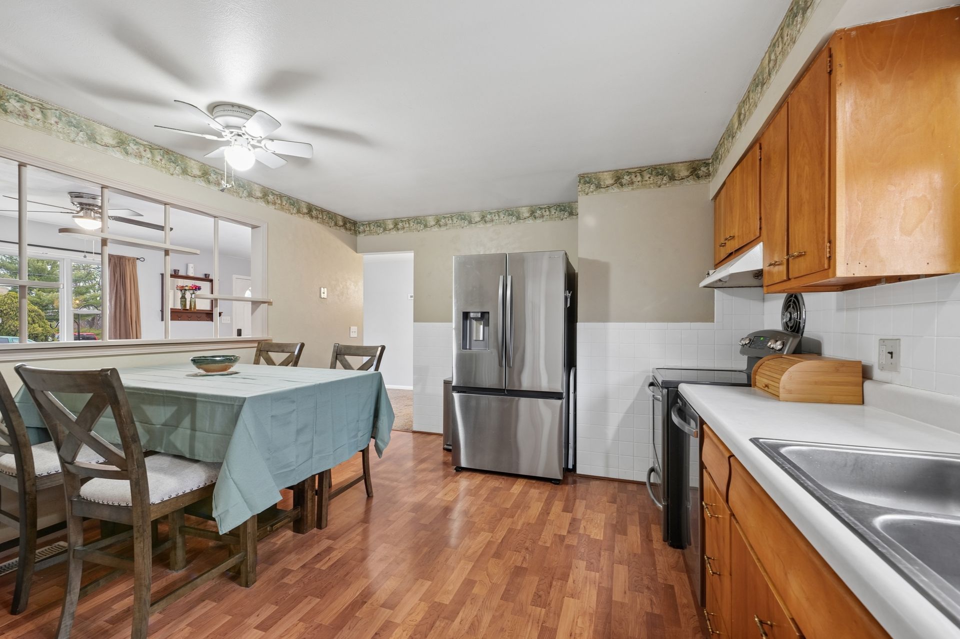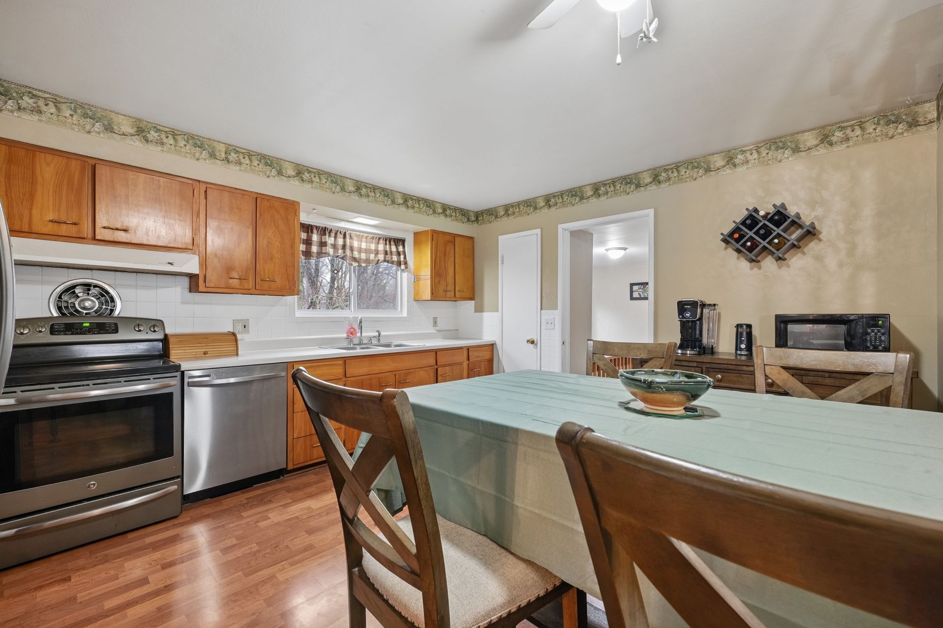 A convenient mud room connects the kitchen, the attached one-car garage, and the door leading out to the 17' x 11' wooden deck, which overlooks the backyard and trees.