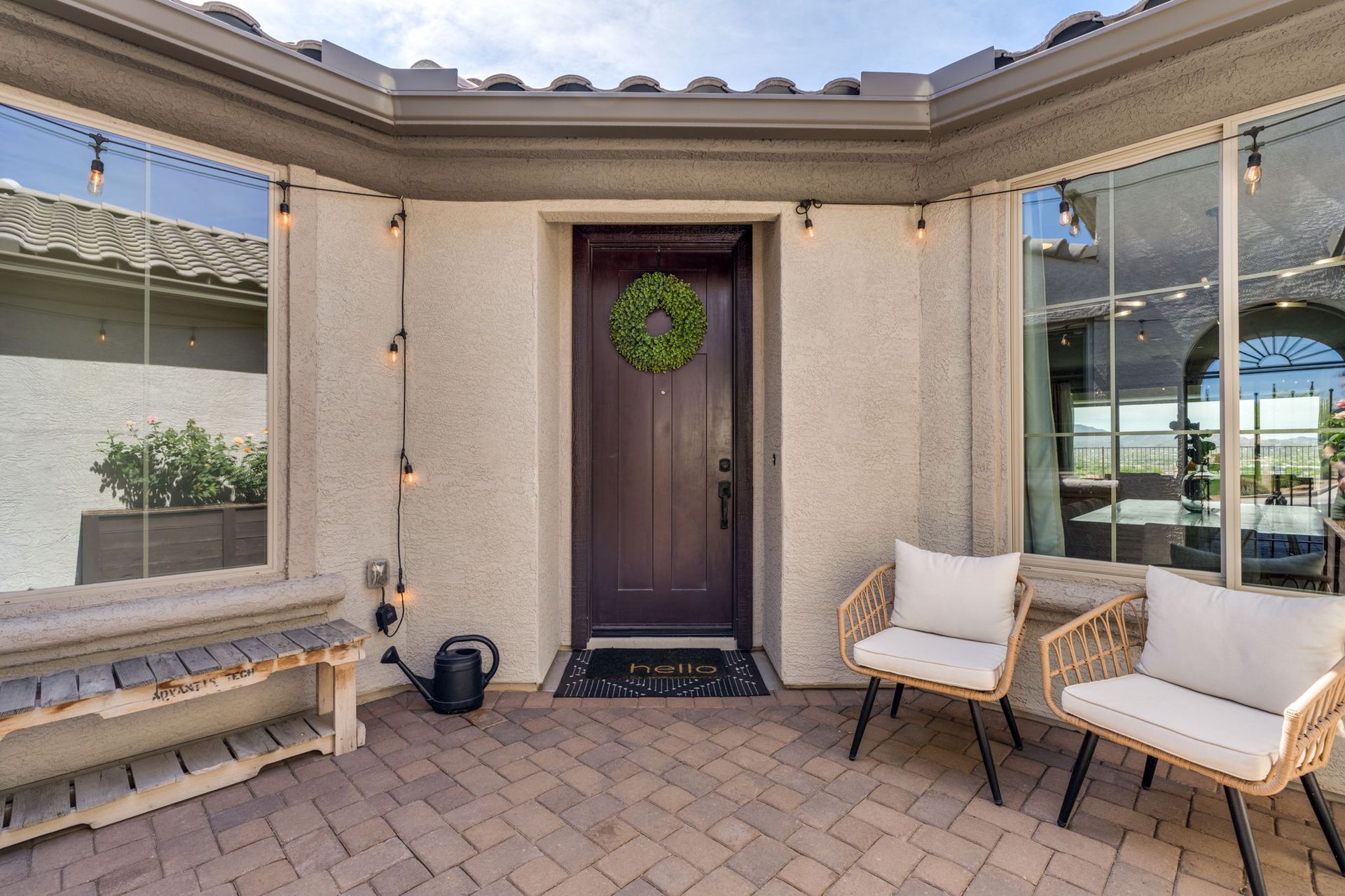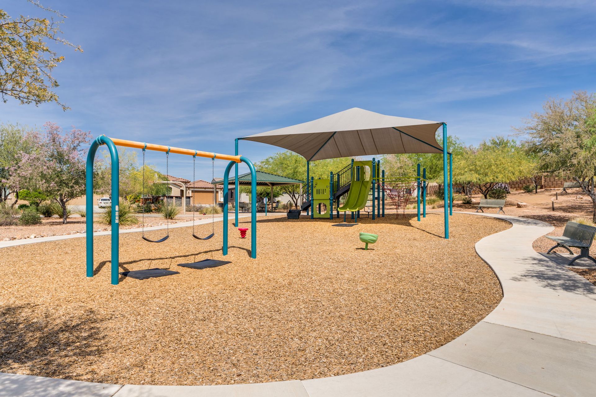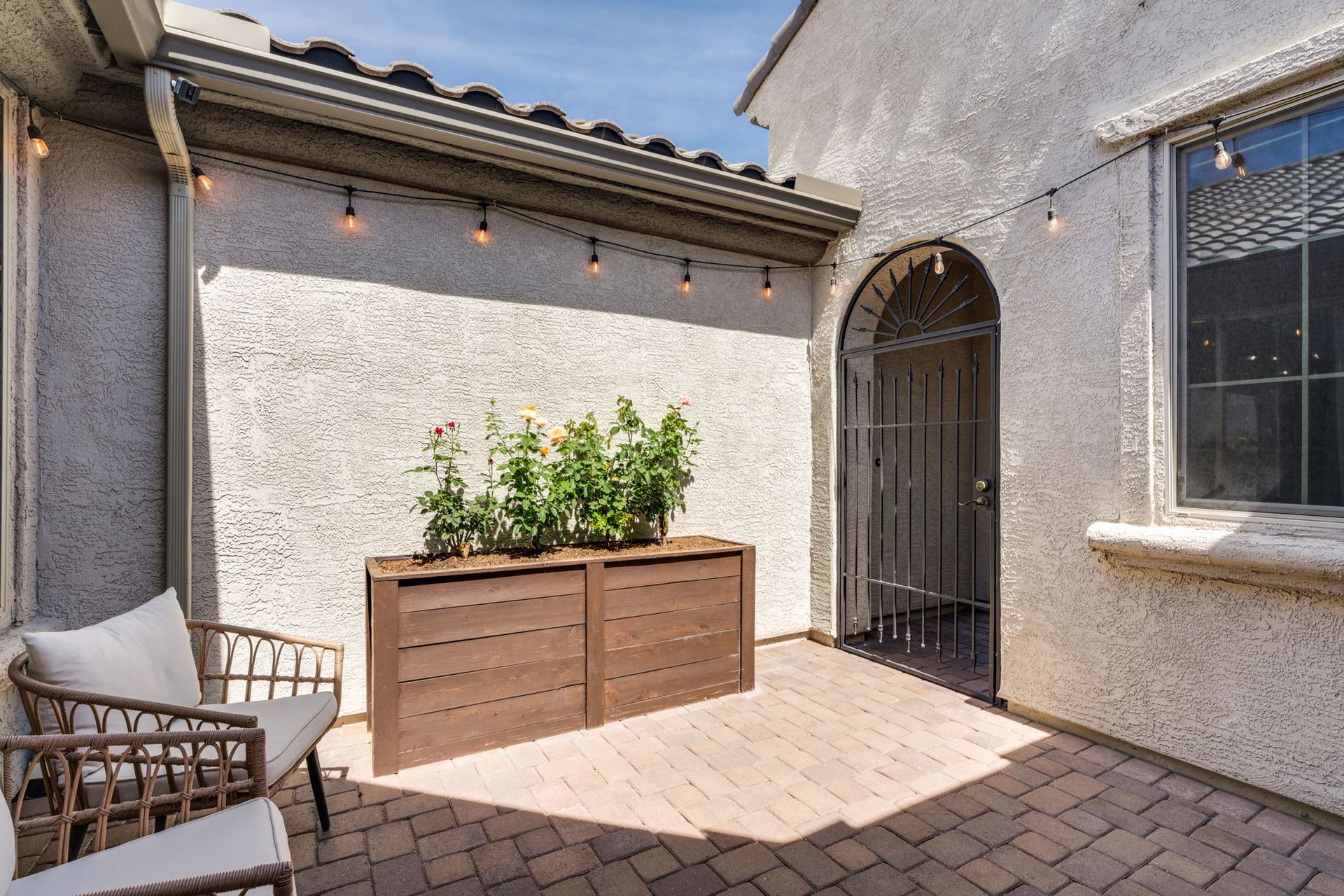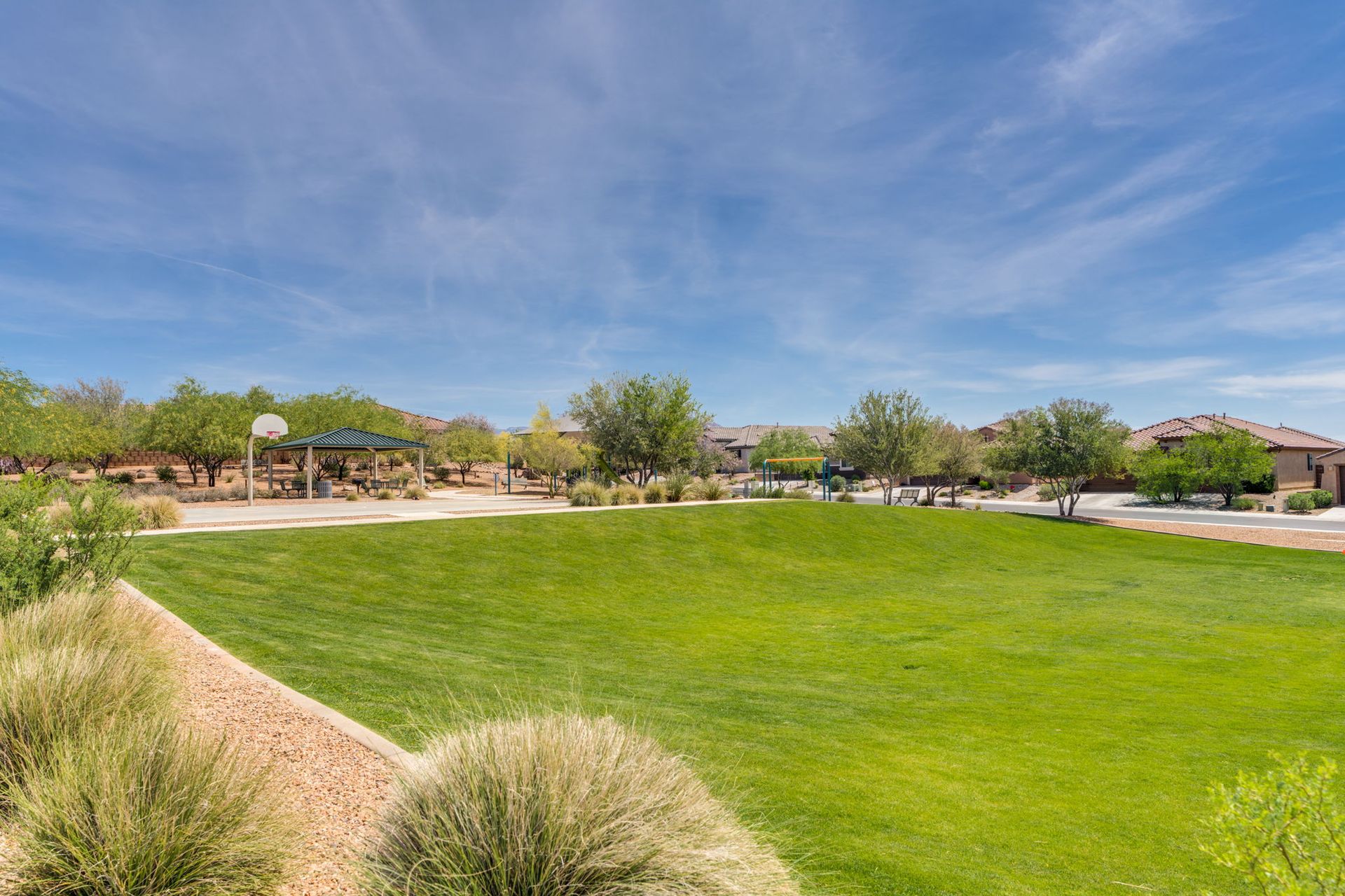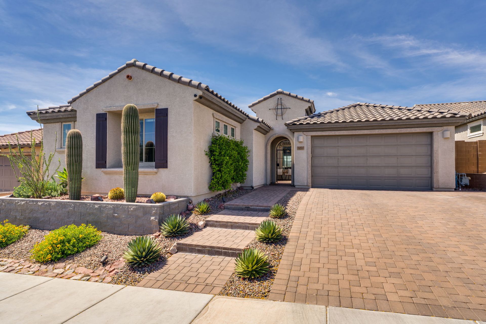 Curb appeal is enhanced by a pavered driveway and walkways, automated drip irrigation, and light-sensitive landscape features. A park located just across the street extends the sense of openness and offers additional space to relax and enjoy the surroundings.