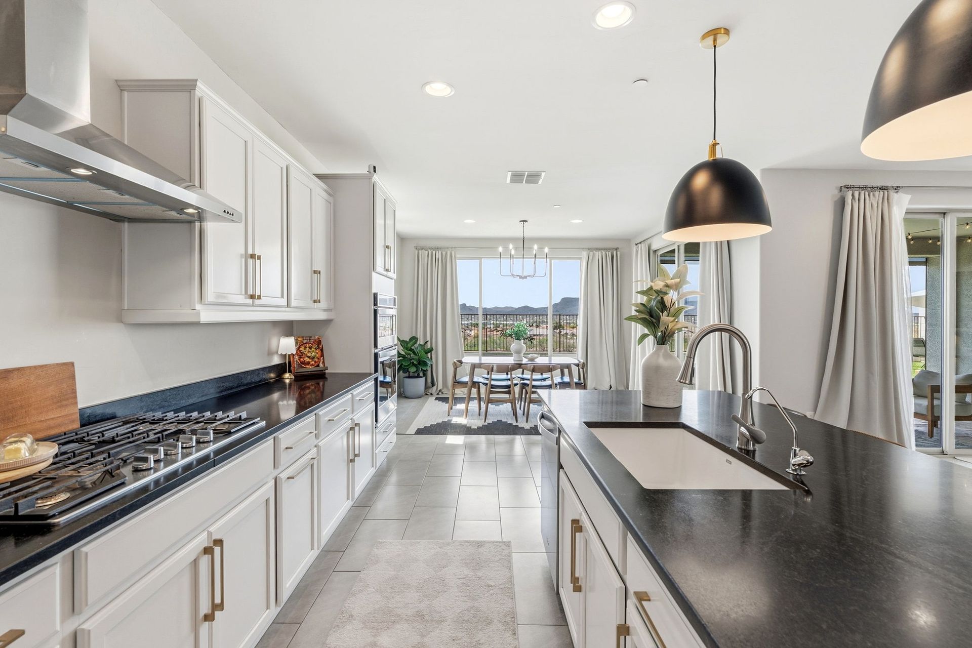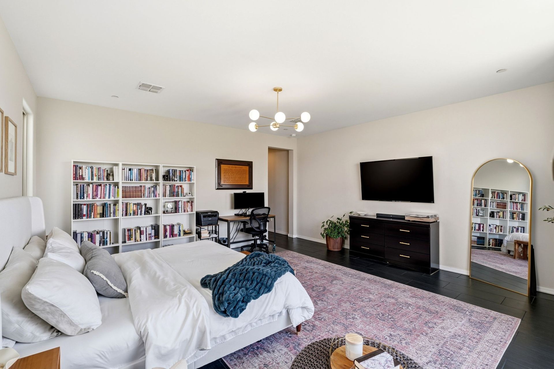 A gated courtyard creates a welcoming first impression, leading into light-filled interiors designed for both comfort and connection. Flexible living spaces—including a private in-law suite, dedicated den, and separate TV room—make the home ideal for multi-generational living, guests, or a quiet work-from-home retreat. Tile flooring flows through the main living areas, complemented by crisp white cabinetry and updated hardware for a clean, contemporary look.