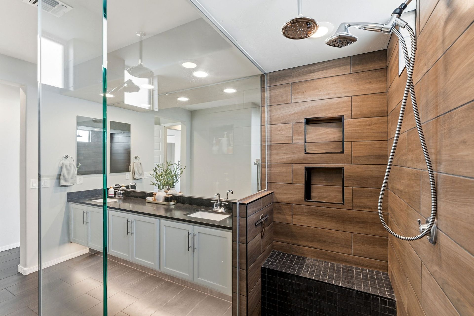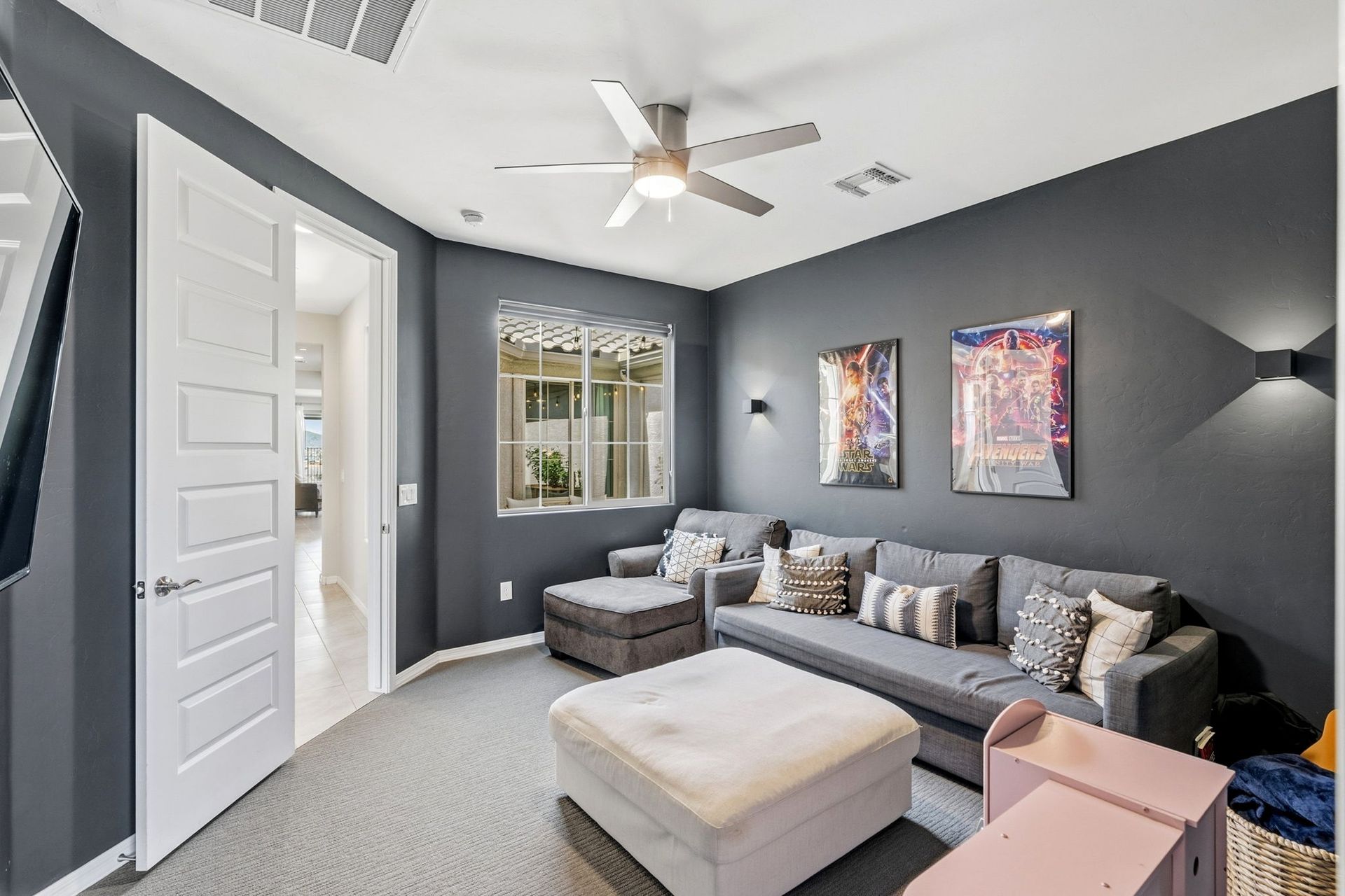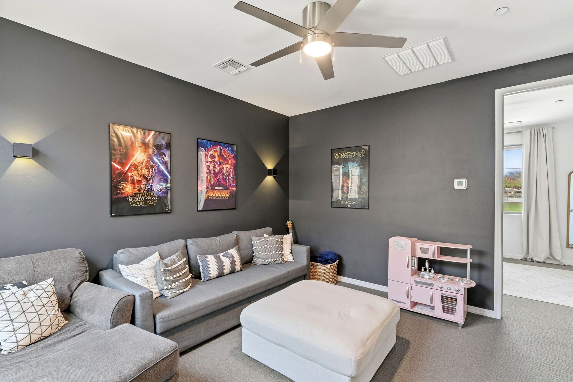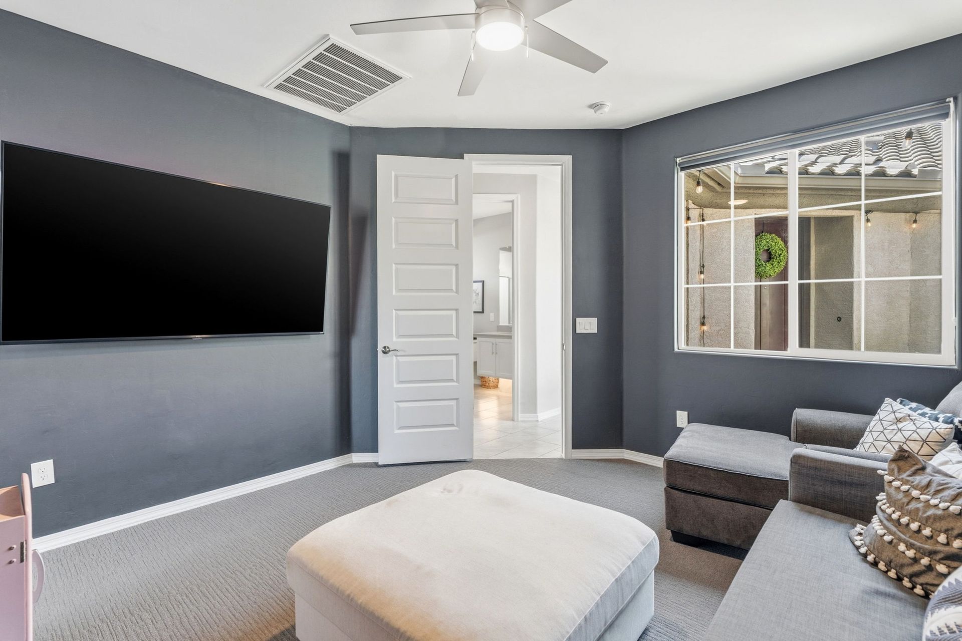 Inside, the home blends style with smart functionality, featuring a fully integrated smart home hub, built-in fire sprinklers, multiple Wi-Fi range extenders, and ethernet and media outlets—including on the outdoor patio.