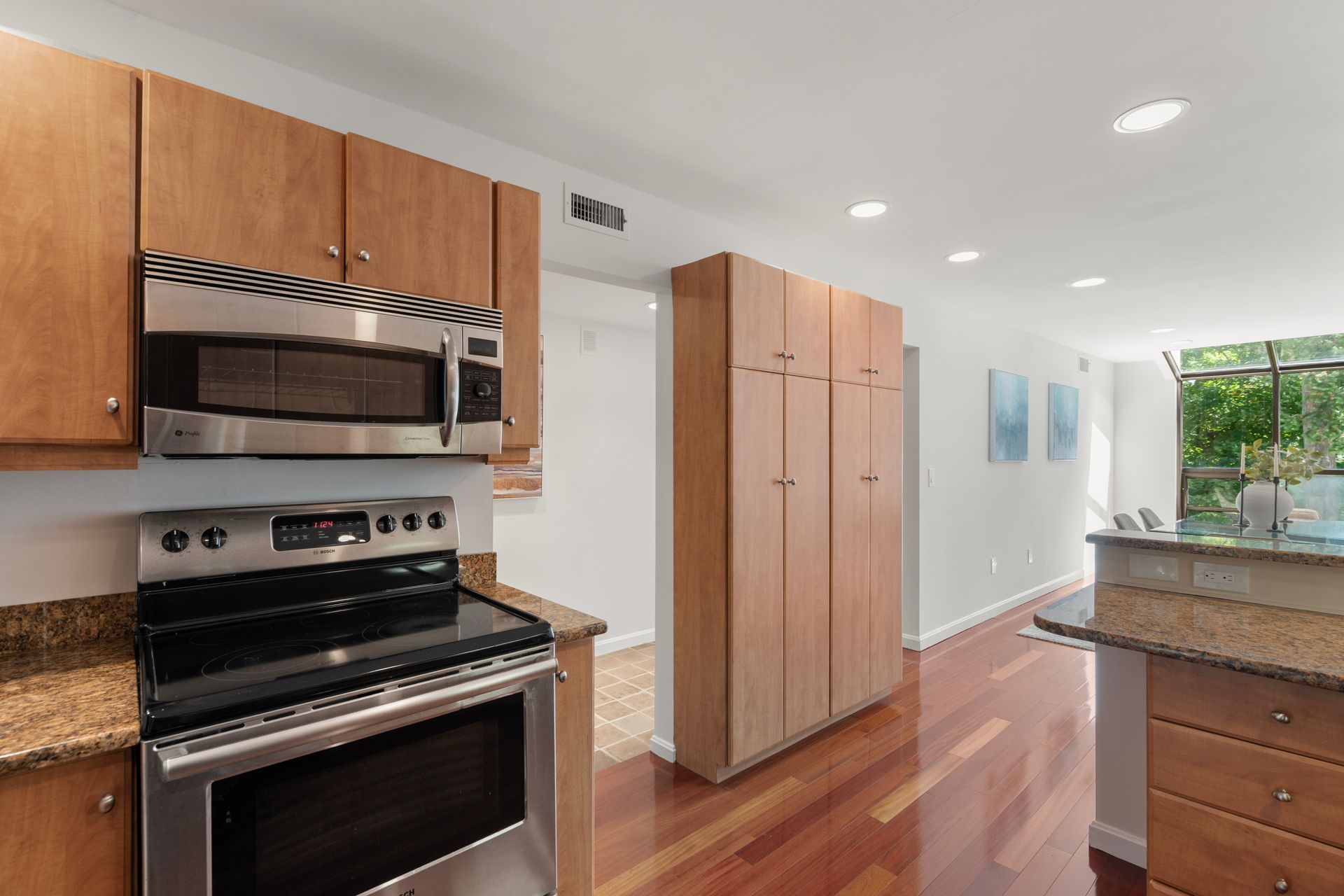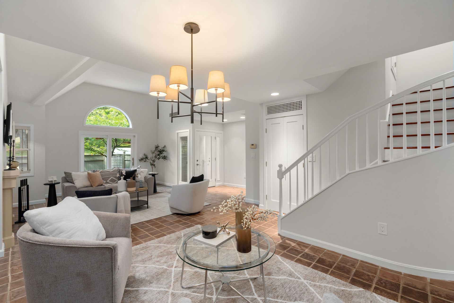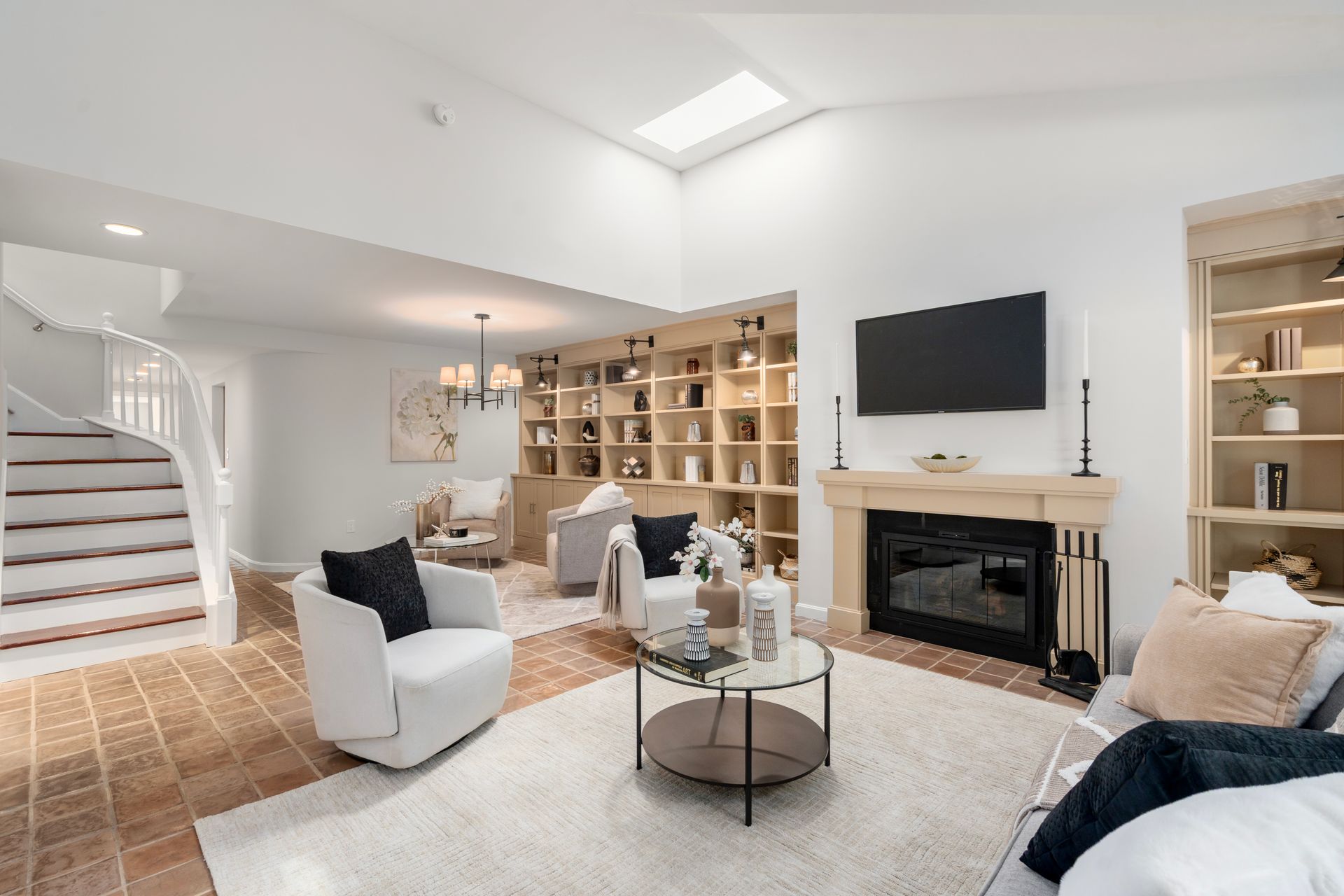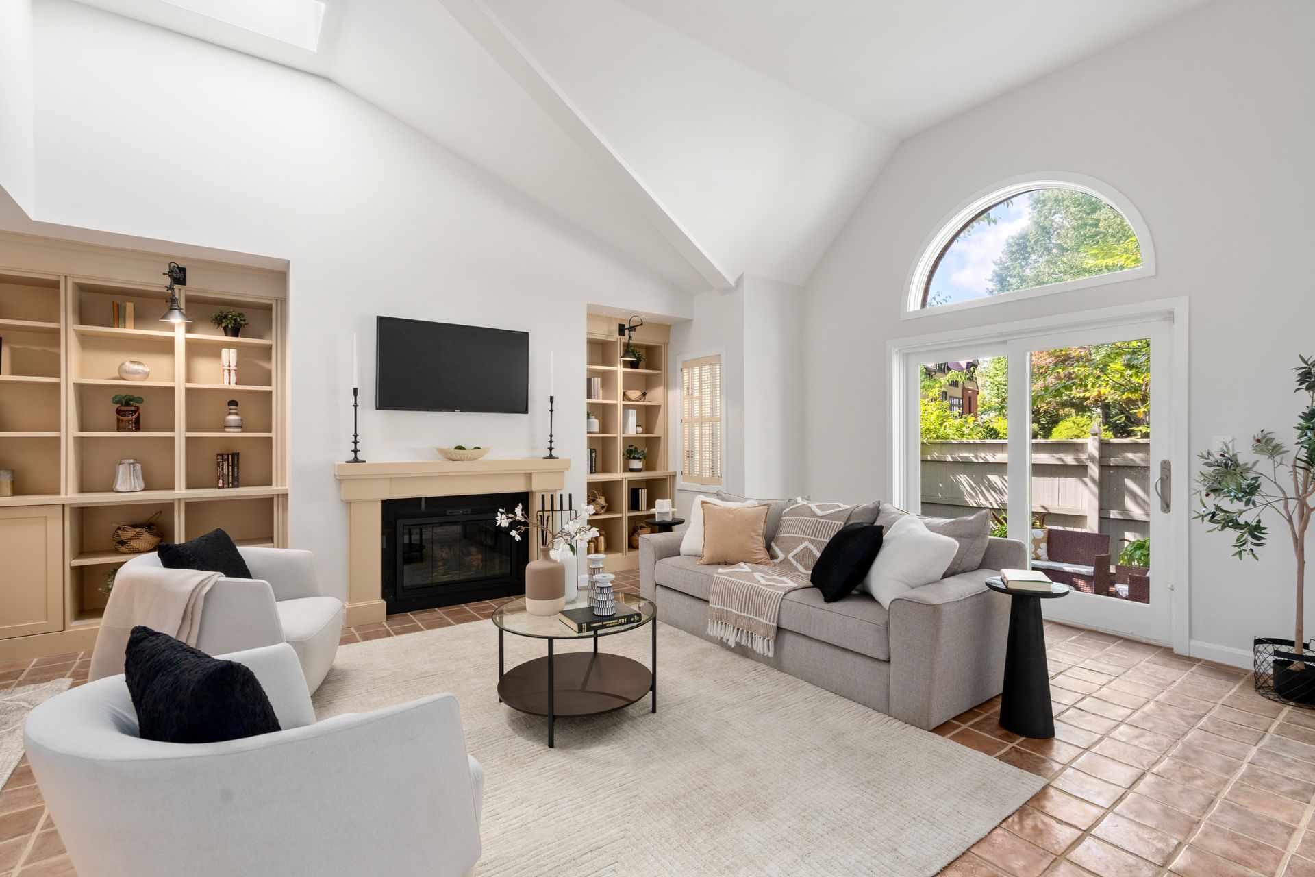 Enjoy seasonal skyline and treetop views from this spacious home at Fisher Hill Estates, a 13-acre landscaped community with pool and tennis courts. The foyer opens to a bright, versatile living space with open floor plan, vaulted ceiling with skylight, gas fireplace, custom built-ins, and sliders to a private patio. The updated kitchen offers a dining area with greenhouse windows. The oversized first-floor primary suite features a luxurious bathroom with double vanity, shower, radiant heated floors, walk-in closet, and built-in desk. Upstairs, two bedrooms open to a new (2025) deck, with full bathroom, large walk-in closet in hall, and laundry. Abundant built-ins, skylights, two-car, deeded garage parking with interior access, and storage room with cedar closet. Across from Brookline Reservoir Park, near Brookline Hills Green Line “D,” Route 9, Longwood Medical, Chestnut Hill, Brookline Village and Washington Square.