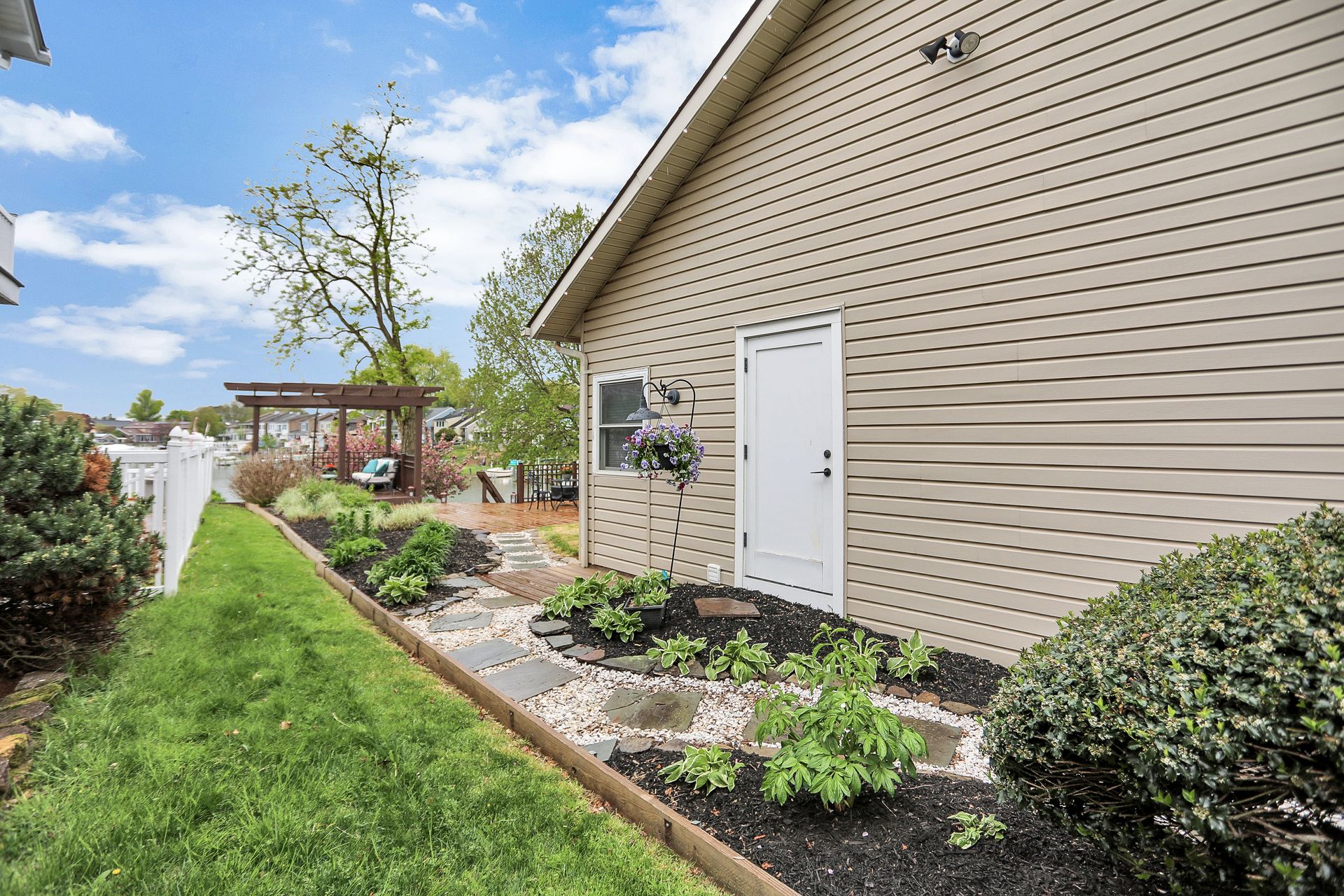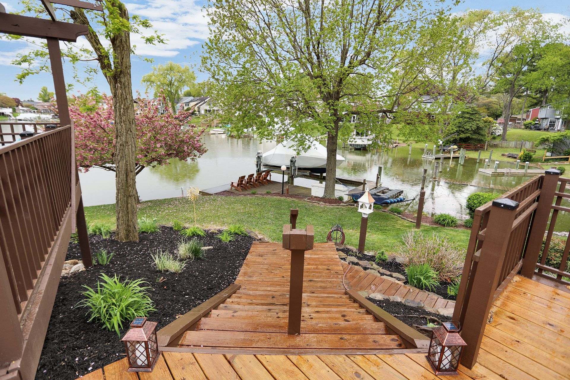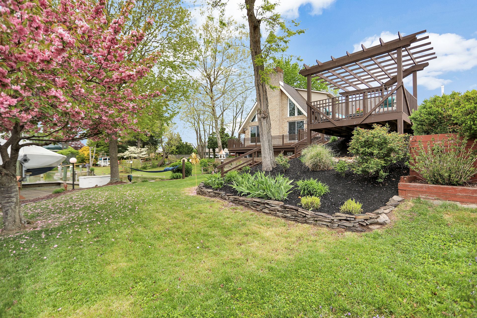 Outside note the additional parking pad and new retaining wall. Discover the meticulously landscaped exterior, where extensive hardscaping complements the lush greenery of the front and rear yards. The private multi-level deck invites you to unwind and soak in the stunning water views of Sandpiper Cove.
