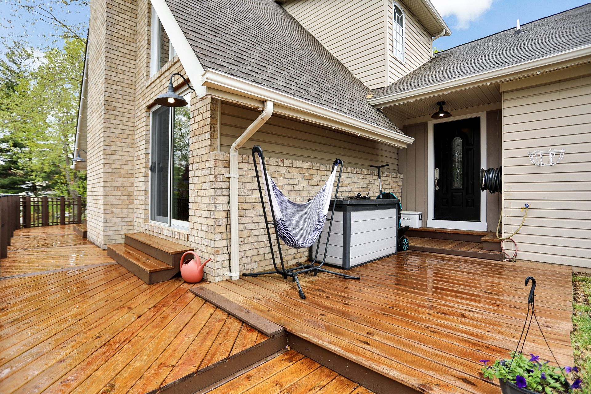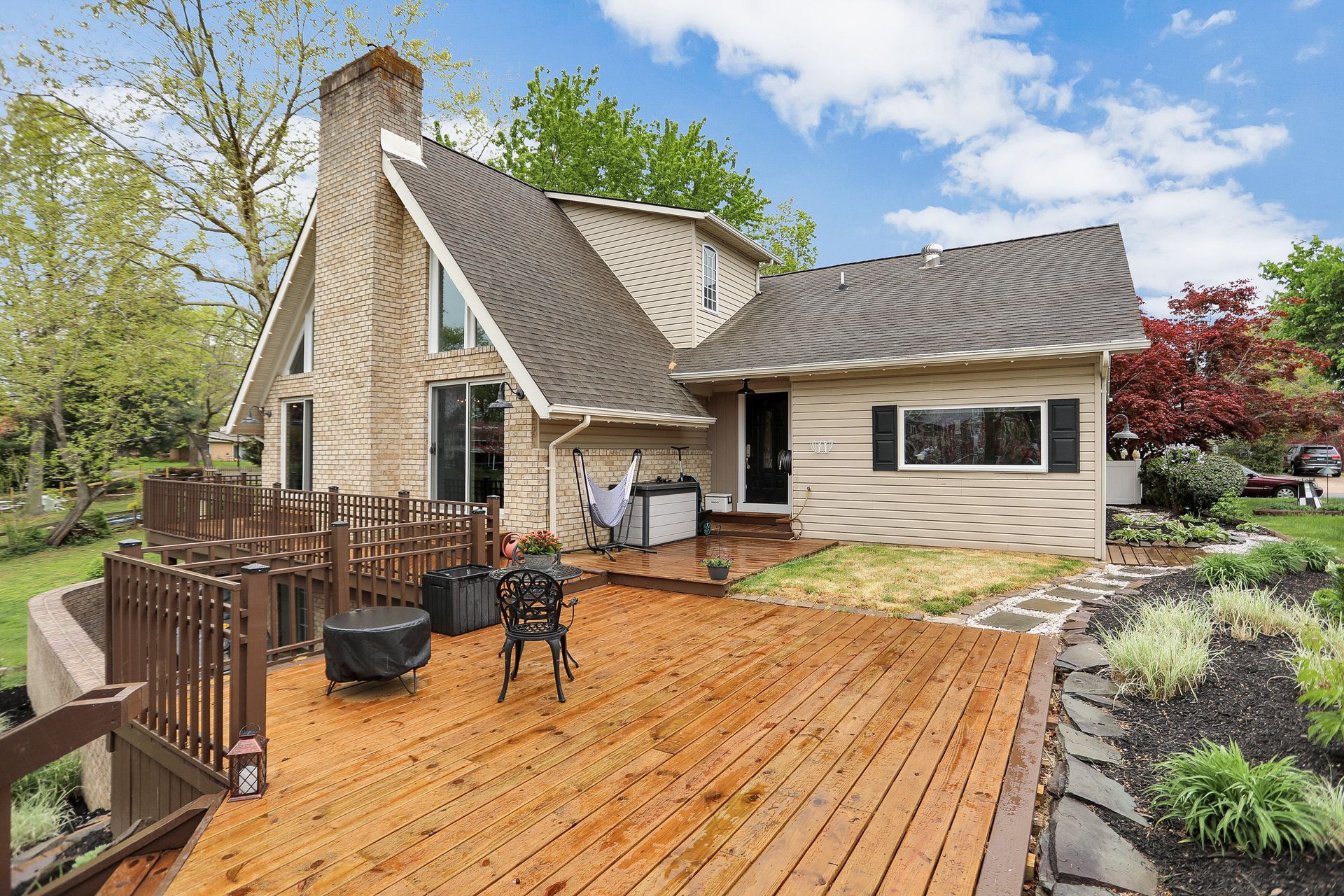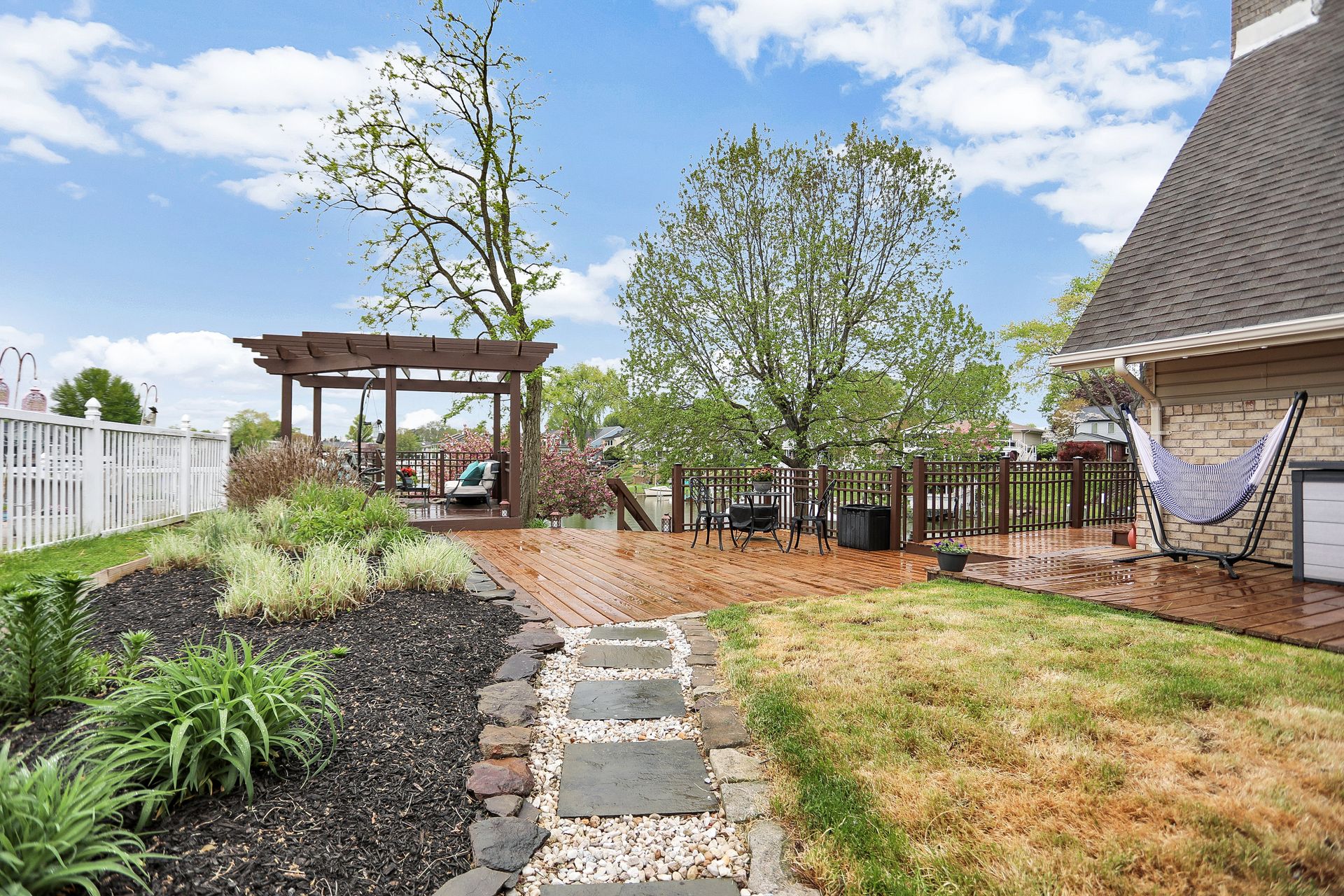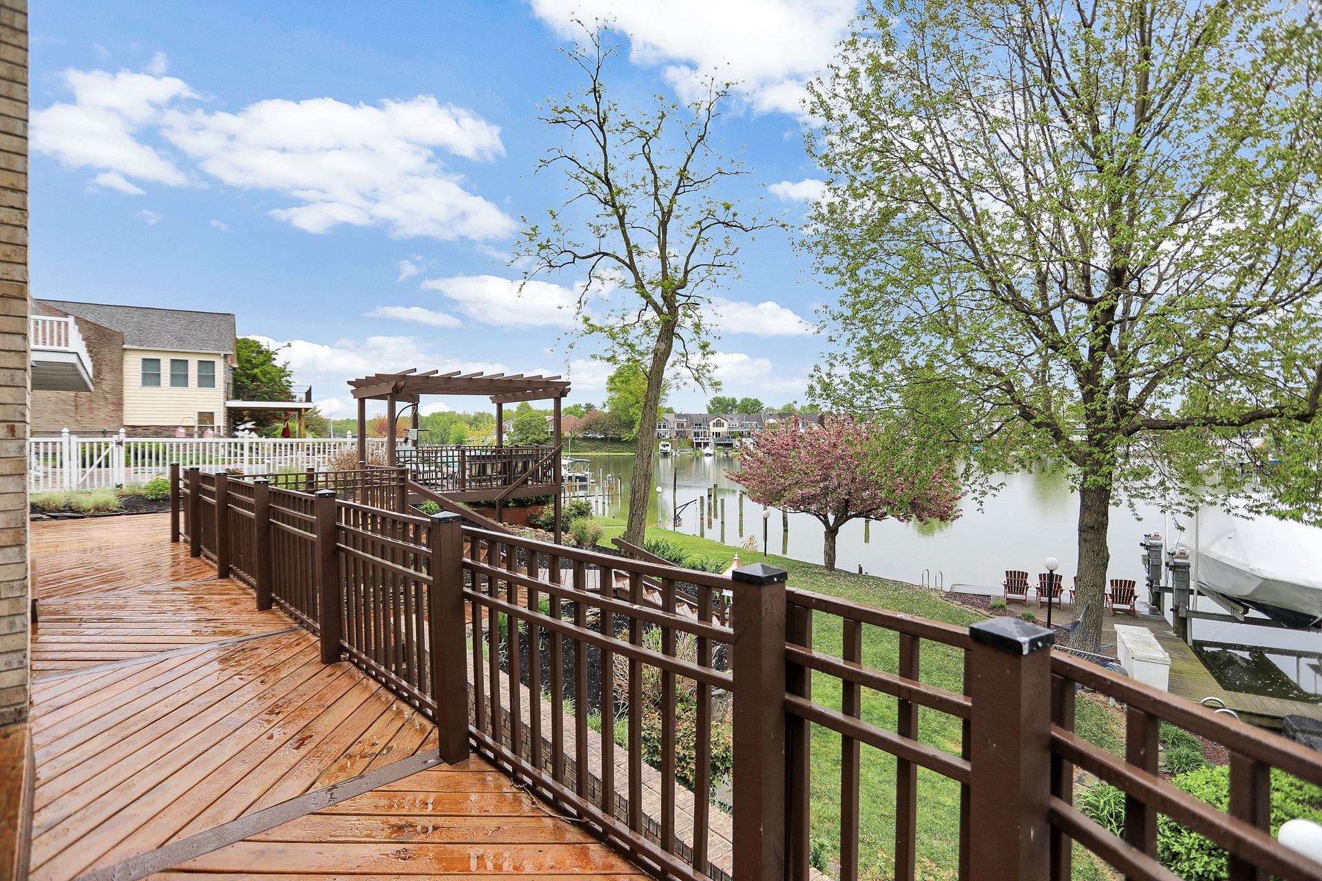 Outside note the additional parking pad and new retaining wall. Discover the meticulously landscaped exterior, where extensive hardscaping complements the lush greenery of the front and rear yards. The private multi-level deck invites you to unwind and soak in the stunning water views of Sandpiper Cove.