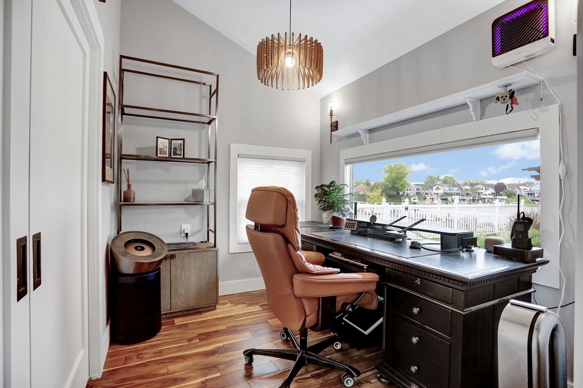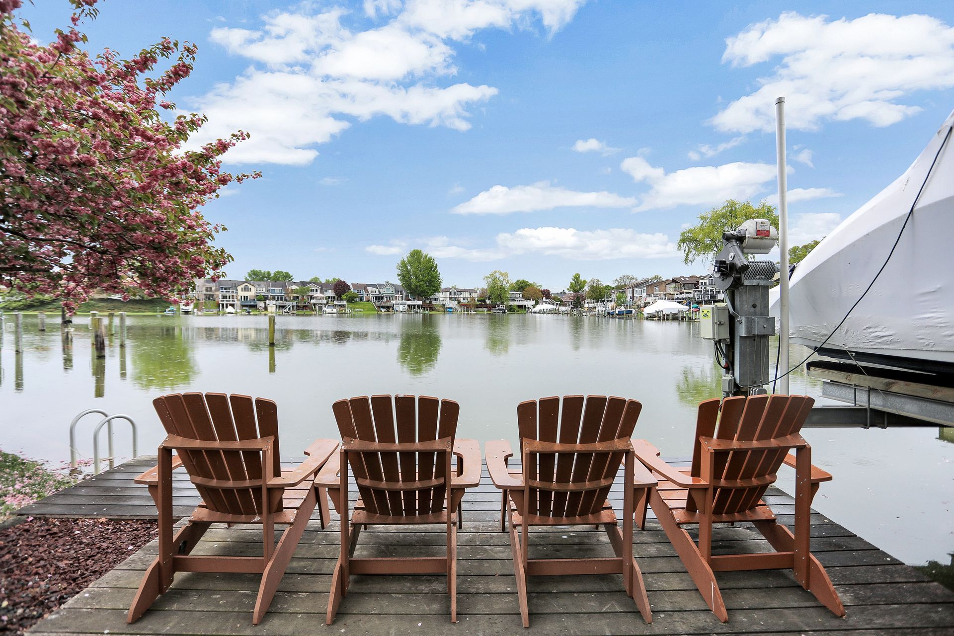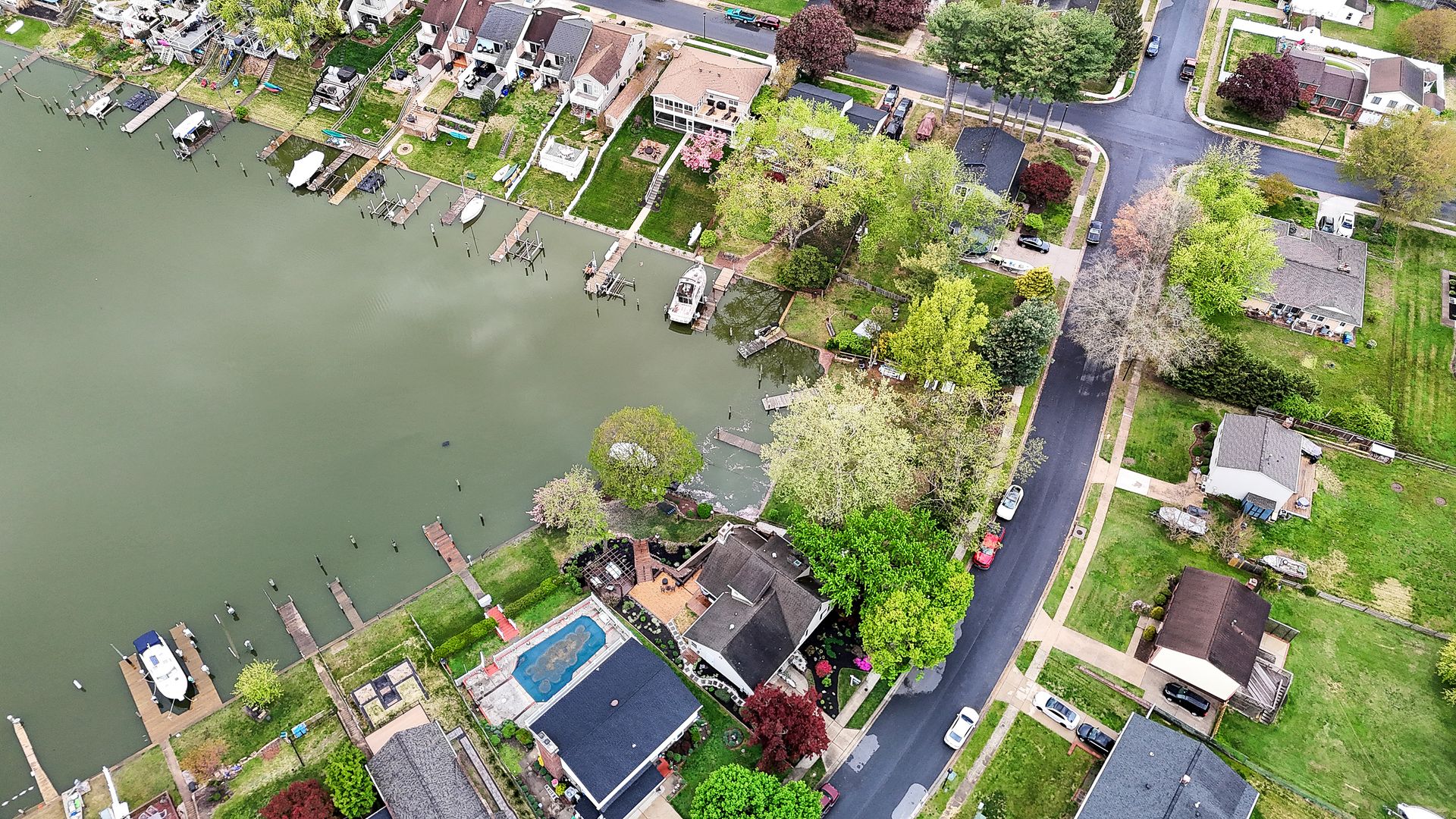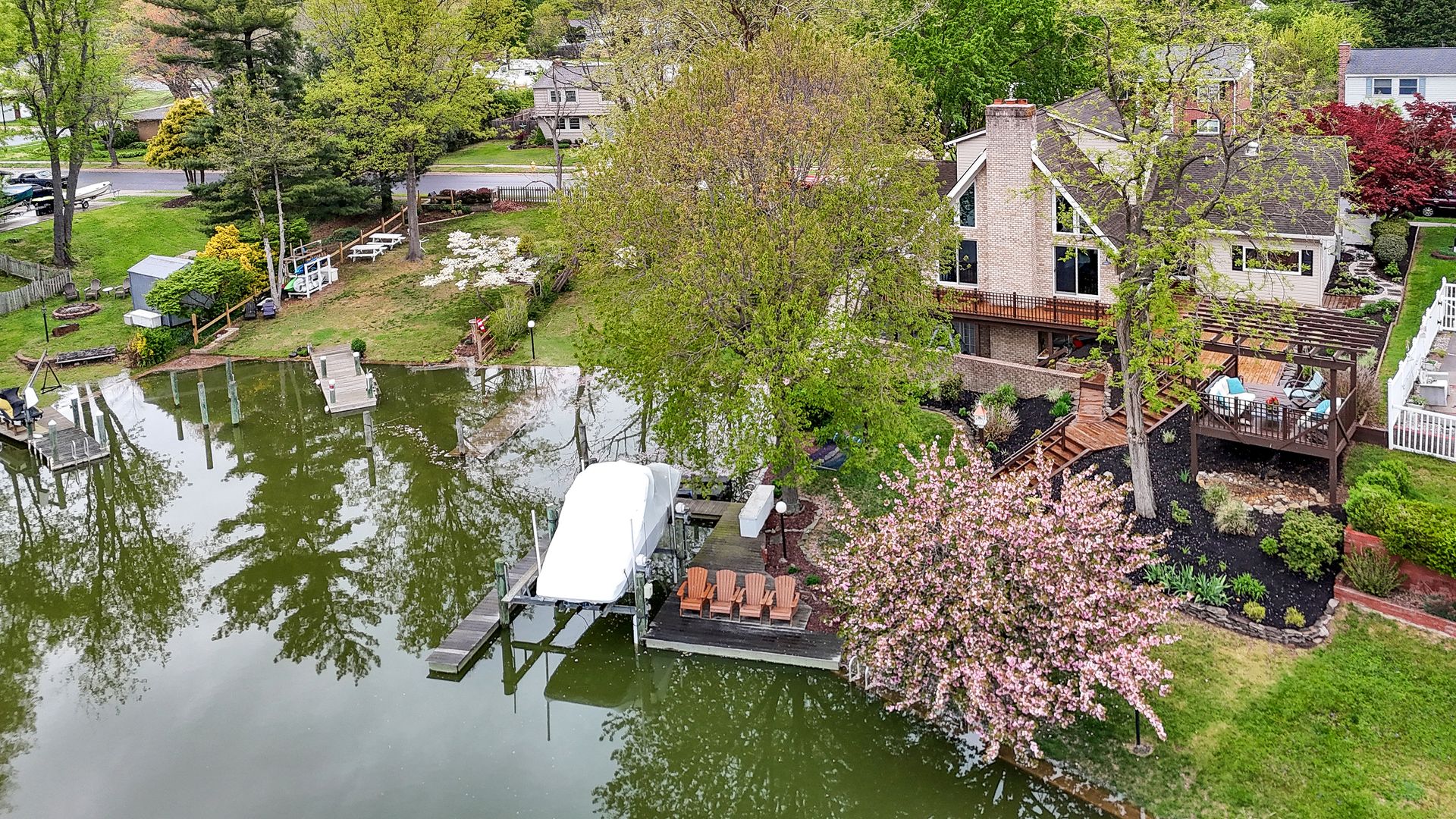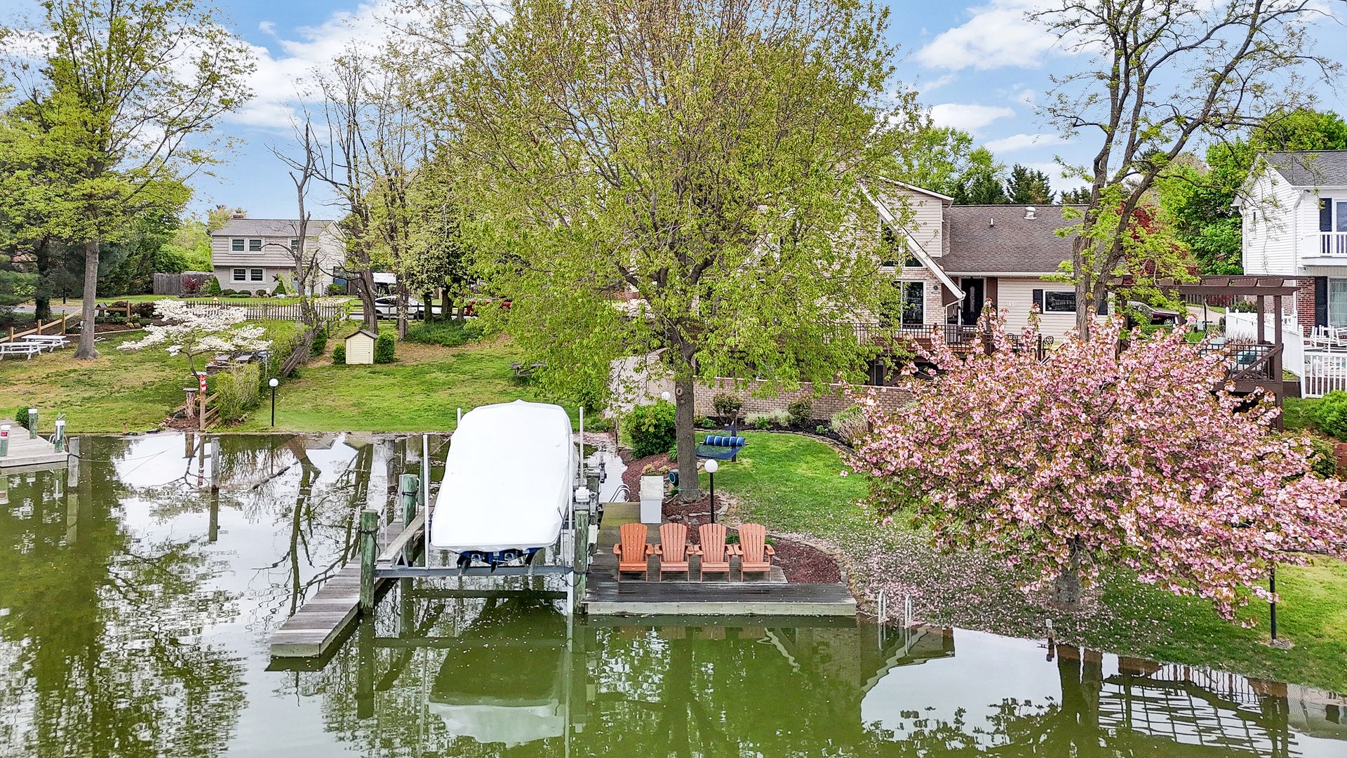 A capturing family room, adorned with a perfect waterfront view, atrium ceiling, industrial fan and a warm pellet stove is open to the gourmet, custom designed kitchen, with soapstone countertops, hand-made tile from Morocco, chef-grade appliances and countless custom finishes and conveniences. The dining room creates a quaint, sun-filled and welcoming atmosphere; enjoy the convenient main level office space with an inspiring view and near silent laundry area with adjacent half bath. This waterfront home affords four bedrooms; on the main level, a luxurious primary suite complete with a walk-in closet and the supreme essence of a spa bathroom.