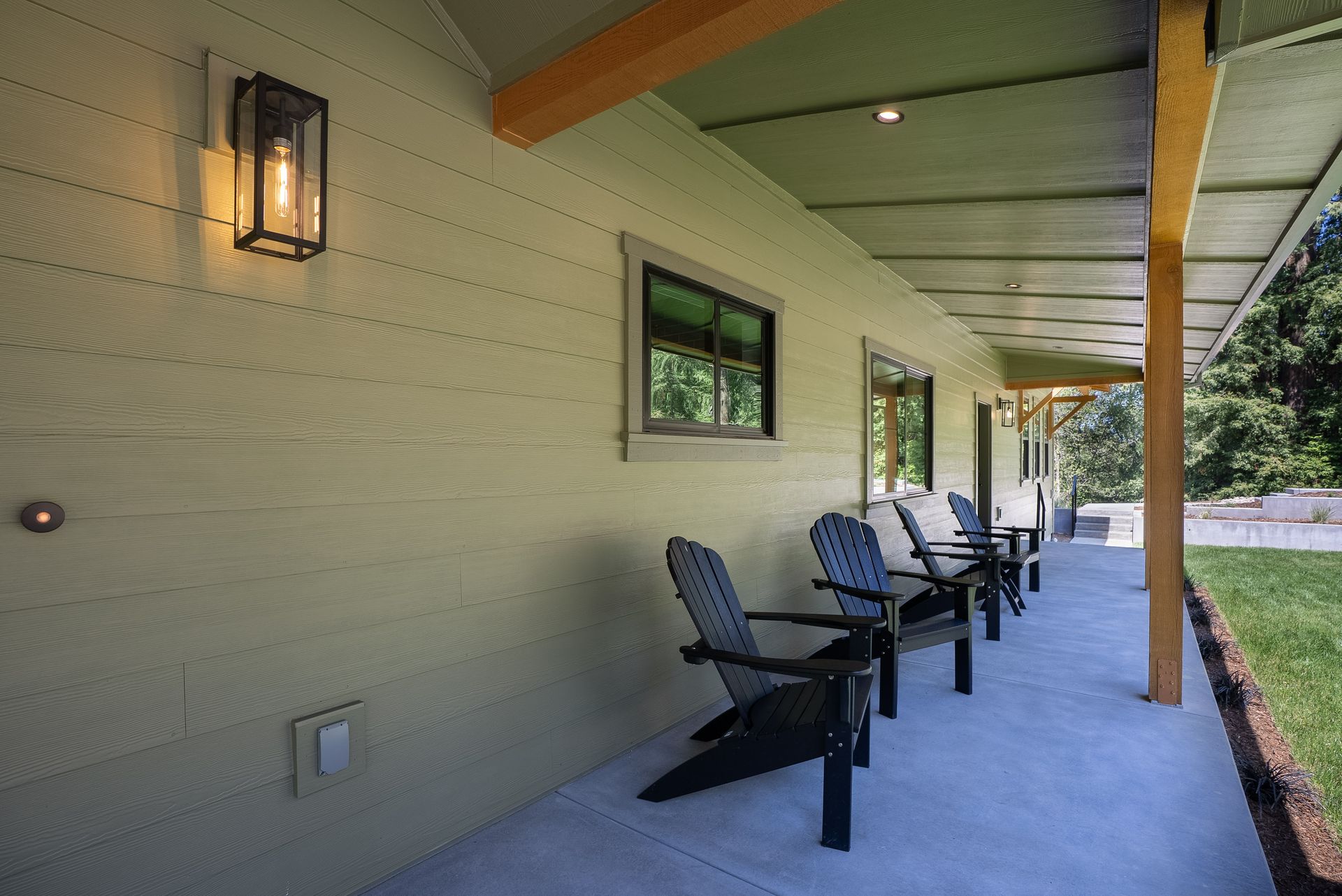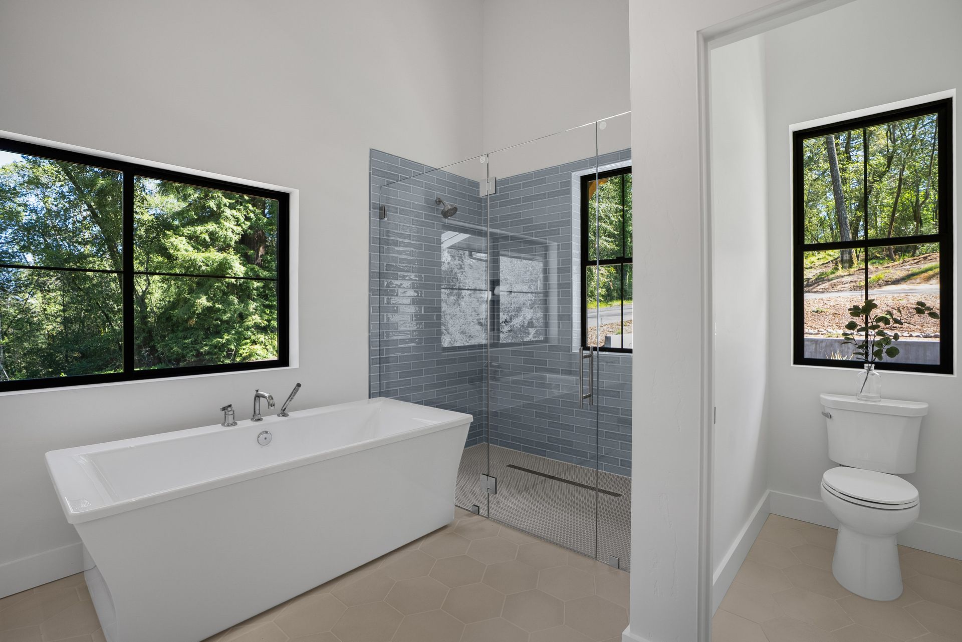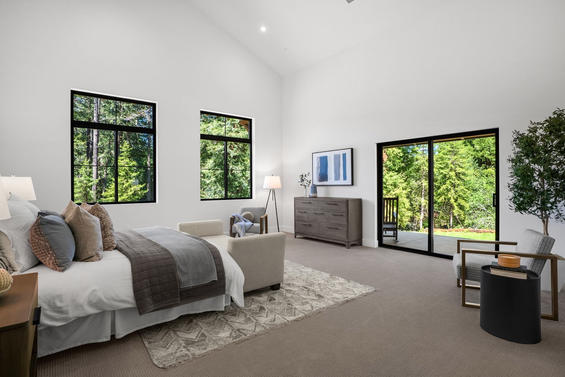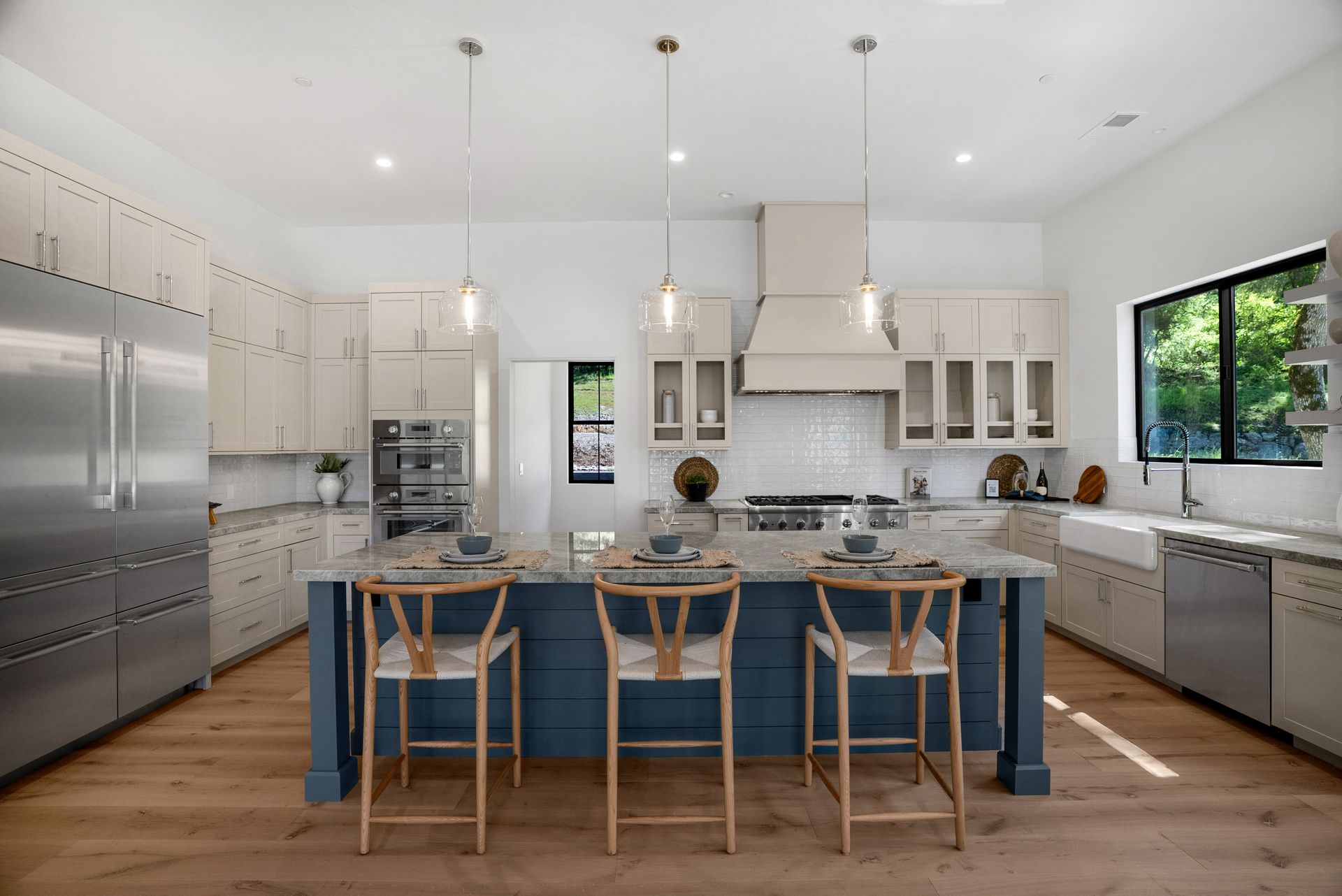 Contemporary craftsman estate on 2 private view acres in Sebastopol's scenic countryside offering single-level living with luxury finishes, abundant natural light, and seamless indoor-outdoor flow. 3BD + office, 3.5BA home features an open-concept great room with engineered wood floors, gas fireplace with stone surround, and large sliding doors opening to an expansive view deck. Chef's kitchen includes quartzite slab countertops, farmhouse sink, undercabinet lighting, premium Thermador appliances, and a walk-in pantry with sink, cabinetry, and windows. Primary suite retreat with vaulted ceilings (14-21 ft), private patio access, and serene views. Spa-inspired bath with freestanding soaking tub, curbless walk-in shower, dual vanities, walk-in closet, and separate water closet. Two additional ensuite bedrooms with walk-in closets plus a dedicated office with beautiful natural light. Additional features include elegant powder room, laundry room with exterior access, sink and quartzite counters, engineered wood flooring, and thoughtful modern design throughout. Unconditioned lower level with plumbing and electrical in place offers potential for additional dwelling unit, guest suite, or studio. 5 bedroom septic installed and ready for 2 bedroom ADU. Terraced landscaping with irrigation and lighting, open meadow, shared well with 5,000-gallon holding tank, solar panels, and 6-car garage. Private, peaceful setting just minutes from downtown Sebastopol and the Sonoma Coast.