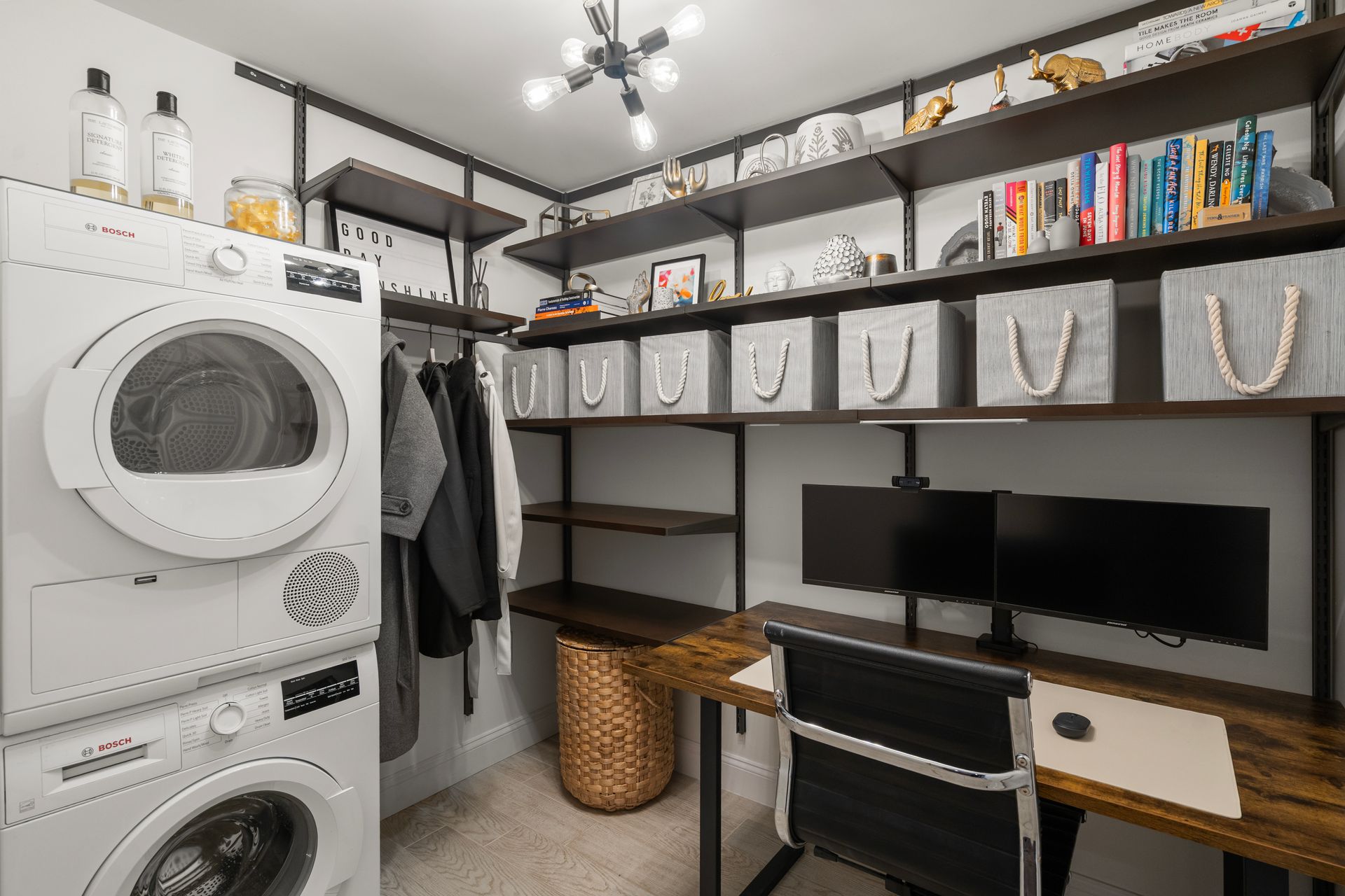Cozy two-bedroom condo, with high ceilings, and an open-concept layout that enhances the natural light throughout. Enjoy fresh paint and a recently renovated bathroom. Both bedrooms include custom closet organizer systems for optimal storage. The oversized in-unit laundry area offers flexibility—perfect as a home office, study nook, or extra storage space. Step outside to your private patio, nestled along a picturesque, tree-lined street, ideal for relaxing or entertaining.