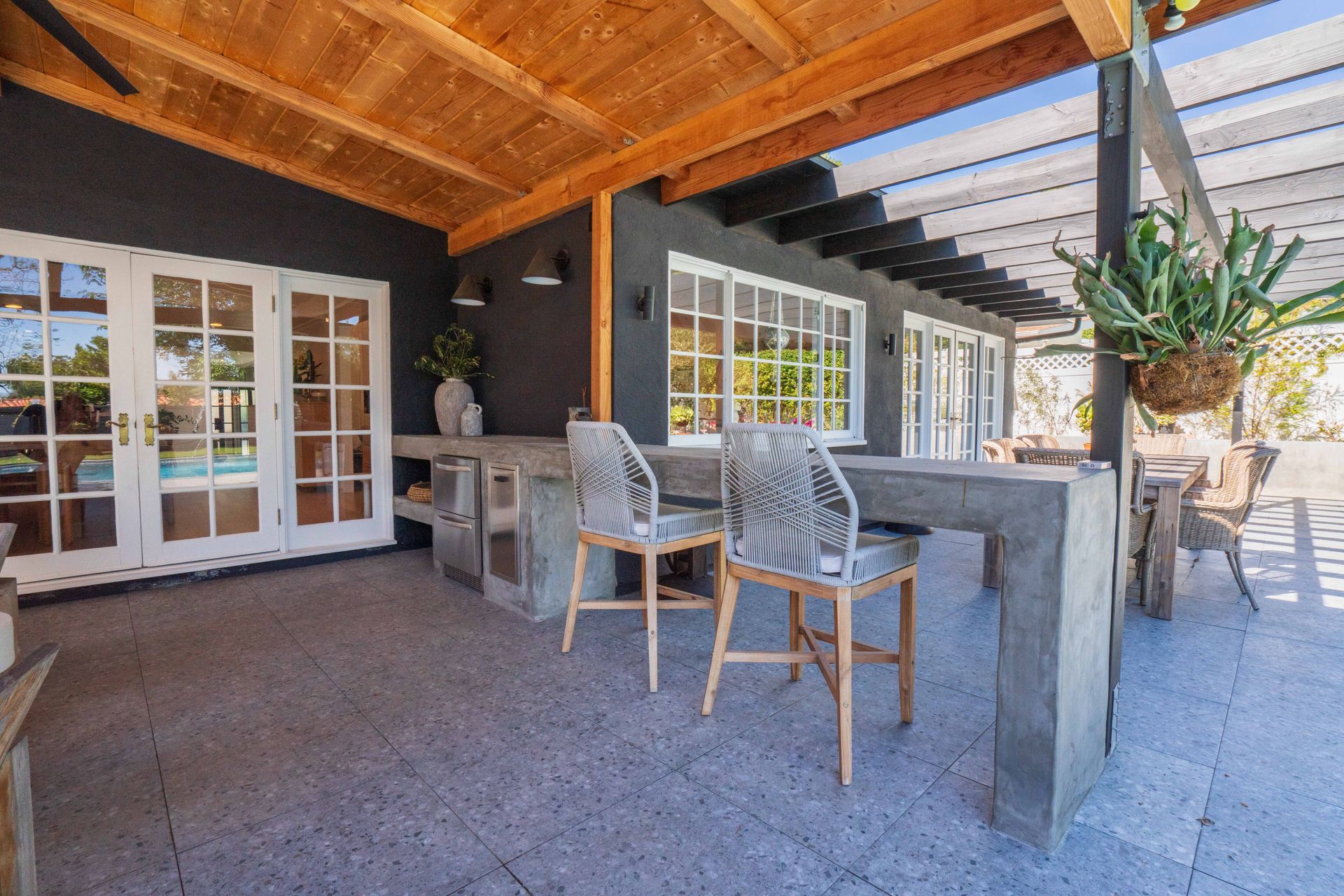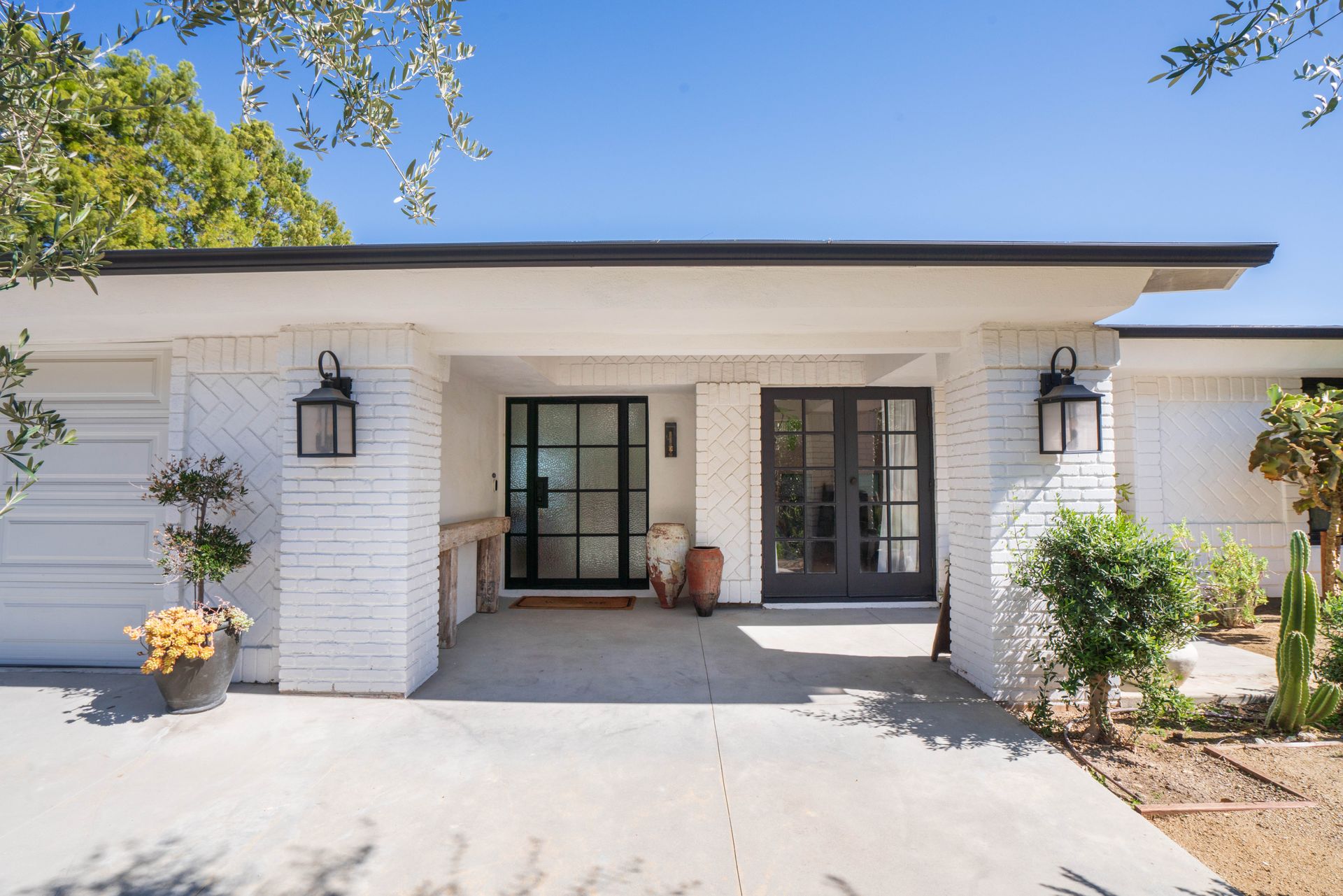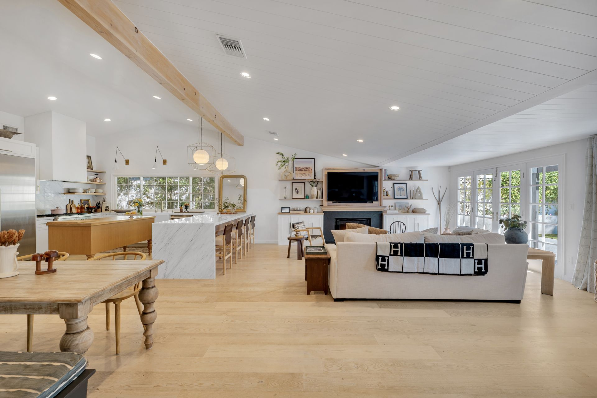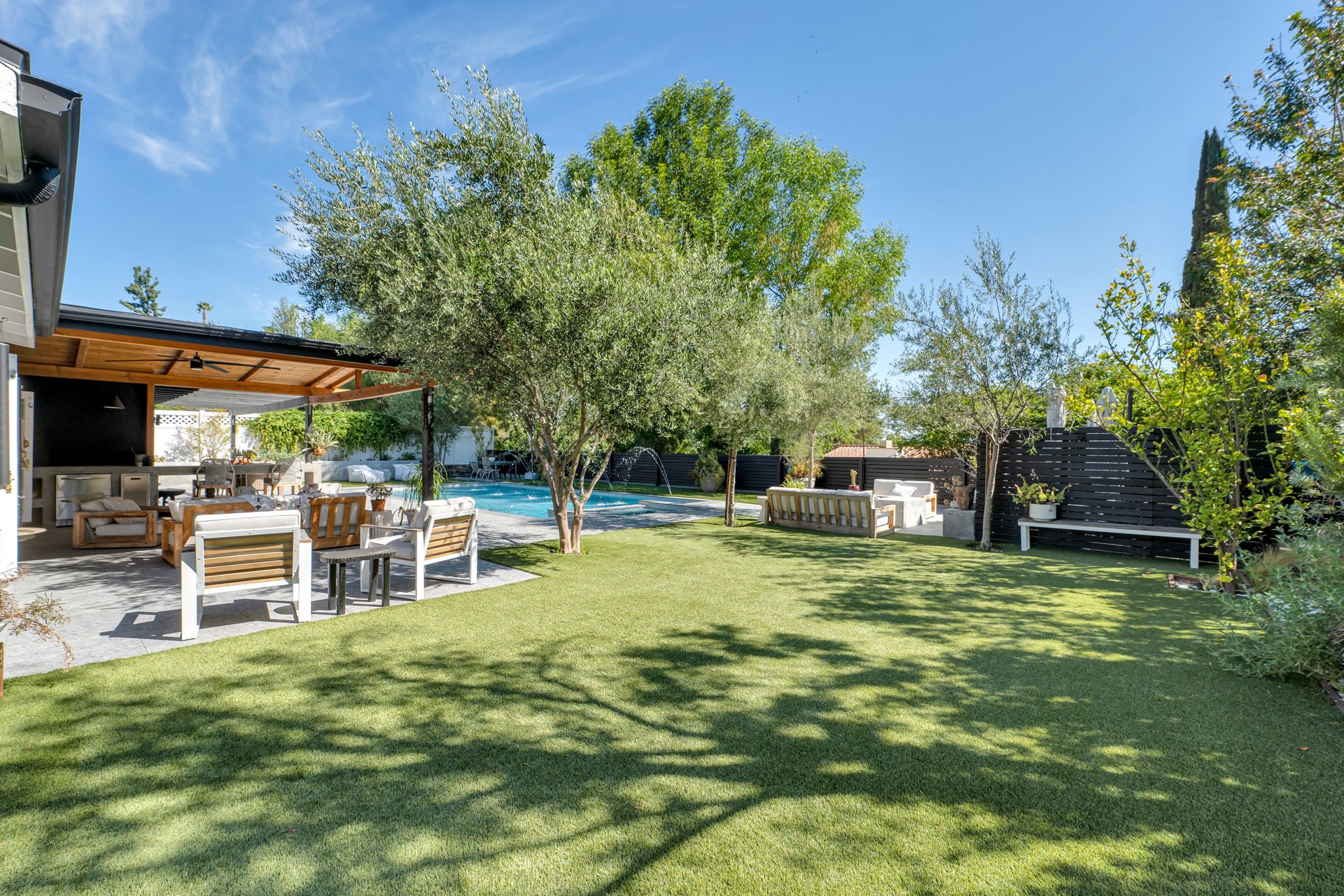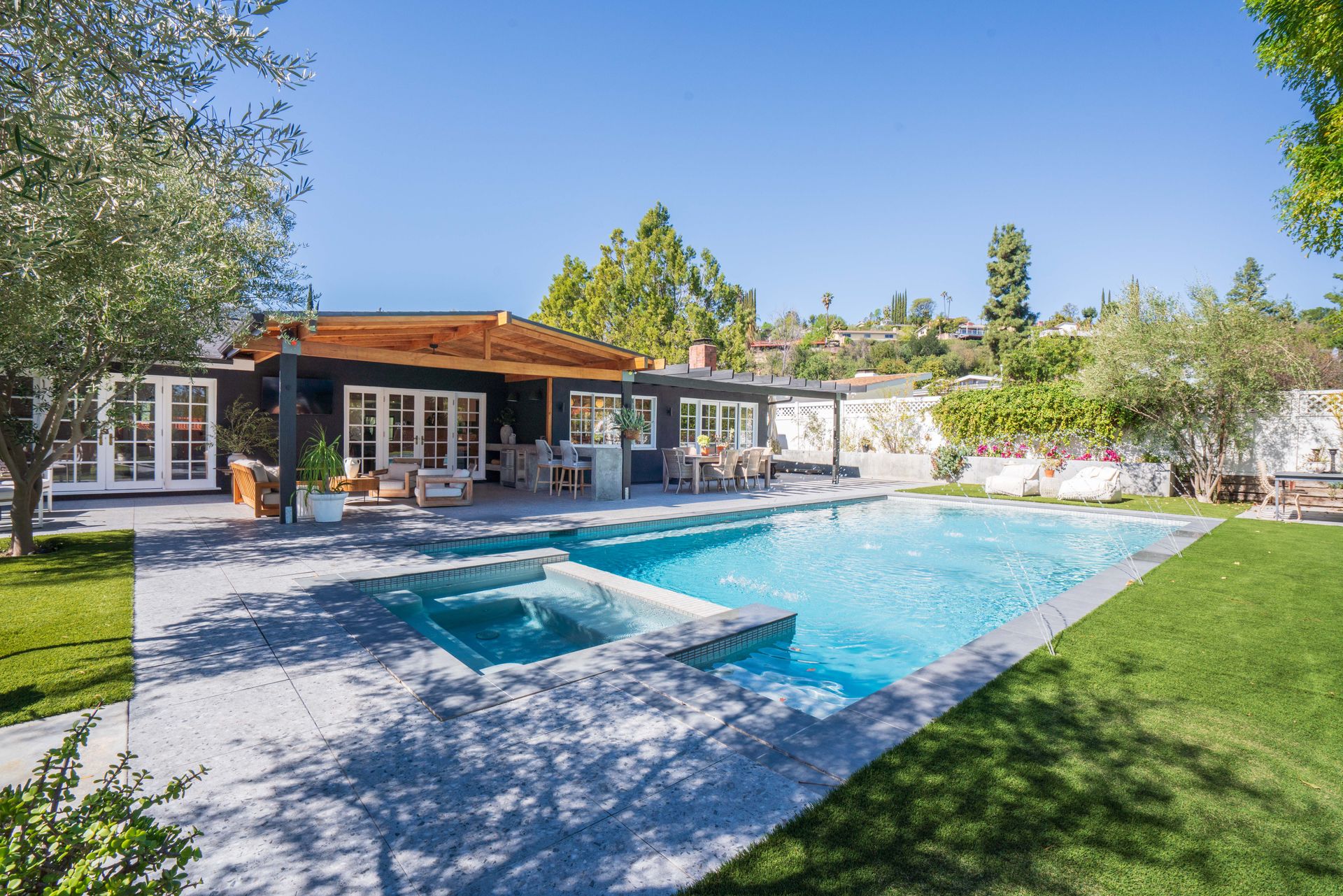 The primary suite features a walk-in closet plus an additional floor-to-ceiling closet space and French doors looking at the backyard. Its en-suite bathroom boasts double sinks and a stunning marble shower. The additional bedrooms are generously sized, each offering ample closet space. One bedroom features a custom-built bunk bed. At the heart of the home, the open-concept kitchen is a chef’s dream. Designed with soaring ceilings, an exposed beam, and custom cabinetry adorned with unlacquered brass handles, this space is both elegant and practical. Premium Thermador appliances, including a six-burner stove, extensive counter space, a custom wood center island, and an inviting eat-in kitchen area. The kitchen seamlessly flows into the great room, featuring a custom fireplace surround, built-in dry bar, and French doors that open to the backyard—creating a warm and inviting atmosphere. Venture outside into your private backyard retreat, where a sparkling pool with water jets, a relaxing spa, and a cozy firepit await. Multiple seating areas, a covered patio designed for outdoor dining and relaxing, and drought-tolerant landscaping—including stunning olive trees—make this space low-maintenance. This lovely backyard comes complete with an inspiring art studio and a welcoming craft corner. A rare blend of mid-century charm and modern luxury that must be seen to be fully appreciated.