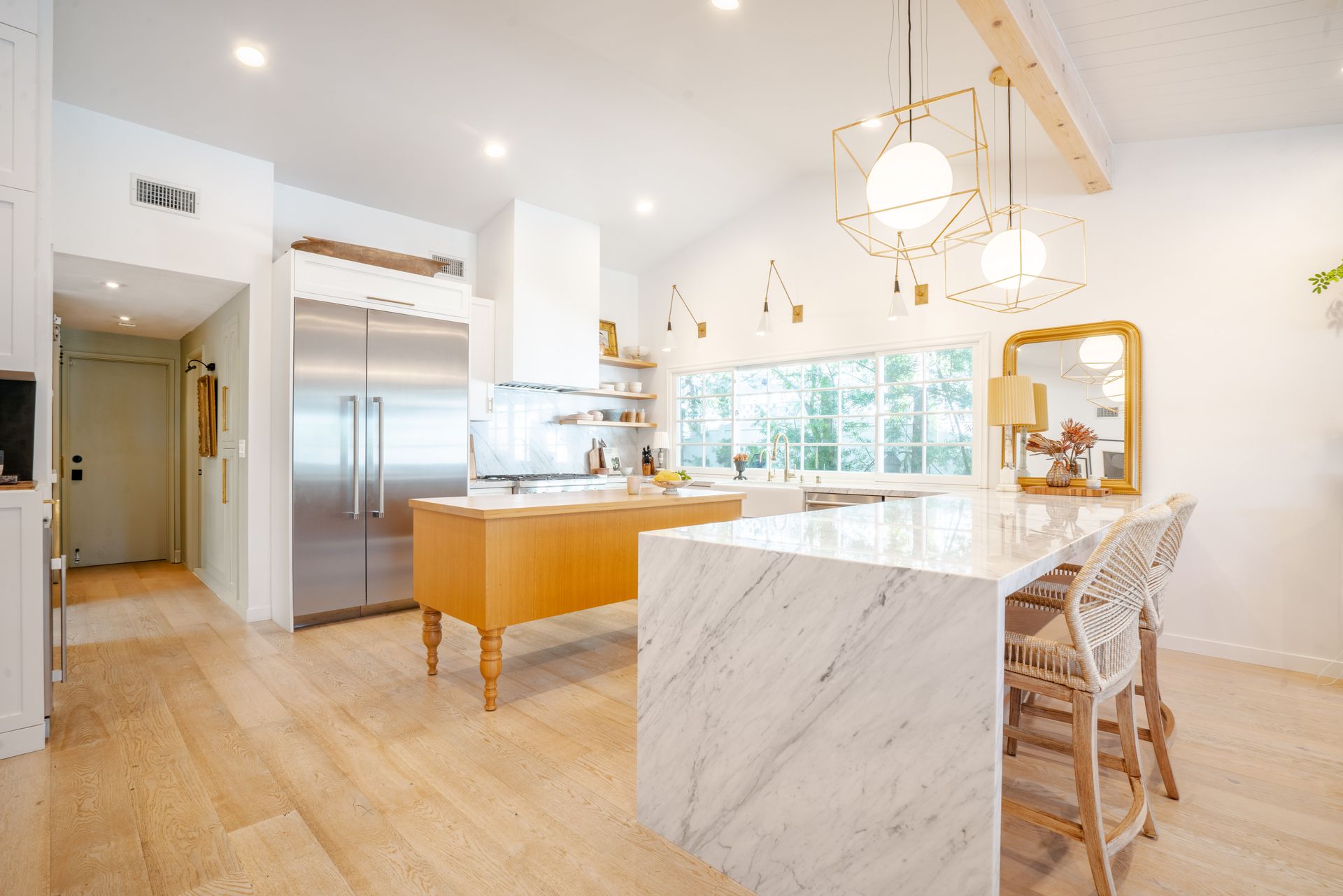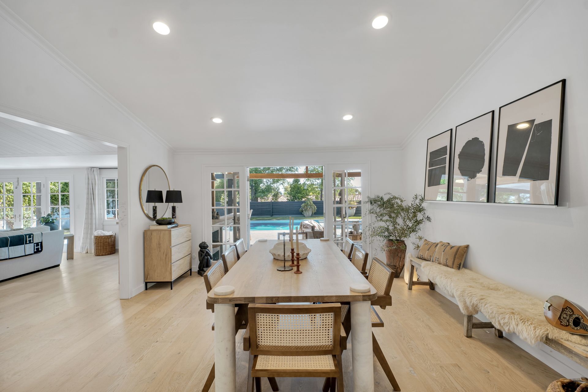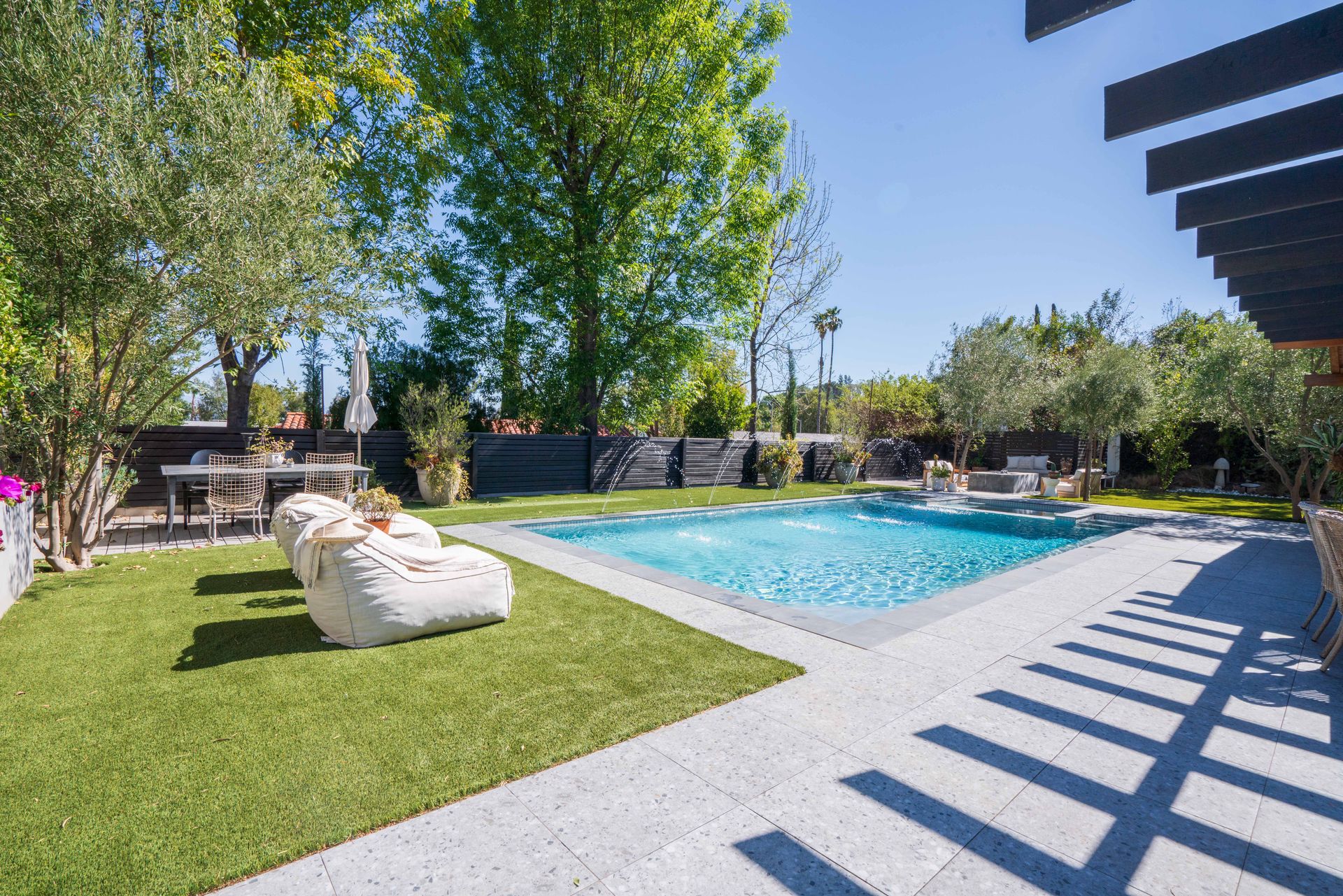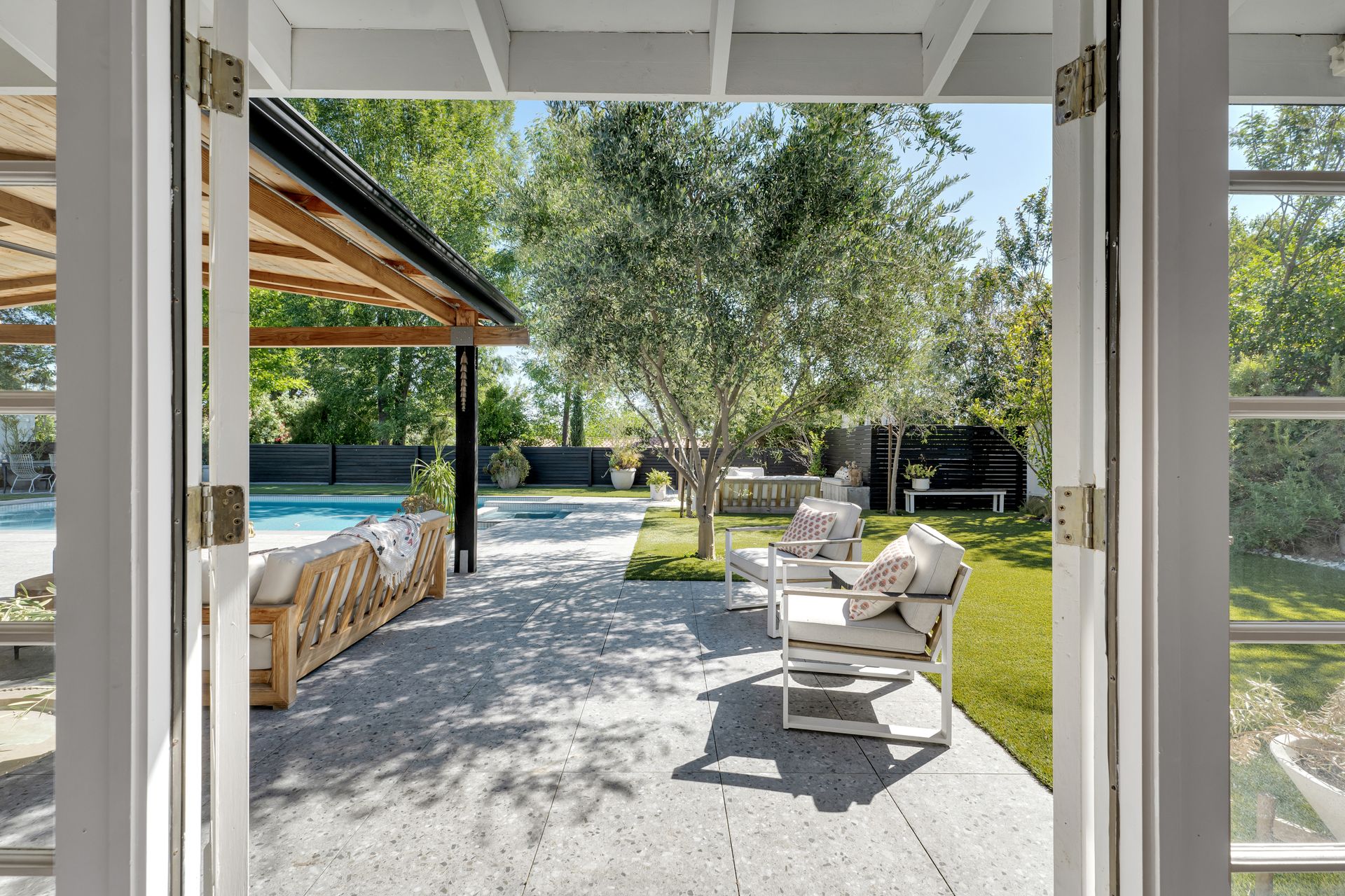 The primary suite features a walk-in closet plus an additional floor-to-ceiling closet space and French doors looking at the backyard. Its en-suite bathroom boasts double sinks and a stunning marble shower. The additional bedrooms are generously sized, each offering ample closet space. One bedroom features a custom-built bunk bed. At the heart of the home, the open-concept kitchen is a chef’s dream. Designed with soaring ceilings, an exposed beam, and custom cabinetry adorned with unlacquered brass handles, this space is both elegant and practical. Premium Thermador appliances, including a six-burner stove, extensive counter space, a custom wood center island, and an inviting eat-in kitchen area. The kitchen seamlessly flows into the great room, featuring a custom fireplace surround, built-in dry bar, and French doors that open to the backyard—creating a warm and inviting atmosphere. Venture outside into your private backyard retreat, where a sparkling pool with water jets, a relaxing spa, and a cozy firepit await. Multiple seating areas, a covered patio designed for outdoor dining and relaxing, and drought-tolerant landscaping—including stunning olive trees—make this space low-maintenance. This lovely backyard comes complete with an inspiring art studio and a welcoming craft corner. A rare blend of mid-century charm and modern luxury that must be seen to be fully appreciated.