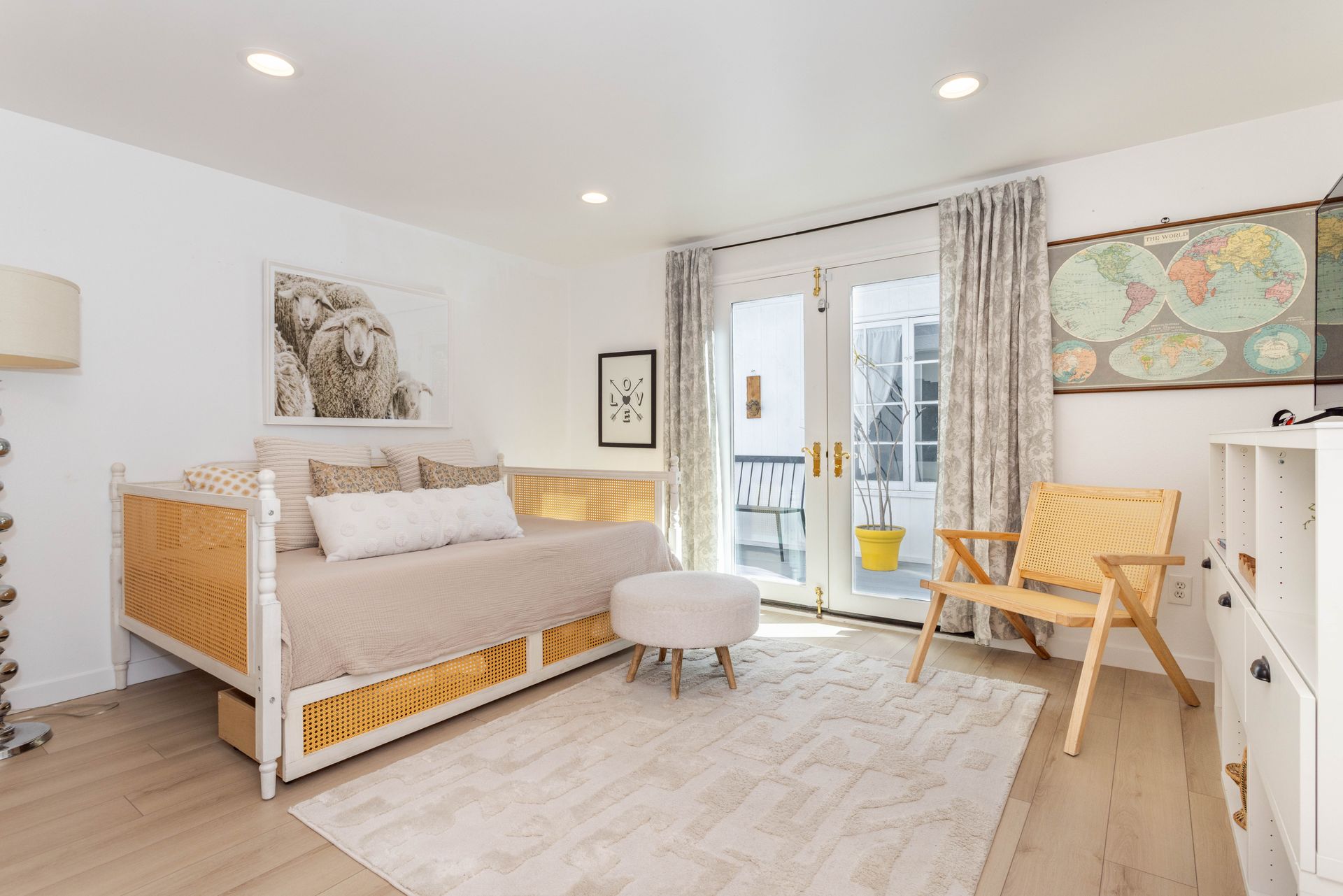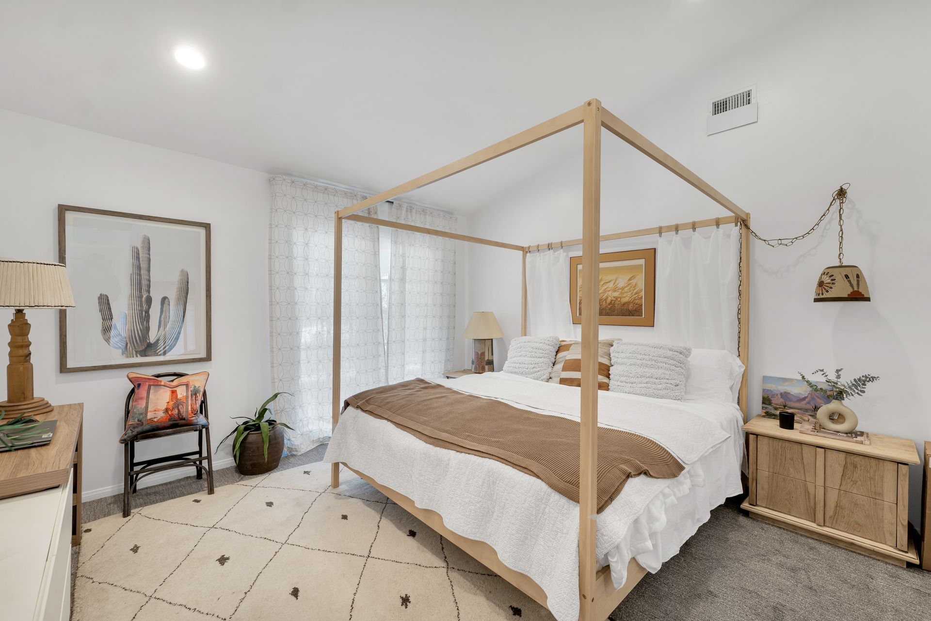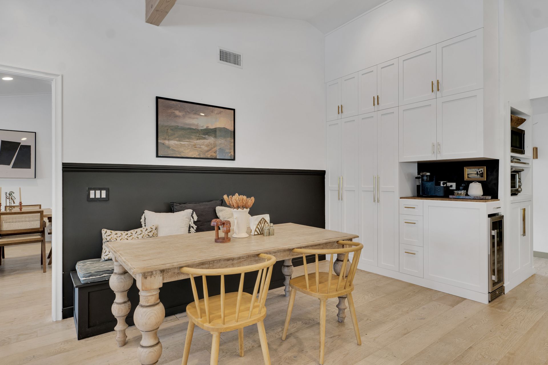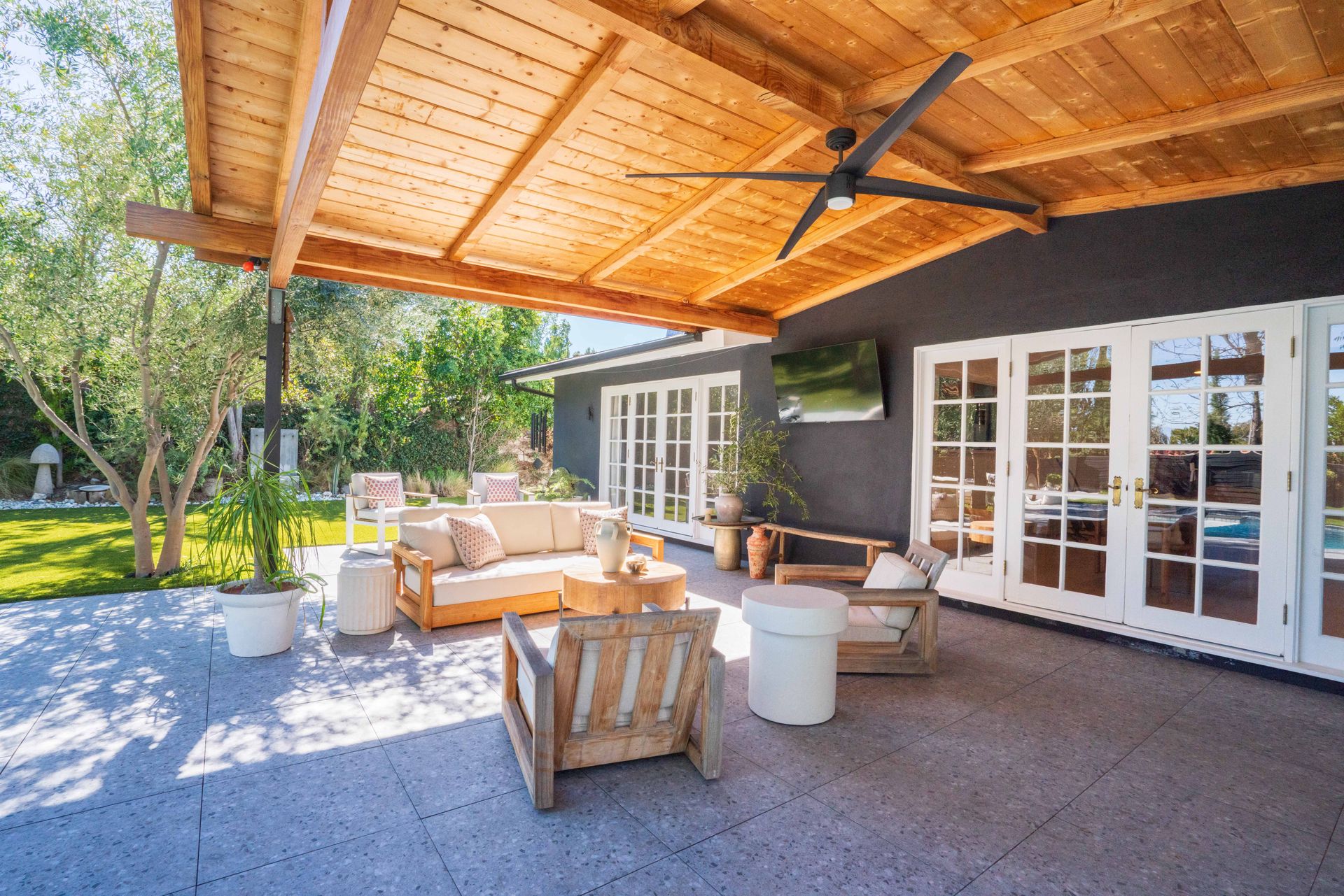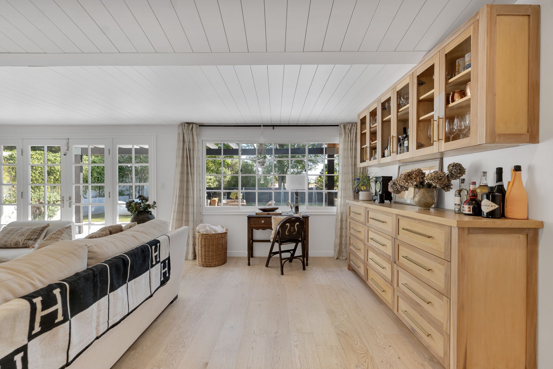 The primary suite features a walk-in closet plus an additional floor-to-ceiling closet space and French doors looking at the backyard. Its en-suite bathroom boasts double sinks and a stunning marble shower. The additional bedrooms are generously sized, each offering ample closet space. One bedroom features a custom-built bunk bed. At the heart of the home, the open-concept kitchen is a chef’s dream. Designed with soaring ceilings, an exposed beam, and custom cabinetry adorned with unlacquered brass handles, this space is both elegant and practical. Premium Thermador appliances, including a six-burner stove, extensive counter space, a custom wood center island, and an inviting eat-in kitchen area. The kitchen seamlessly flows into the great room, featuring a custom fireplace surround, built-in dry bar, and French doors that open to the backyard—creating a warm and inviting atmosphere. Venture outside into your private backyard retreat, where a sparkling pool with water jets, a relaxing spa, and a cozy firepit await. Multiple seating areas, a covered patio designed for outdoor dining and relaxing, and drought-tolerant landscaping—including stunning olive trees—make this space low-maintenance. This lovely backyard comes complete with an inspiring art studio and a welcoming craft corner. A rare blend of mid-century charm and modern luxury that must be seen to be fully appreciated.
