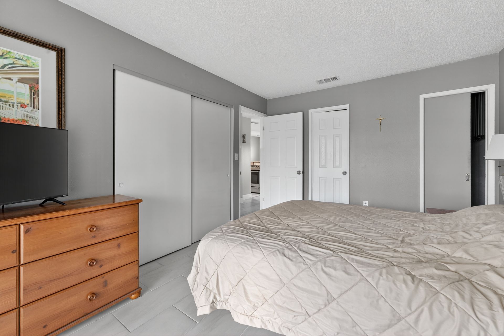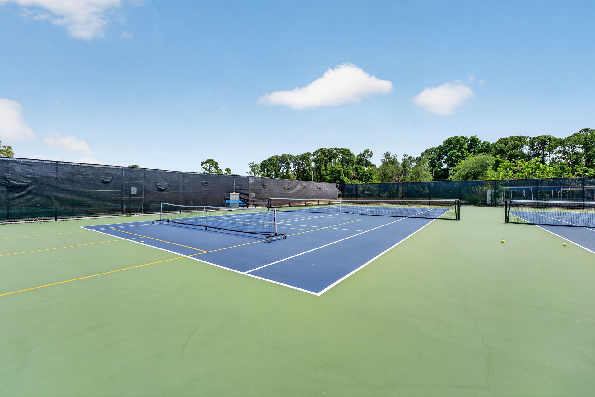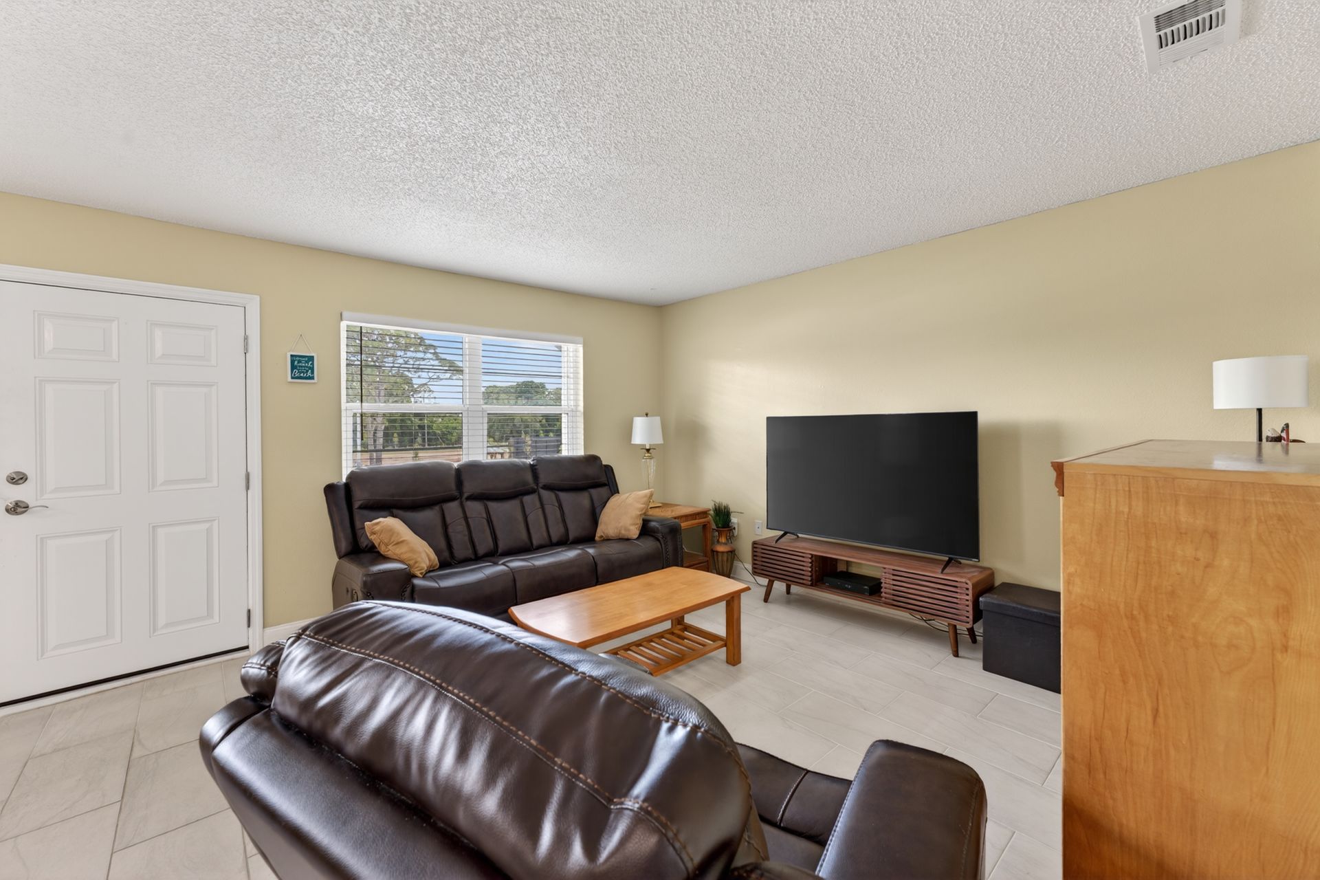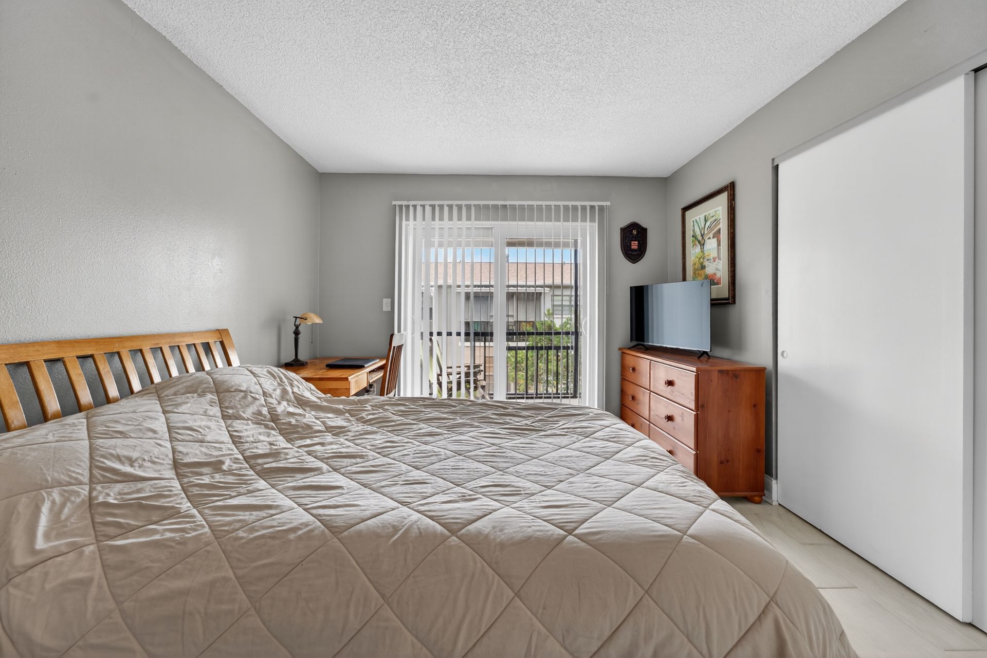 The primary suite features a walk-in closet, updated bath, and direct access to a screened lanai, creating a private, quiet retreat. The second bedroom adapts easily for guests or a home office.