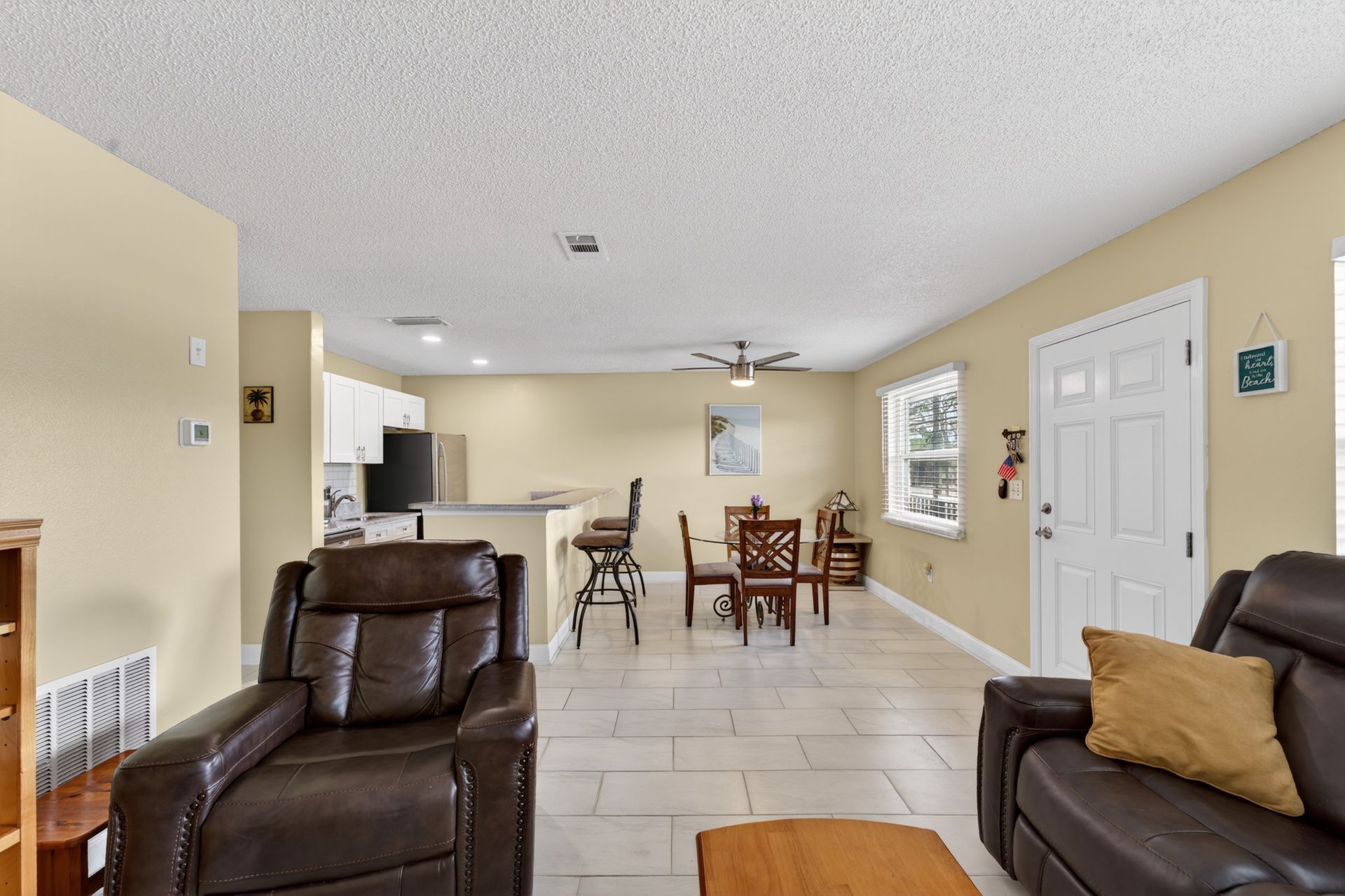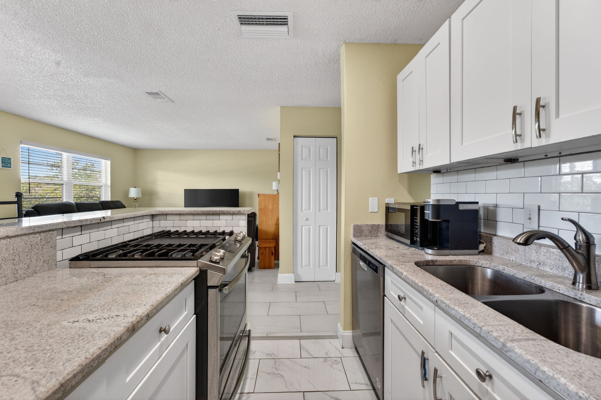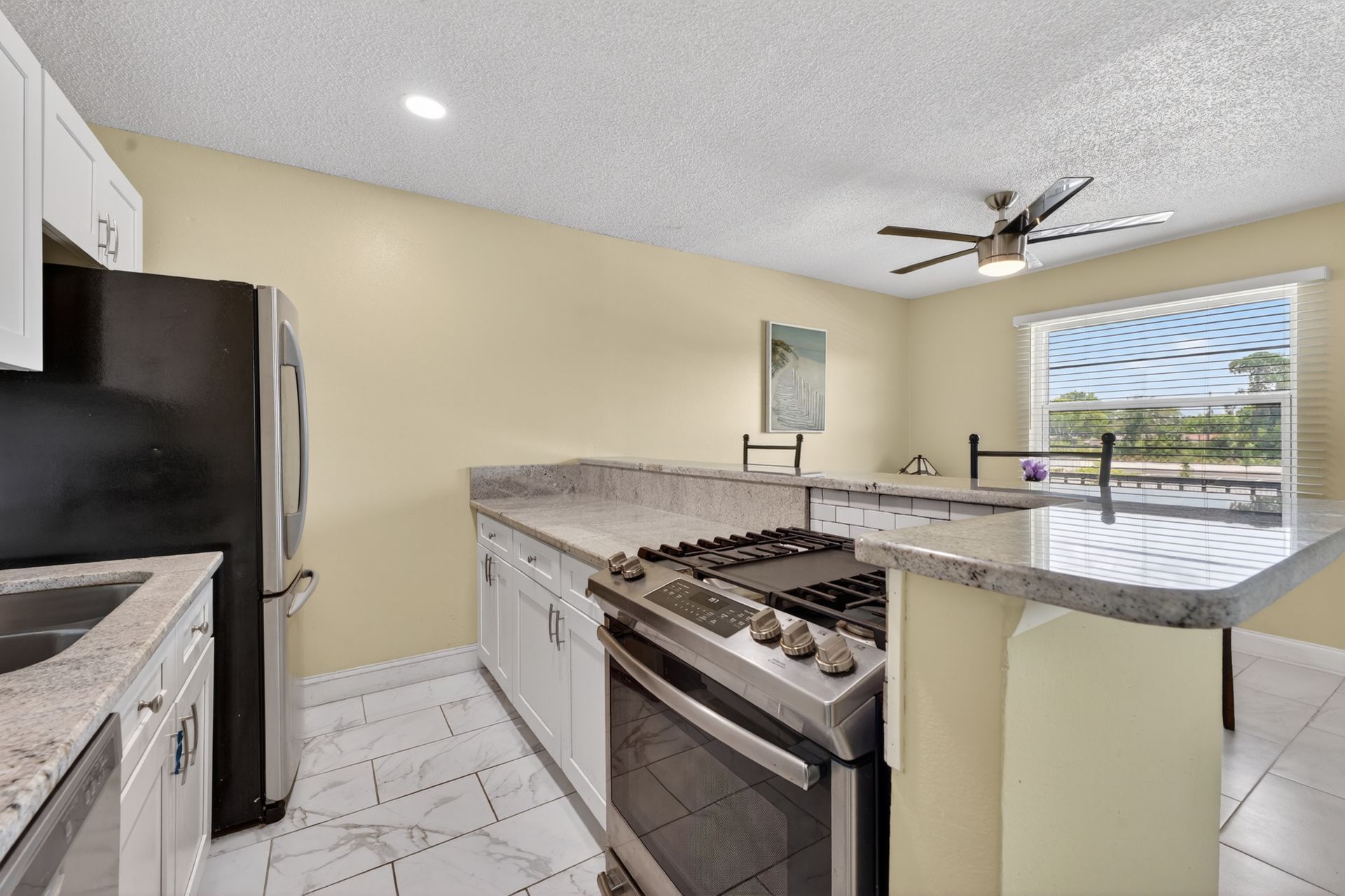 The renovated kitchen anchors the space with modern cabinetry, granite countertops, stainless steel appliances, and a clean subway tile backsplash, opening to the living and dining area with breakfast bar seating. Porcelain tile flooring runs throughout for durability and continuity.