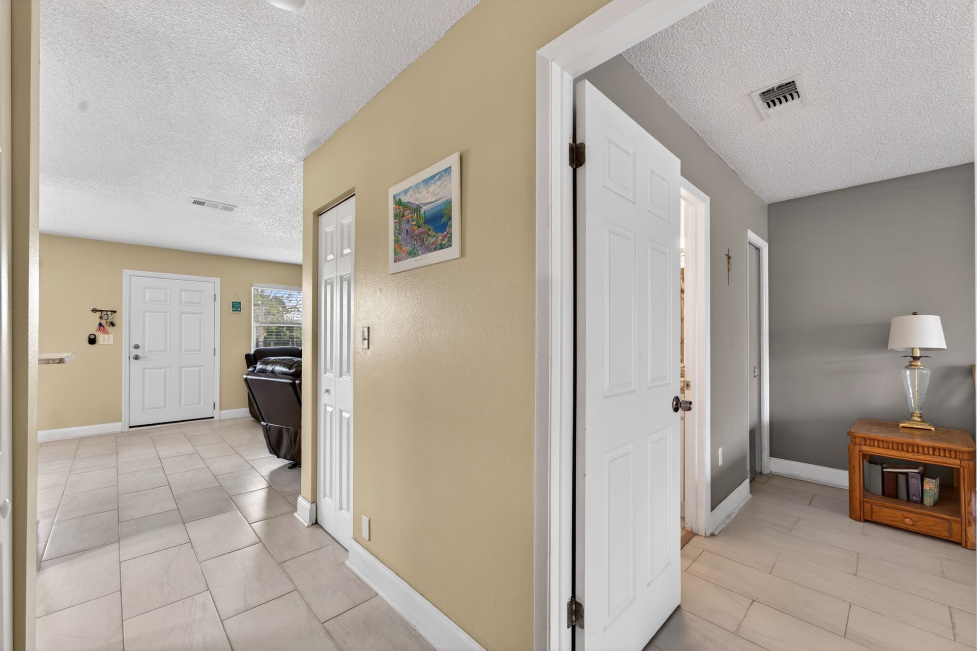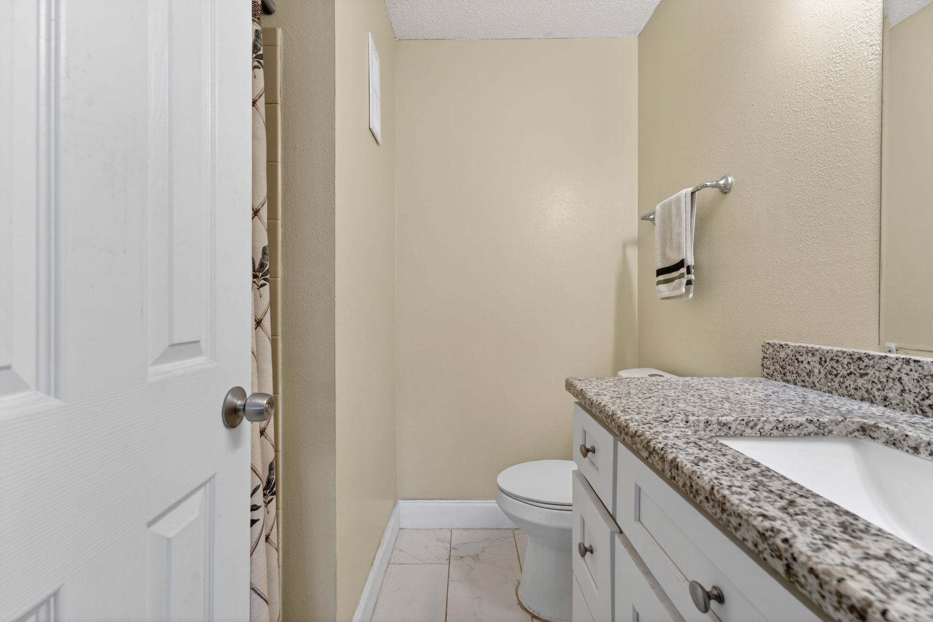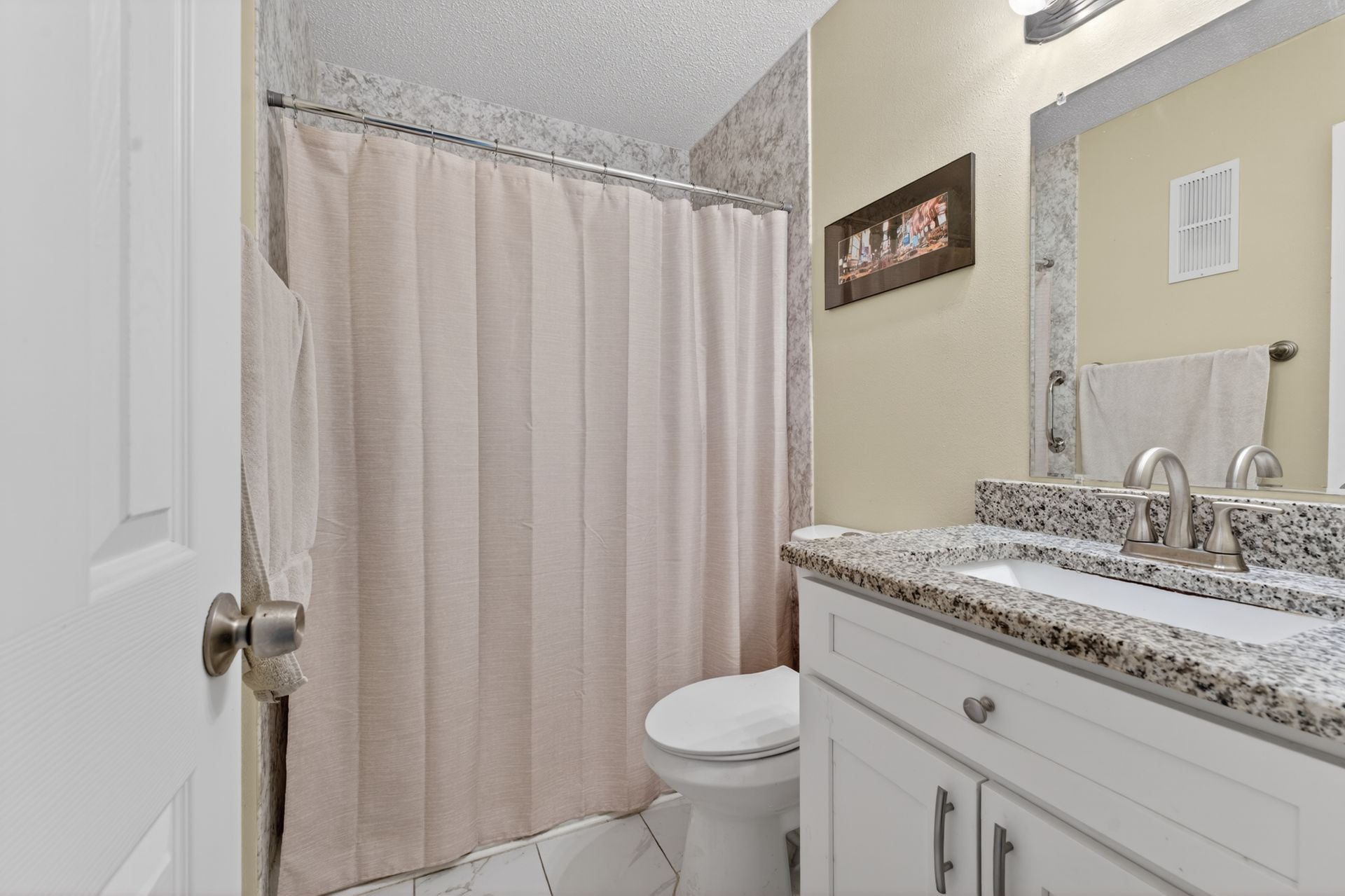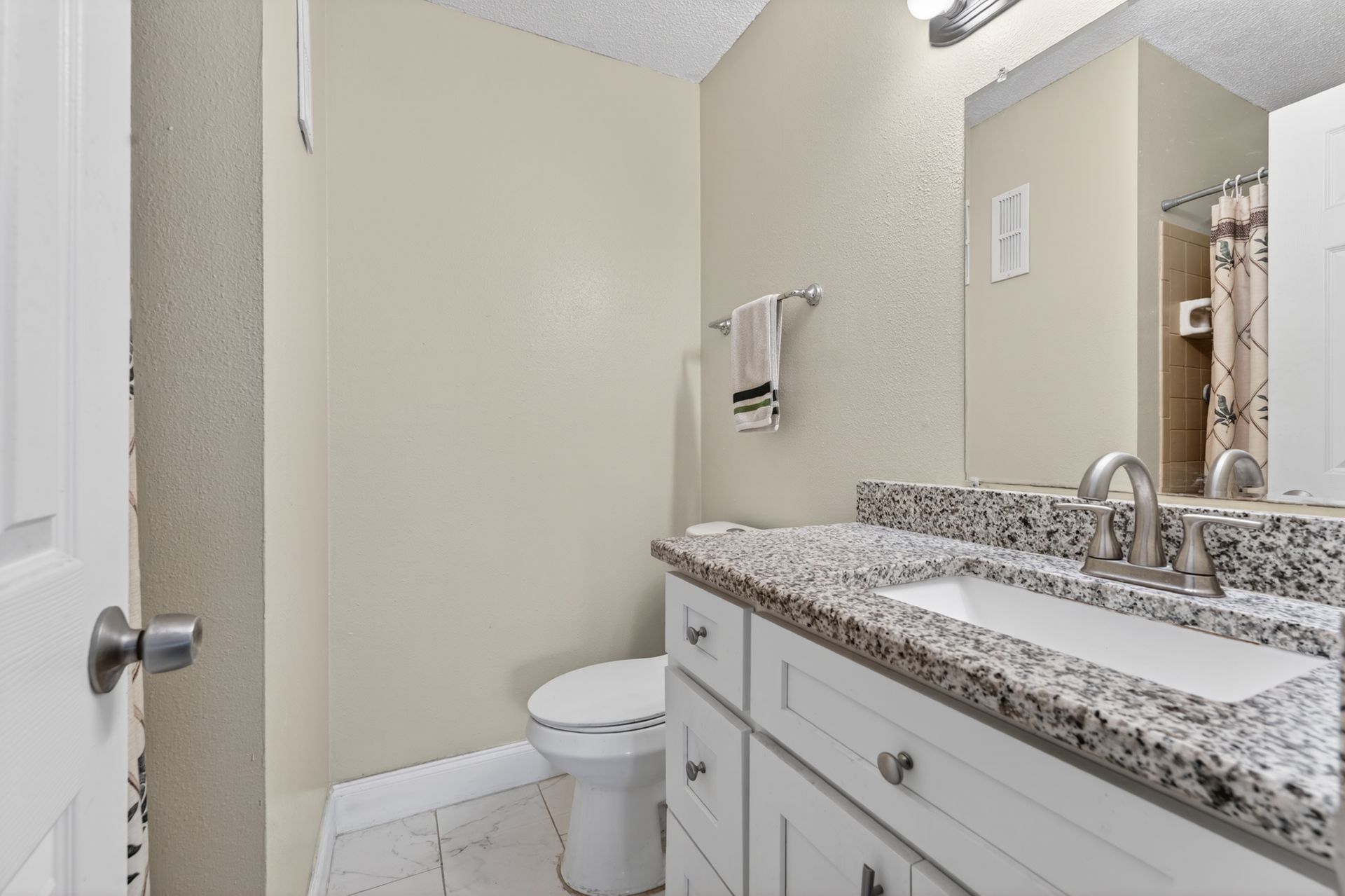 The renovated kitchen anchors the space with modern cabinetry, granite countertops, stainless steel appliances, and a clean subway tile backsplash, opening to the living and dining area with breakfast bar seating. Porcelain tile flooring runs throughout for durability and continuity.