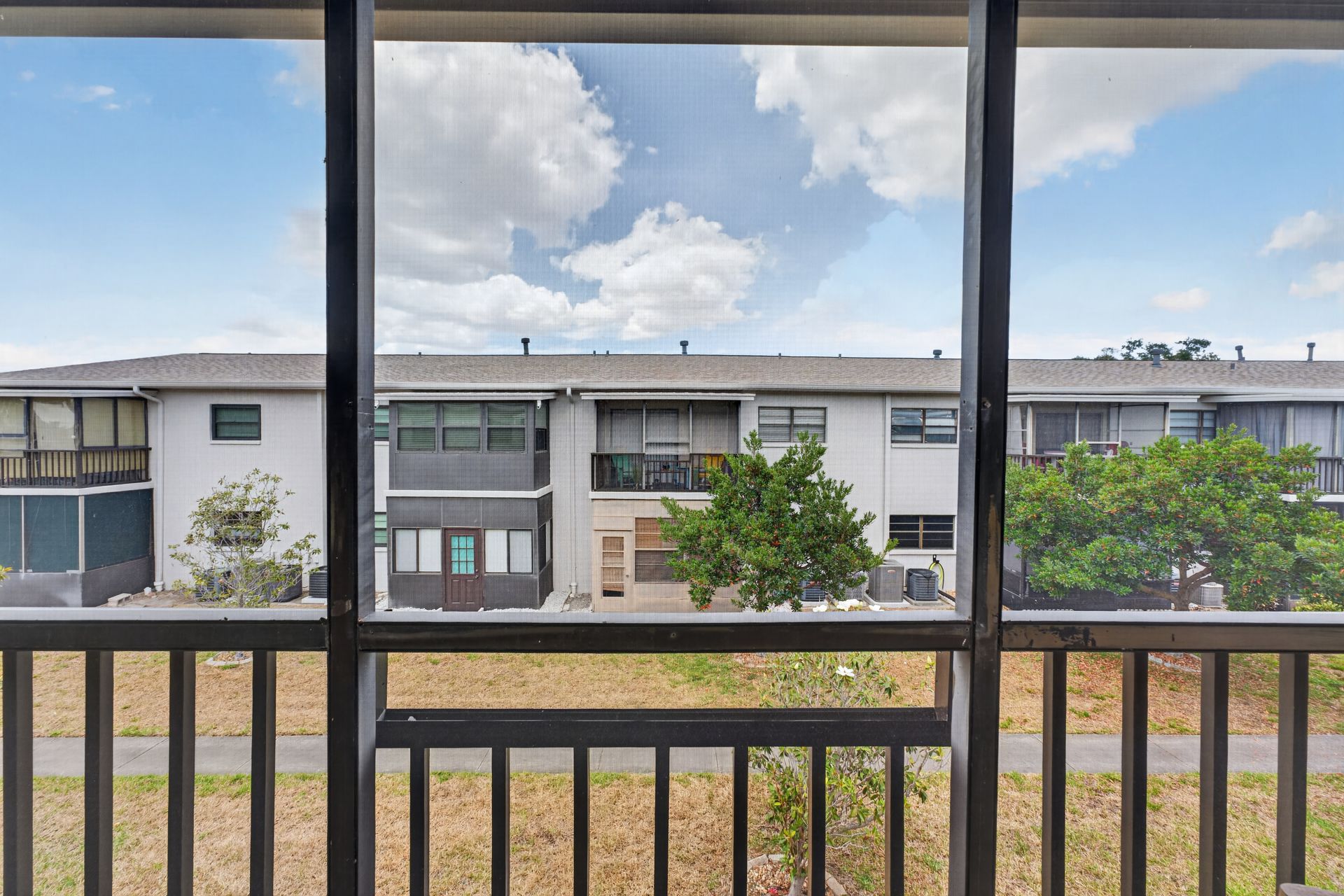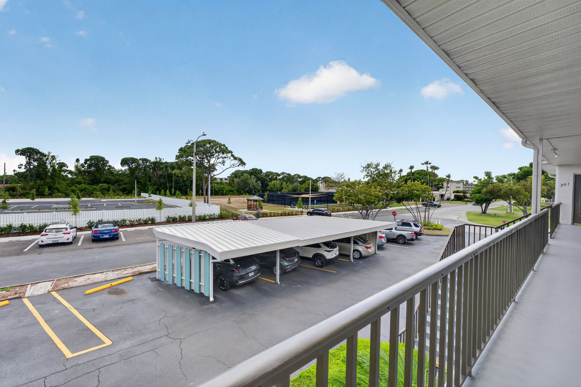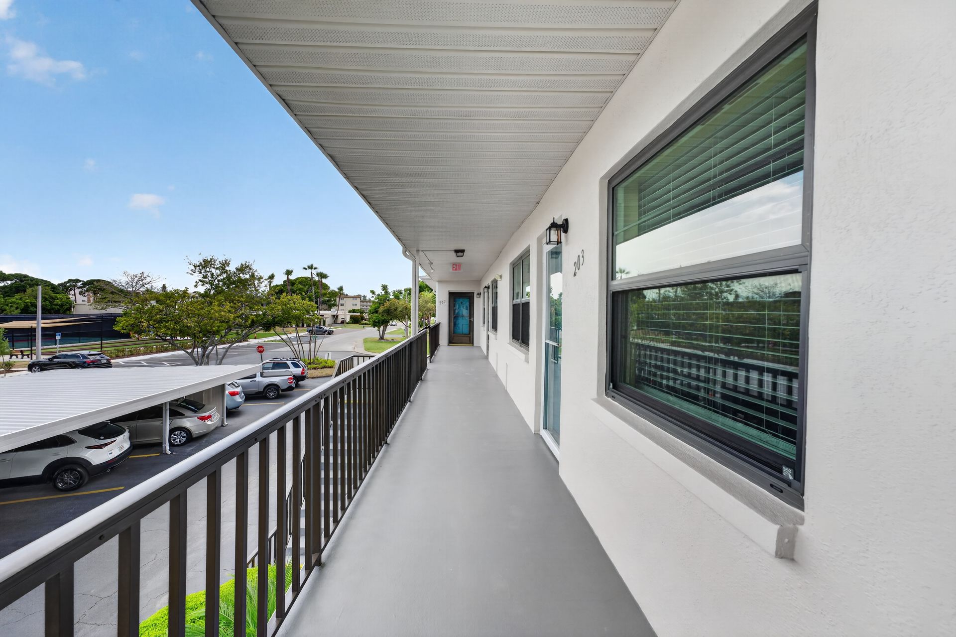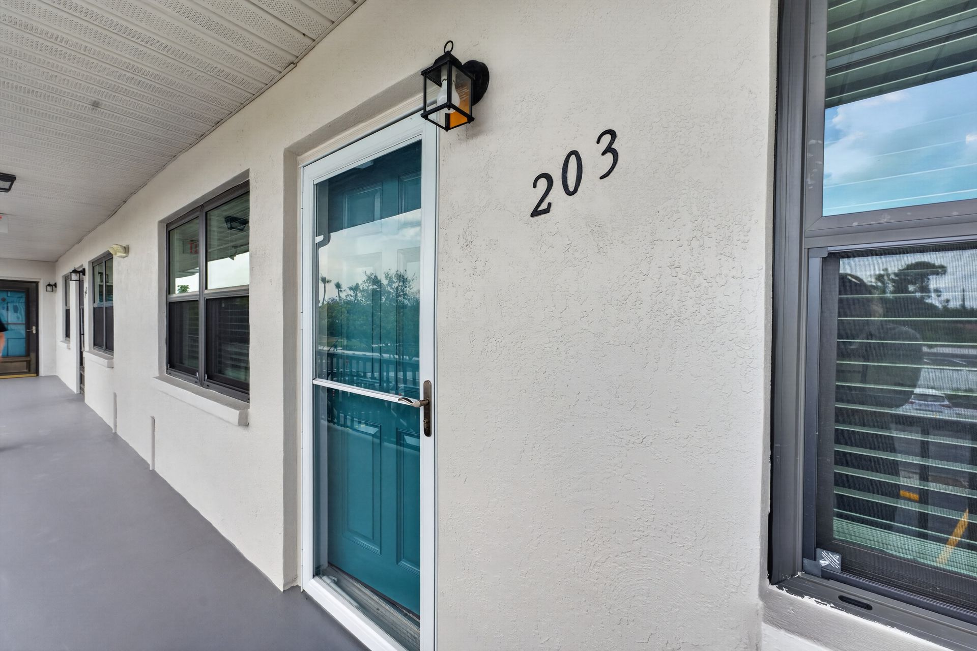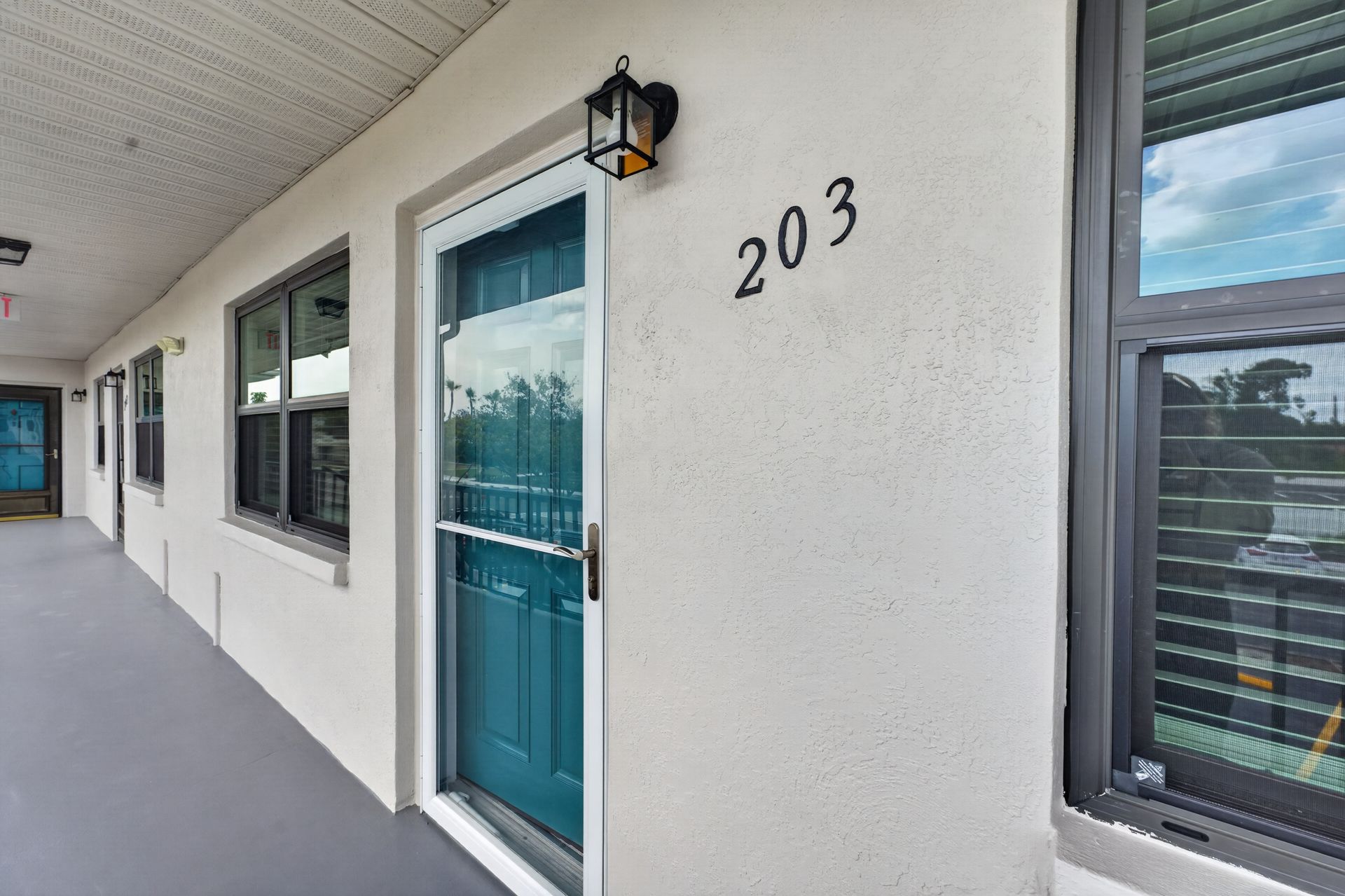 Recent improvements include hurricane-rated windows and front door, updated fixtures, and updated AC (2021). Additional features include ample storage, nearby laundry facilities, and assigned parking (#203).