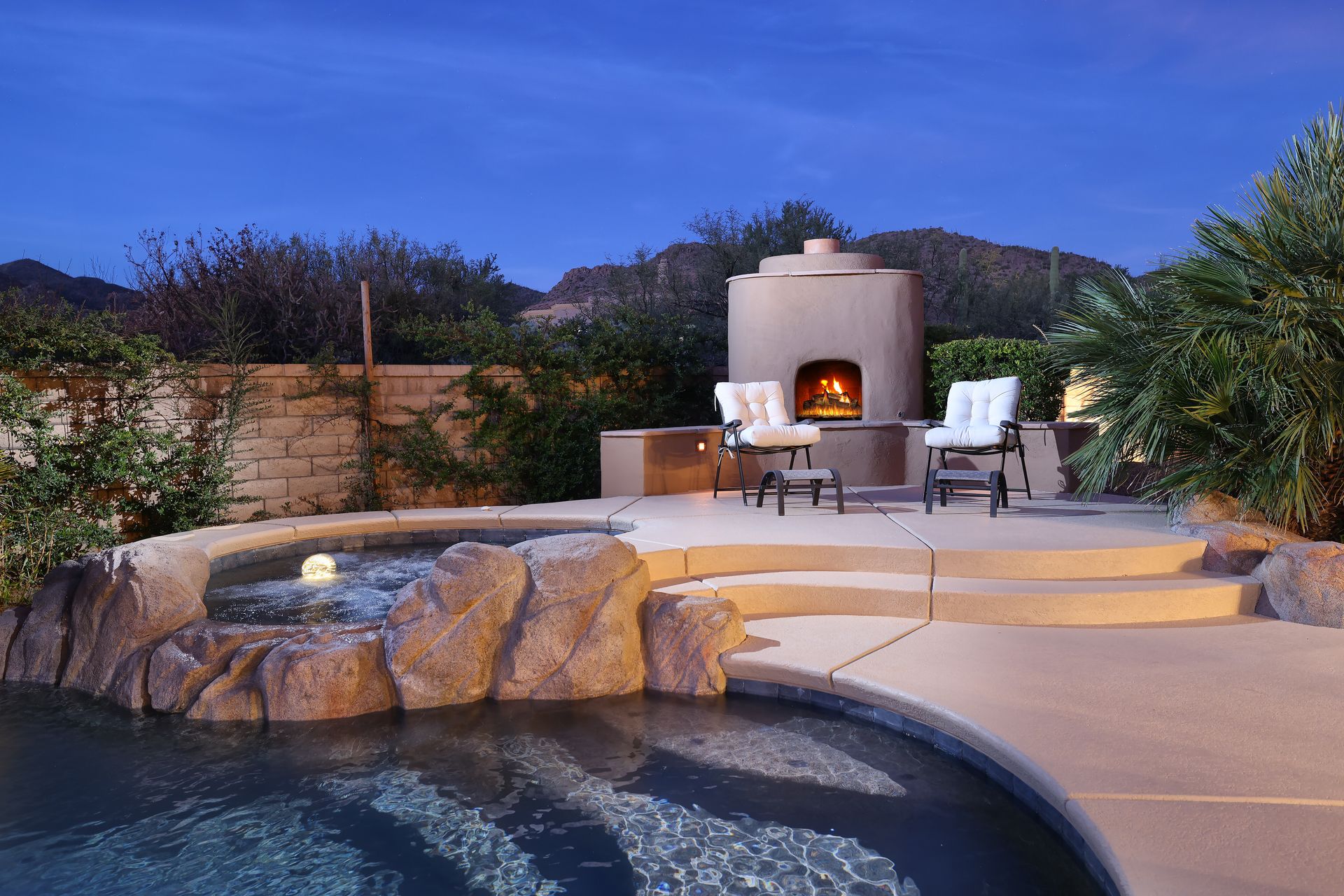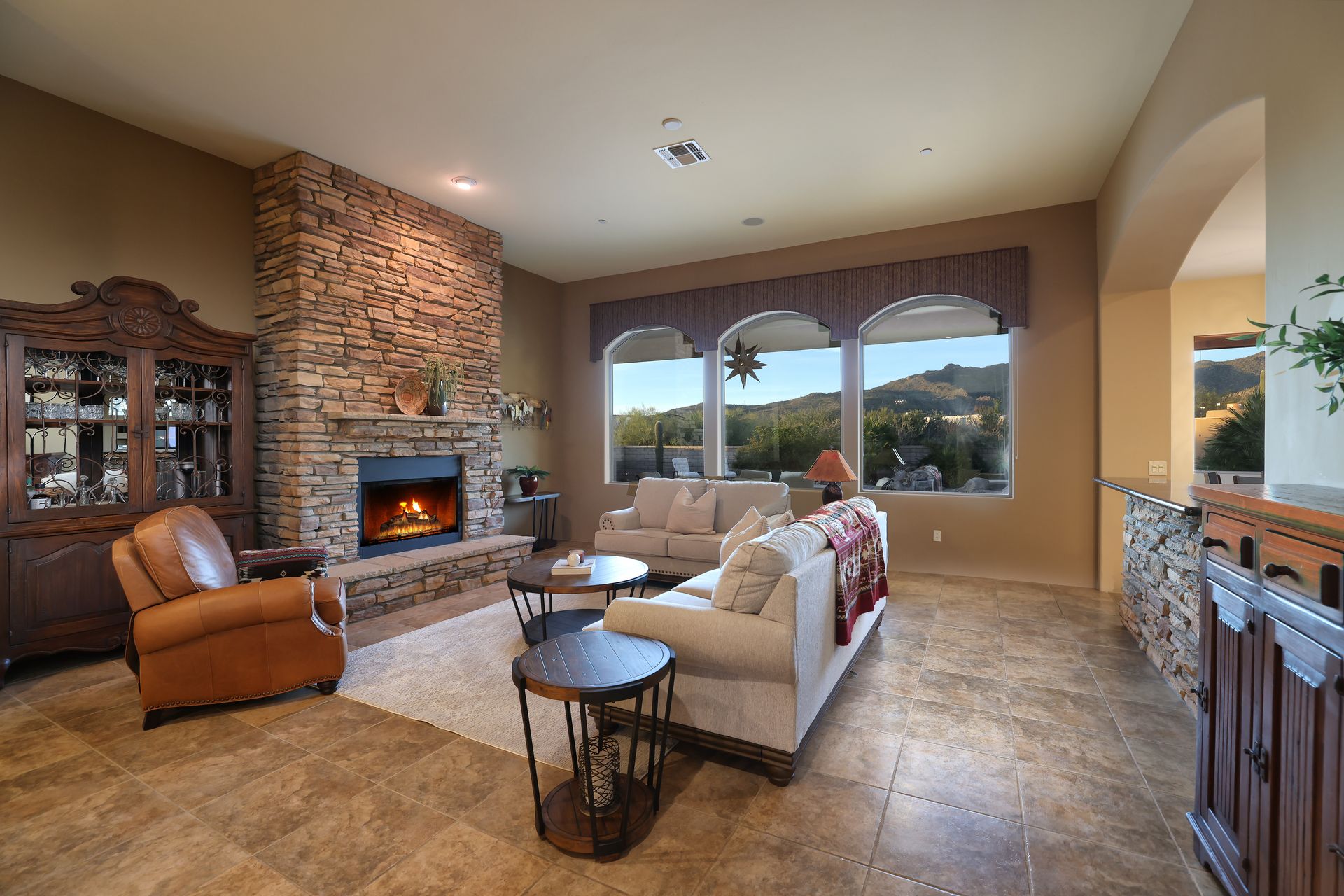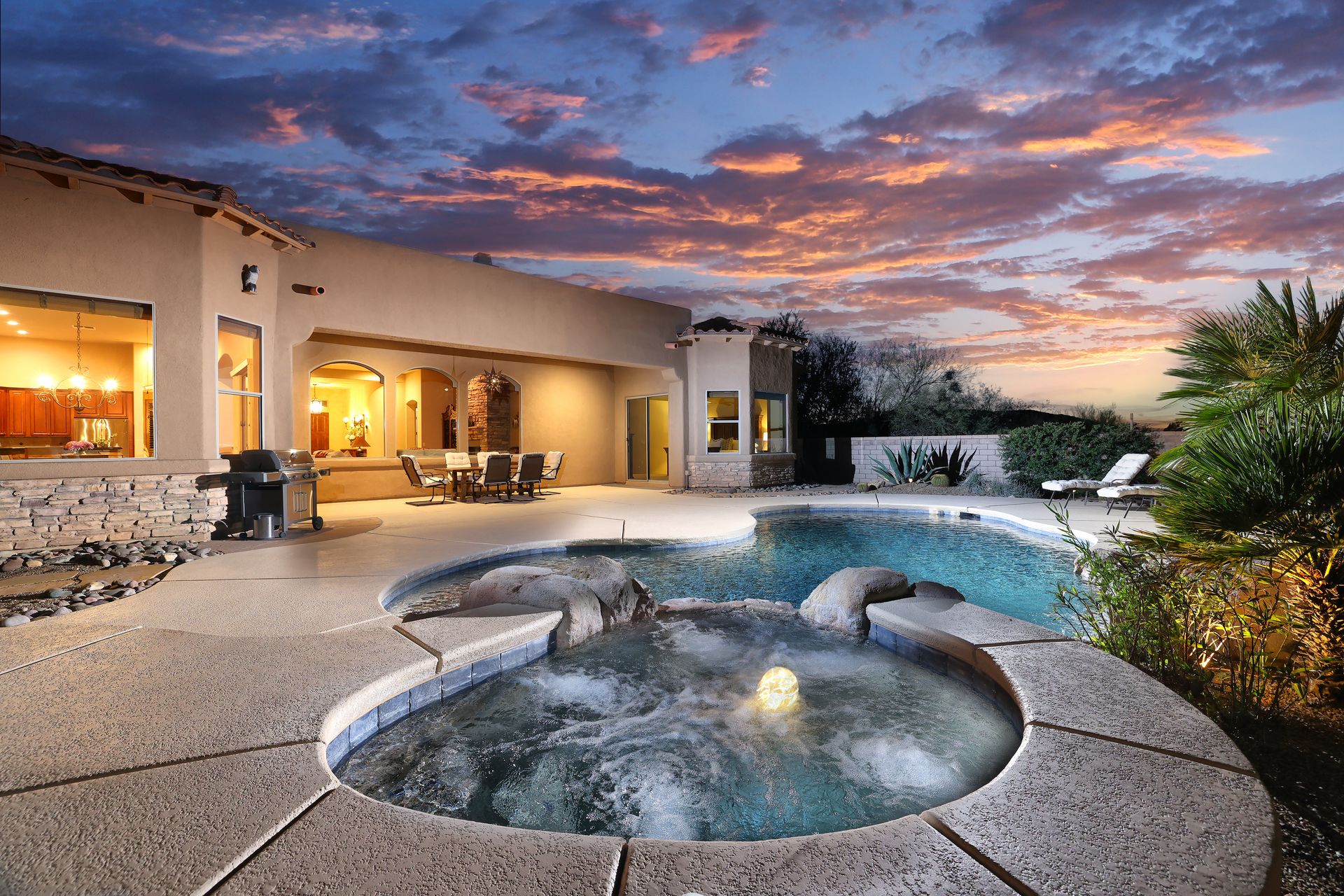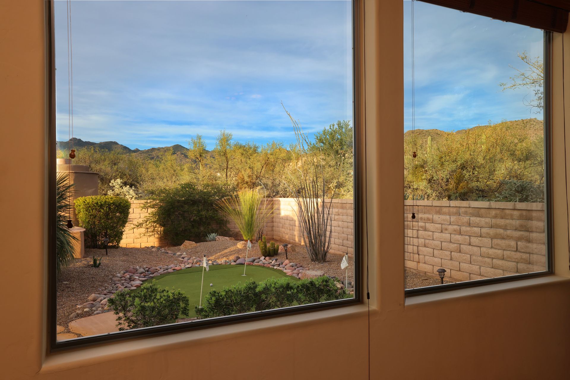 With no rear neighbors, the backyard is a private desert retreat complete with a heated Pebble-Tec pool and spa with waterfall, custom putting green, and built-in kiva fireplace—ideal for relaxing evenings under the Arizona sky. This is more than a home; it is a Sonoran Desert lifestyle that cannot be duplicated.