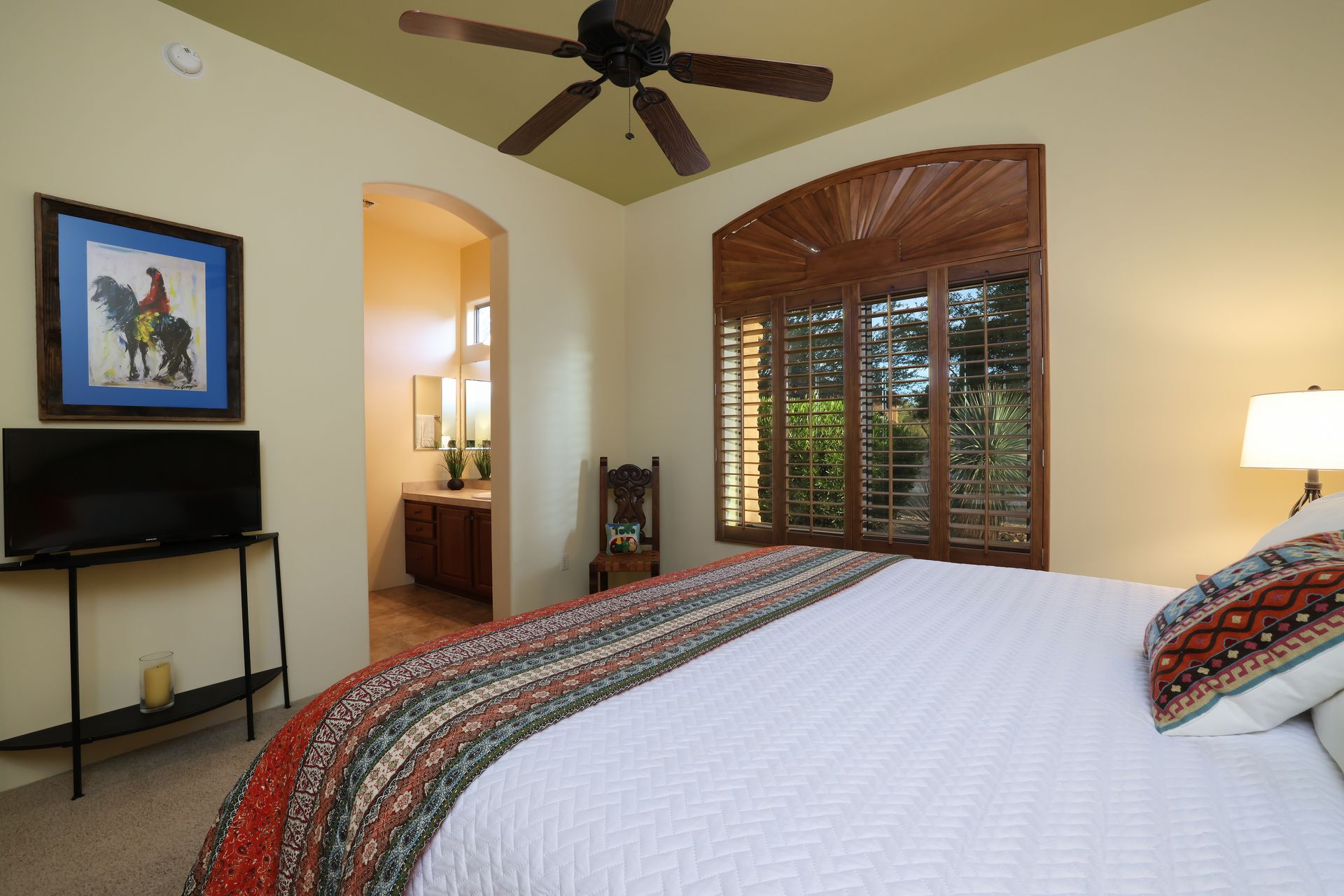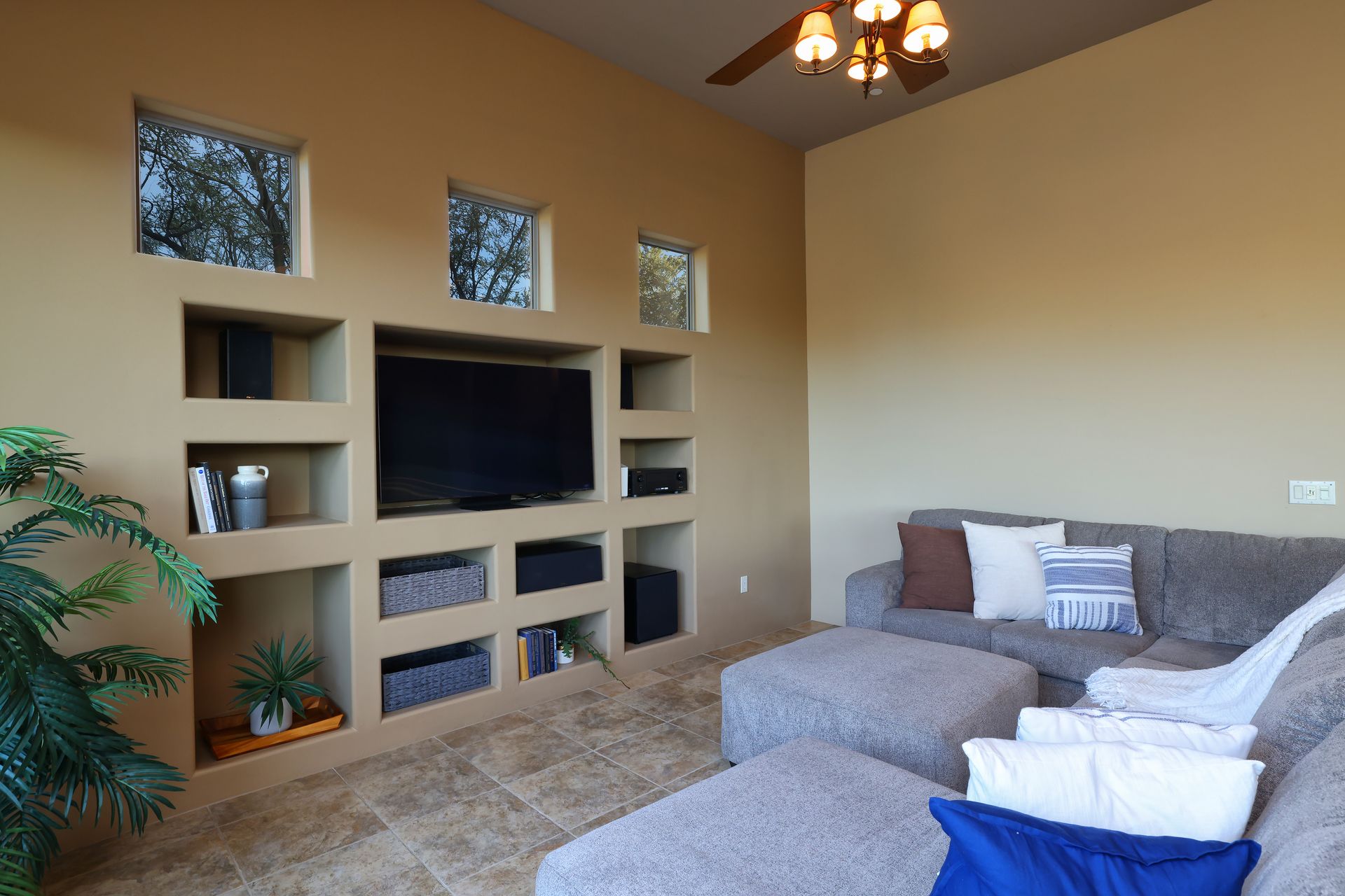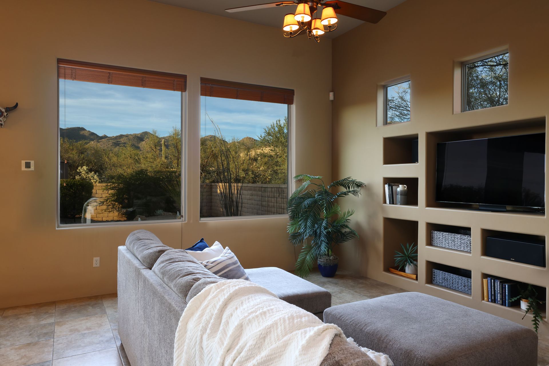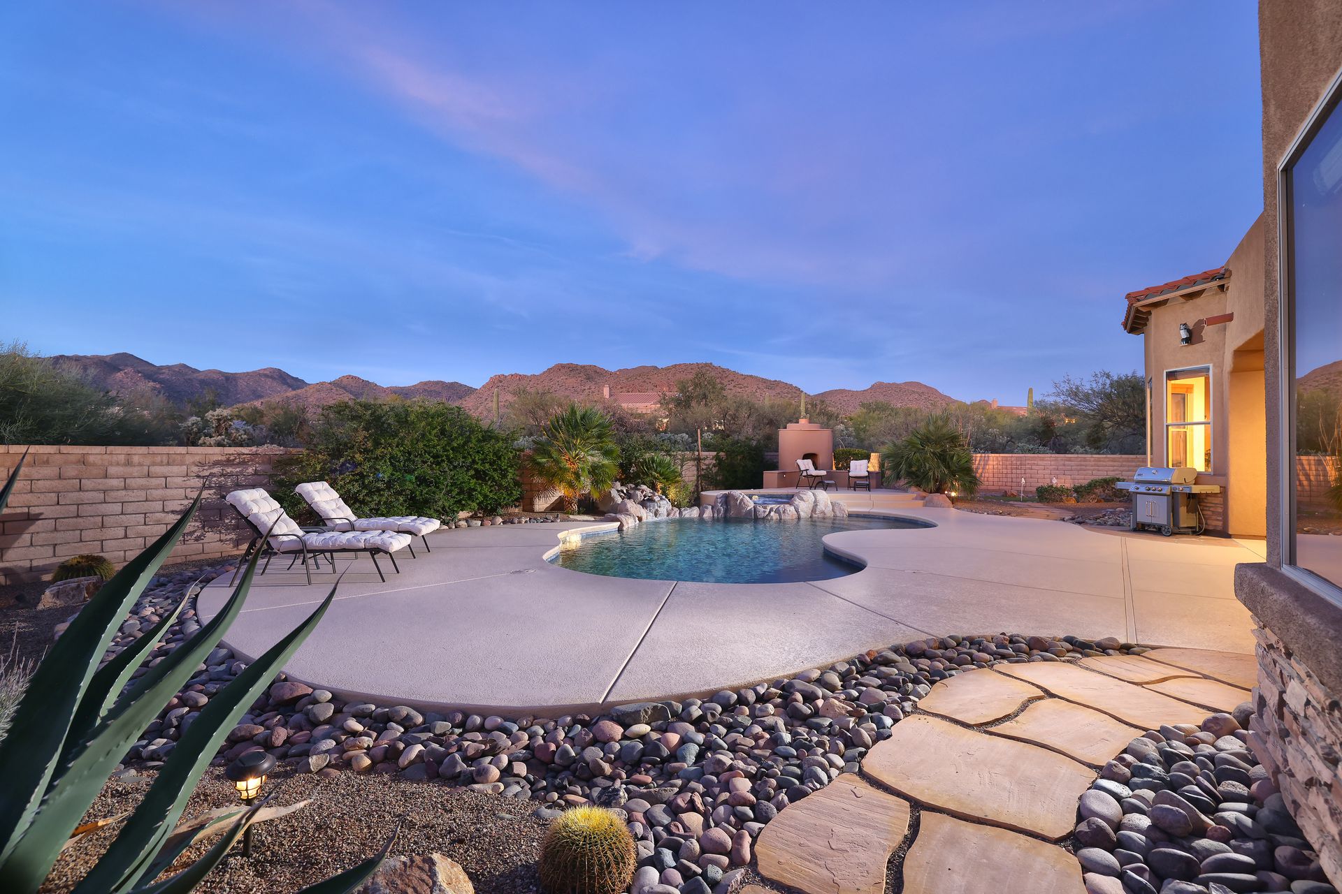 With no rear neighbors, the backyard is a private desert retreat complete with a heated Pebble-Tec pool and spa with waterfall, custom putting green, and built-in kiva fireplace—ideal for relaxing evenings under the Arizona sky. This is more than a home; it is a Sonoran Desert lifestyle that cannot be duplicated.