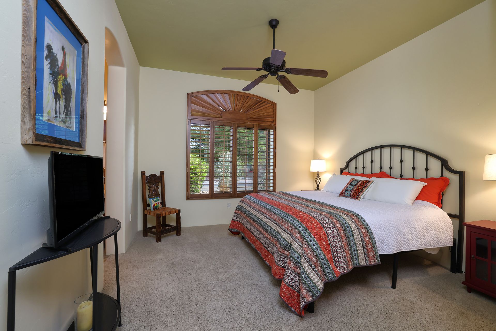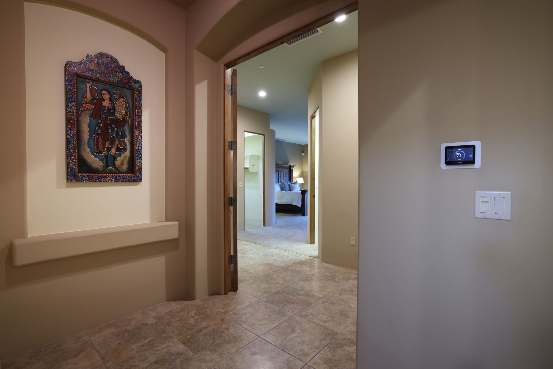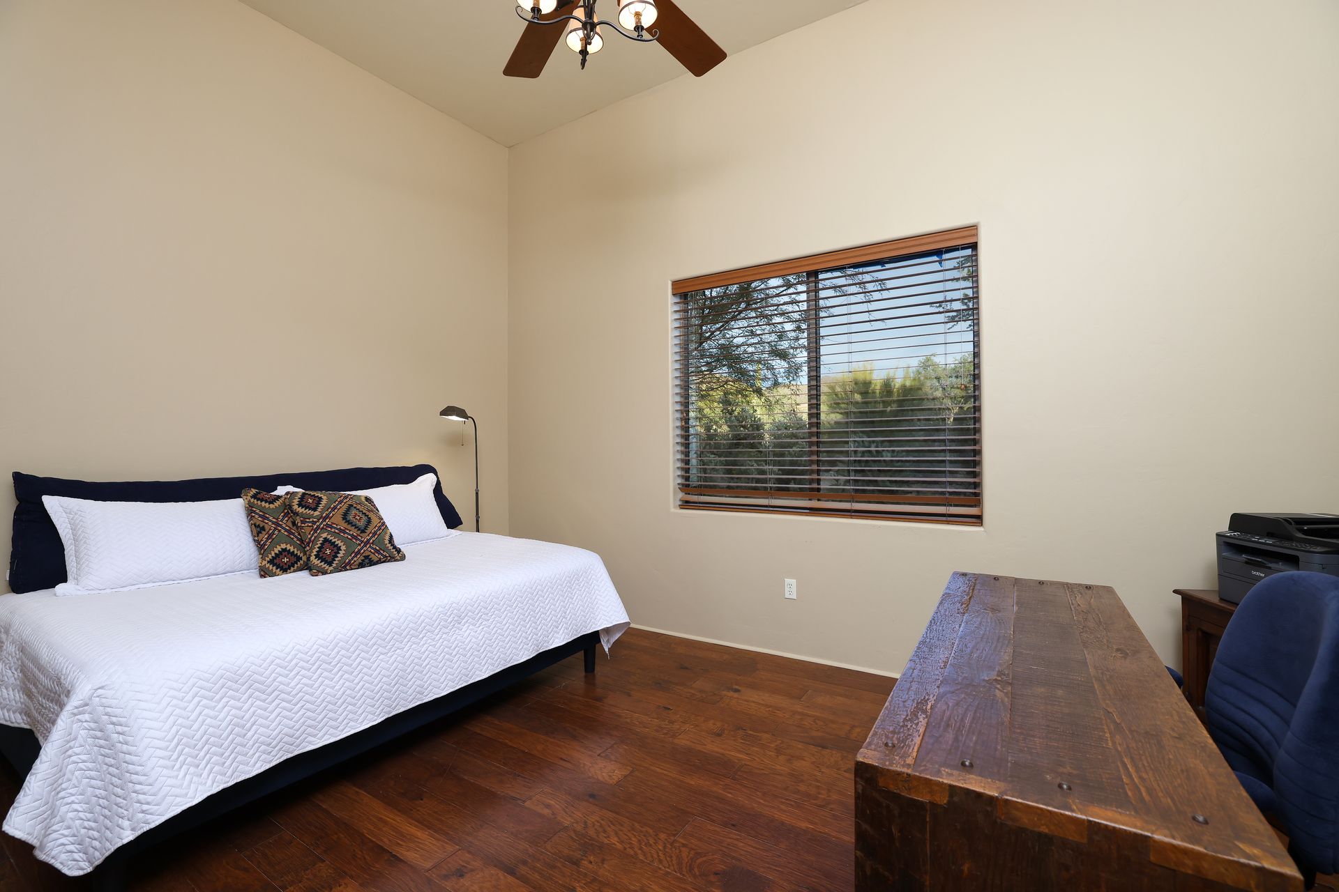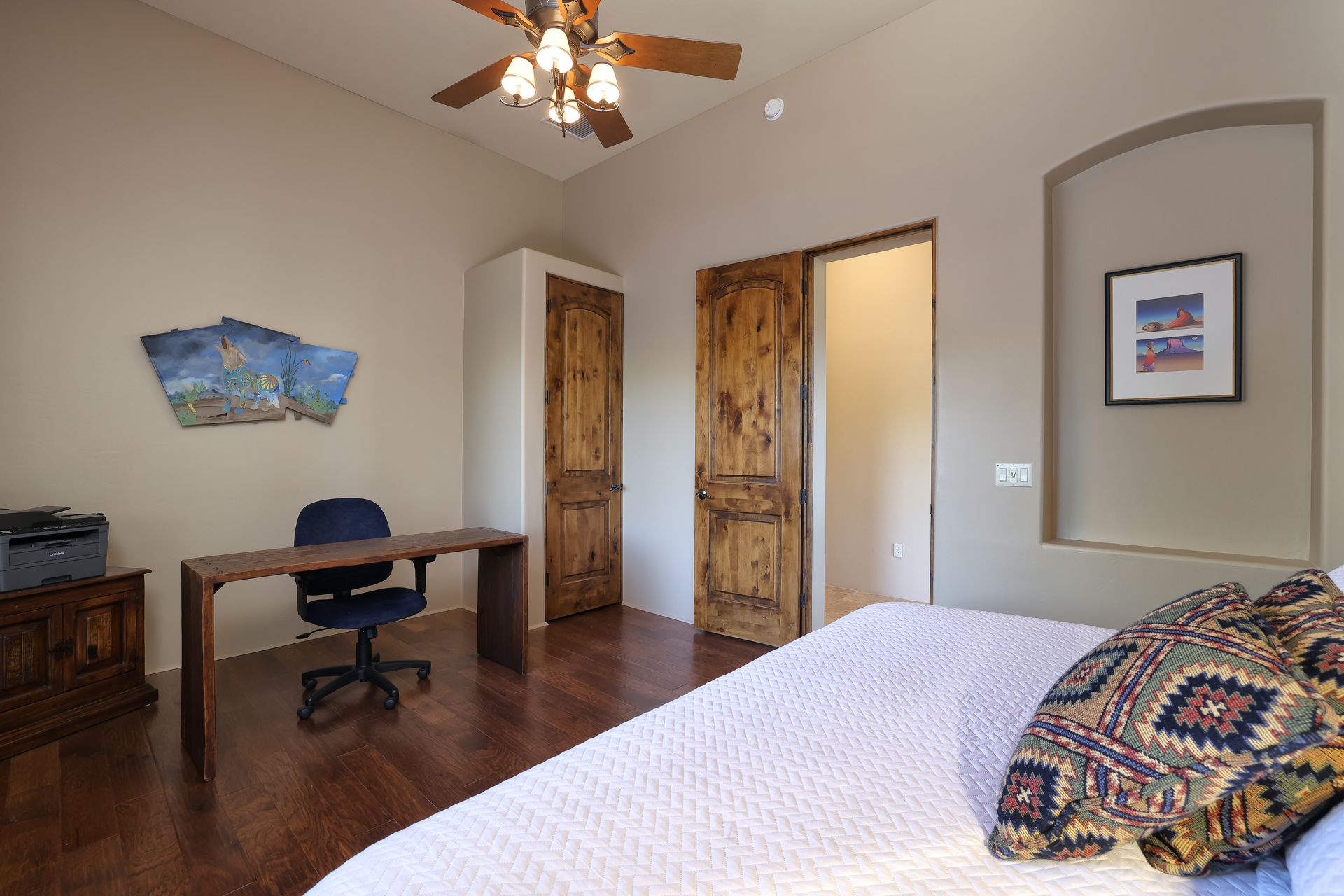 With no rear neighbors, the backyard is a private desert retreat complete with a heated Pebble-Tec pool and spa with waterfall, custom putting green, and built-in kiva fireplace—ideal for relaxing evenings under the Arizona sky. This is more than a home; it is a Sonoran Desert lifestyle that cannot be duplicated.