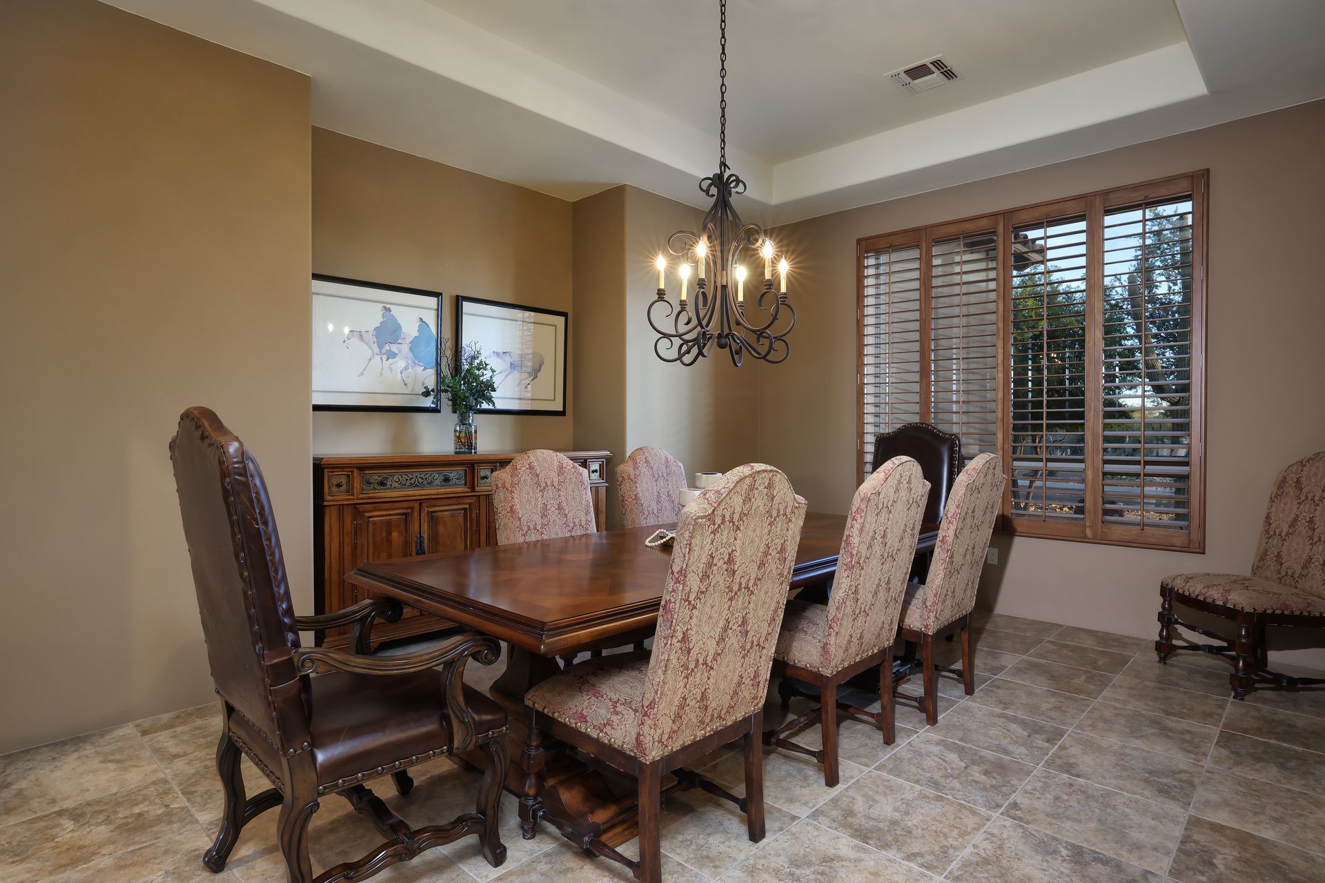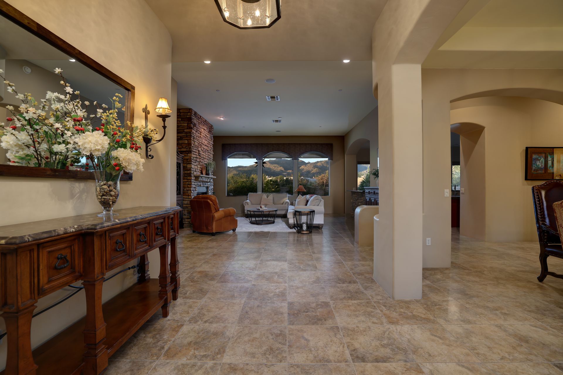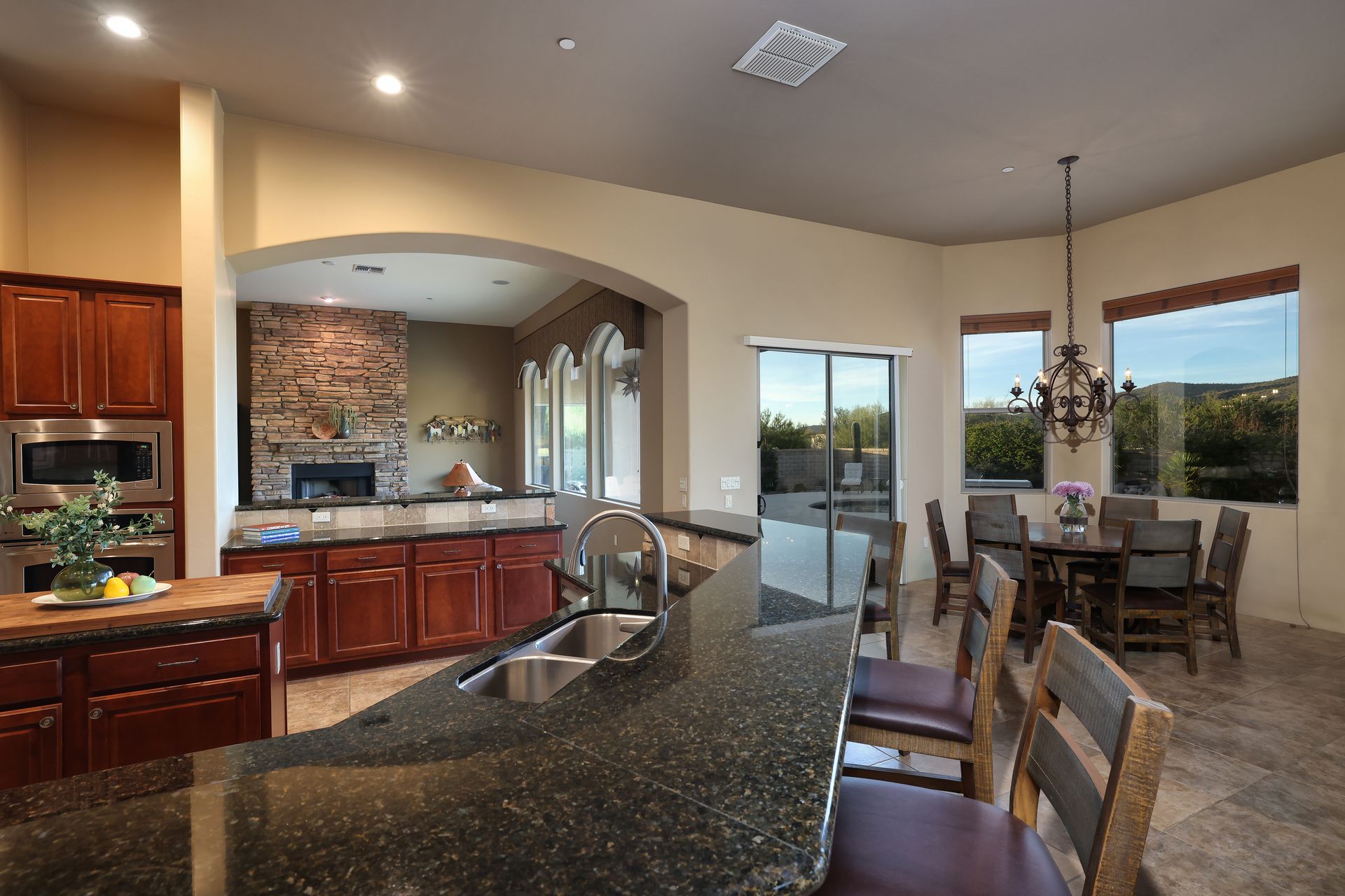 Inside, tile flooring flows through the main living areas, complemented by plantation shutters, custom paint, and abundant natural light. The great room, anchored by a stacked-stone fireplace, creates an inviting space for gatherings. The chef’s kitchen features rich wood cabinetry, stainless steel appliances, a center island, dual breakfast bars, and mountain views.