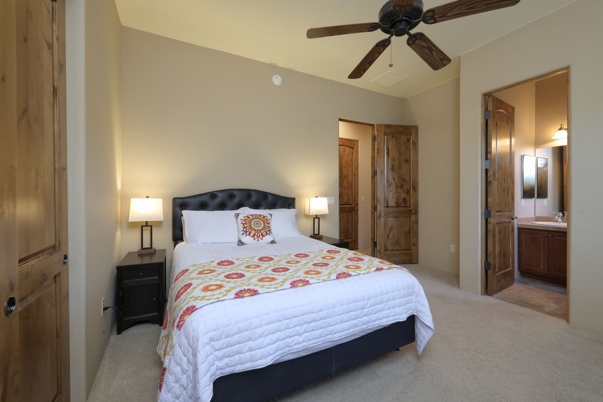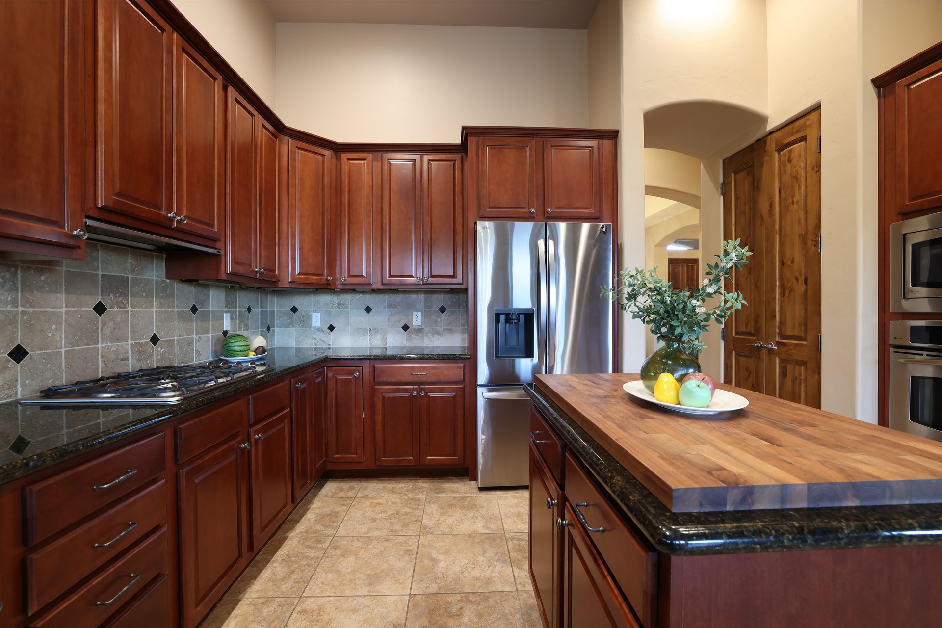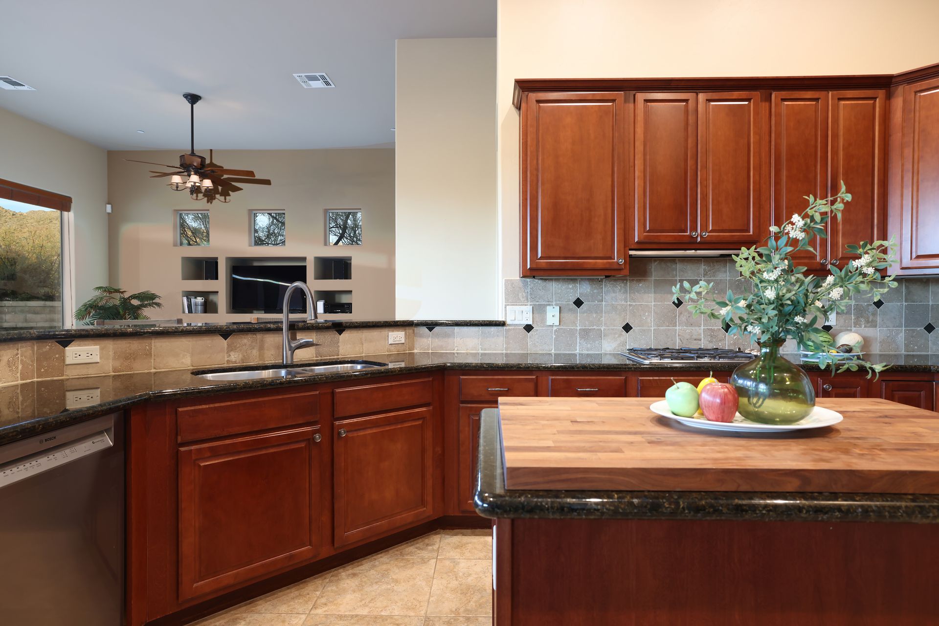 Inside, tile flooring flows through the main living areas, complemented by plantation shutters, custom paint, and abundant natural light. The great room, anchored by a stacked-stone fireplace, creates an inviting space for gatherings. The chef’s kitchen features rich wood cabinetry, stainless steel appliances, a center island, dual breakfast bars, and mountain views.