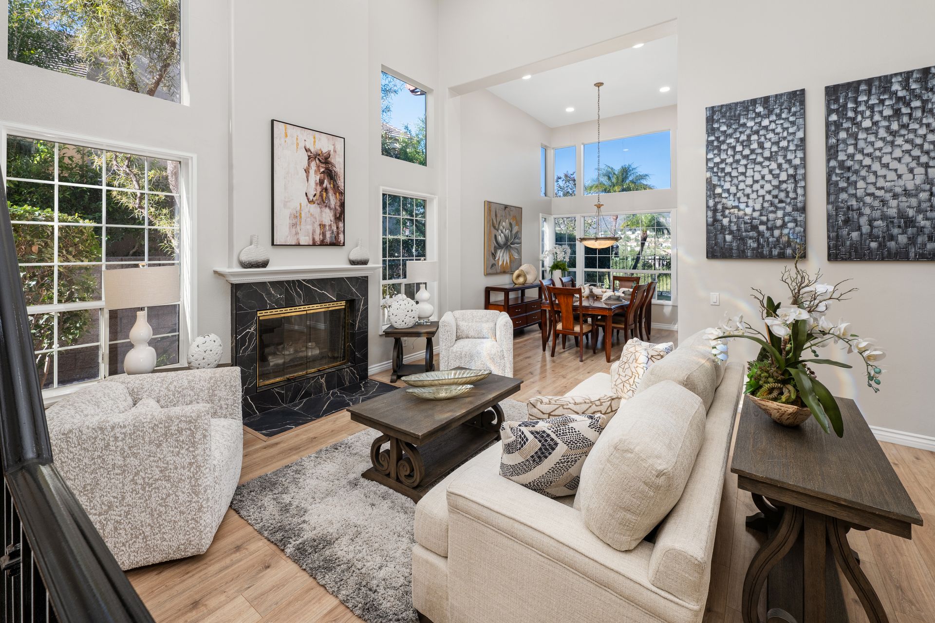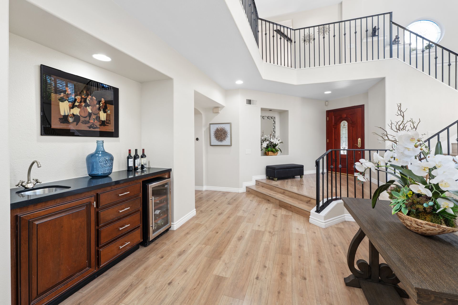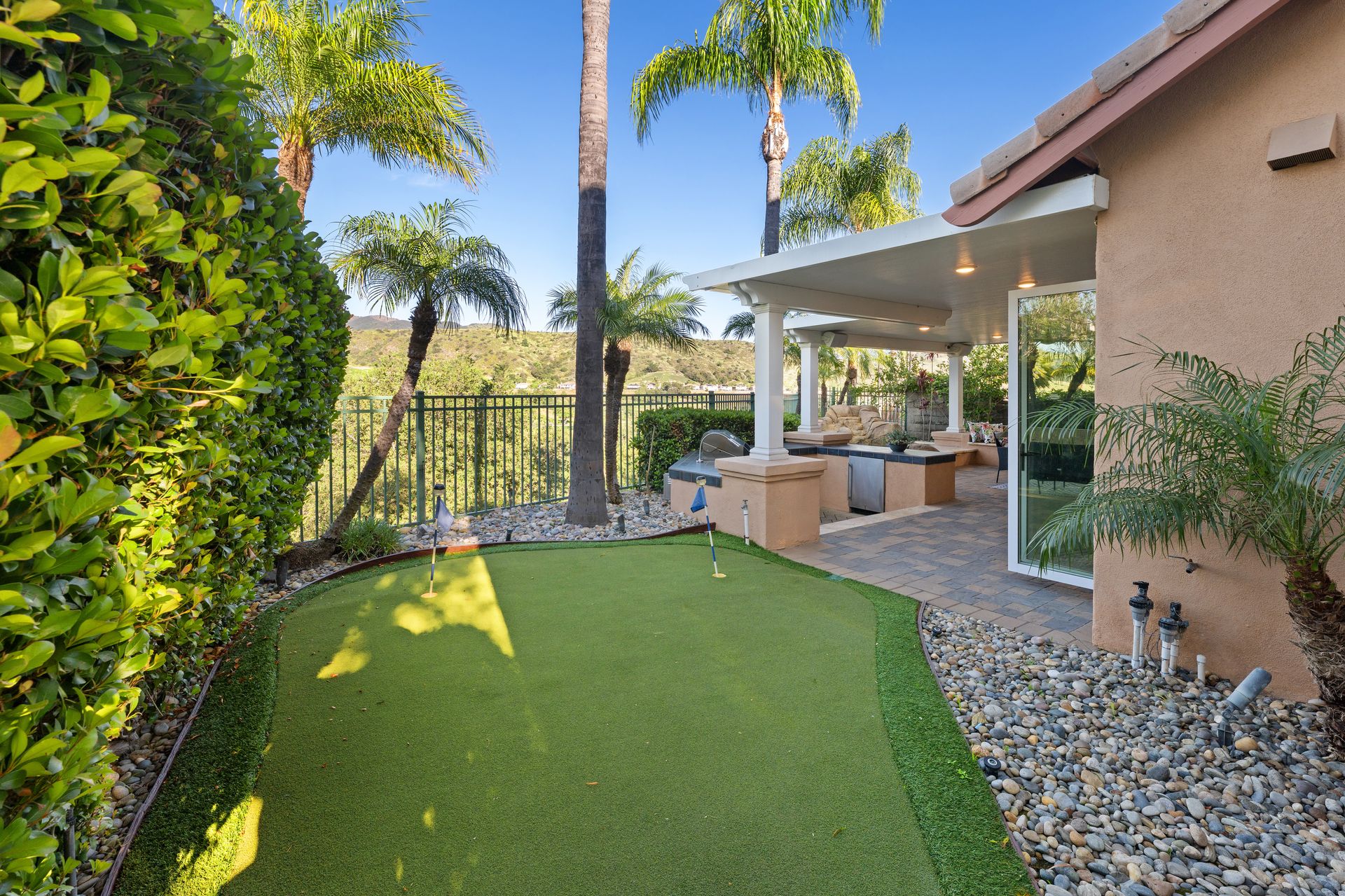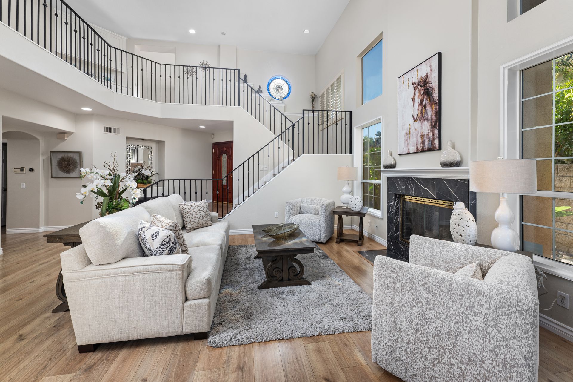 Nestled within the exclusive, guard-gated community of Dove Canyon, this wonderful Westcliff home offers some of the most spectacular views in the neighborhood. From the moment you step inside, you are greeted by a grand entrance with soaring ceilings and an abundance of natural light pouring through expansive windows. This beautifully upgraded home features four spacious bedrooms and three and a half bathrooms, including a convenient main-floor bedroom and bath—perfect for guests or multi-generational living. Three fireplaces add warmth and ambiance, while folding glass doors invite seamless indoor–outdoor living. The remodeled chef’s kitchen is a showstopper, featuring quartz countertops, decorative glass backsplash, brand-new stainless-steel appliances, and a new refrigerator. Upstairs, a versatile media/bonus room is ideal for movie nights, a home office, or a play area. Throughout the home, you will find new premium wide-plank flooring, three beautifully remodeled bathrooms, elegant wrought-iron railings, a new tankless water heater, and an included washer and dryer—every detail thoughtfully upgraded. Unwind in the luxurious primary suite, complete with a cozy fireplace, private balcony with serene canyon views, dual walk-in closets, and a spa-inspired bathroom featuring dual sinks, a walk-in shower, and a soaking tub. Step outside to your private backyard oasis, designed for relaxation and entertaining. Enjoy the spa, putting green, built-in BBQ, lush landscaping, and multiple seating areas—perfect for hosting family and friends. Residents of Dove Canyon enjoy access to resort-style amenities including a pool and spa, tennis and pickleball courts, tot lot, basketball court, and 24-hour security. Optional membership to the prestigious Dove Canyon Golf Club offers a Jack Nicklaus–designed course, fitness center, dining, and social events, enhancing the exceptional lifestyle this home provides.