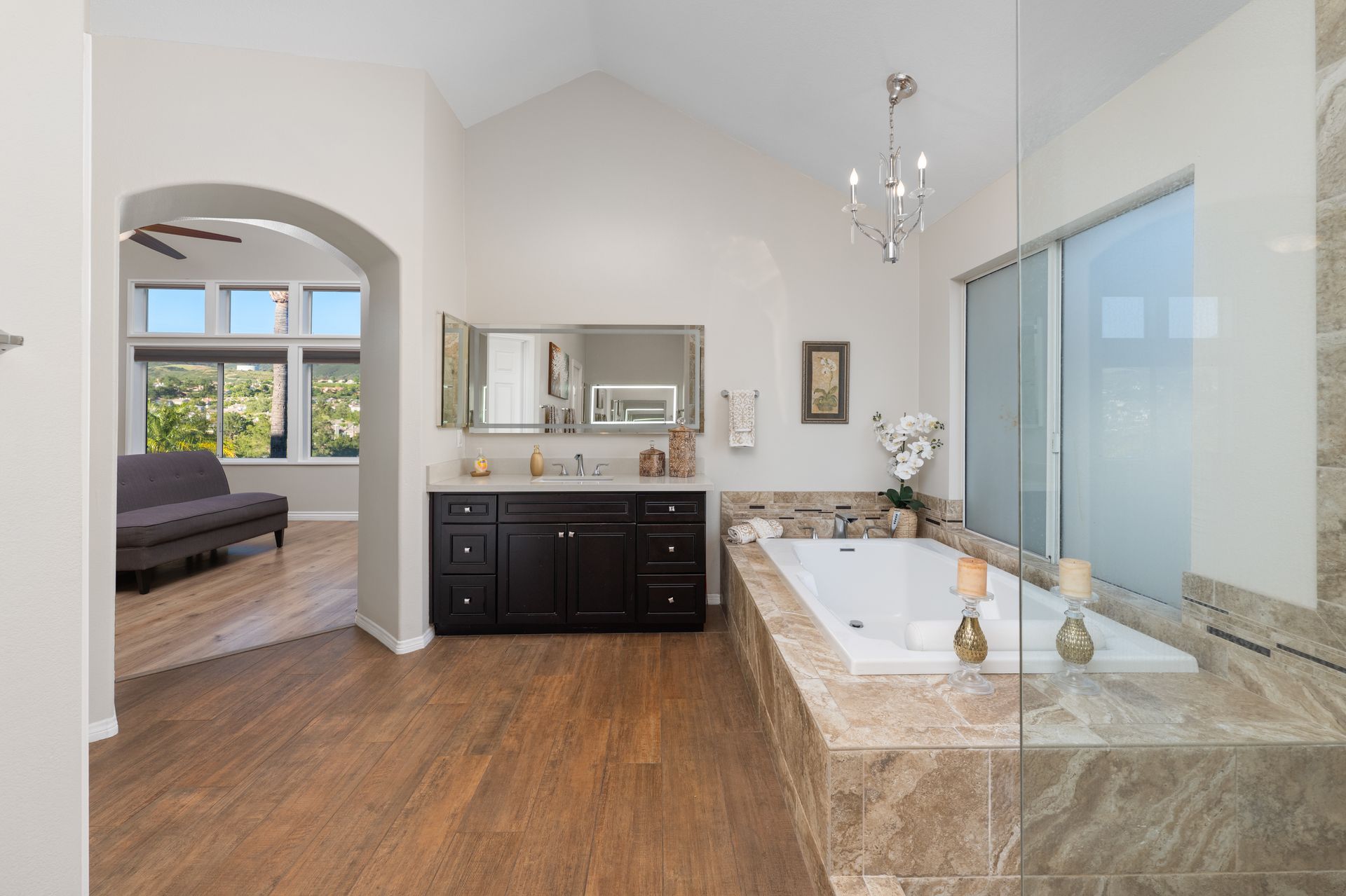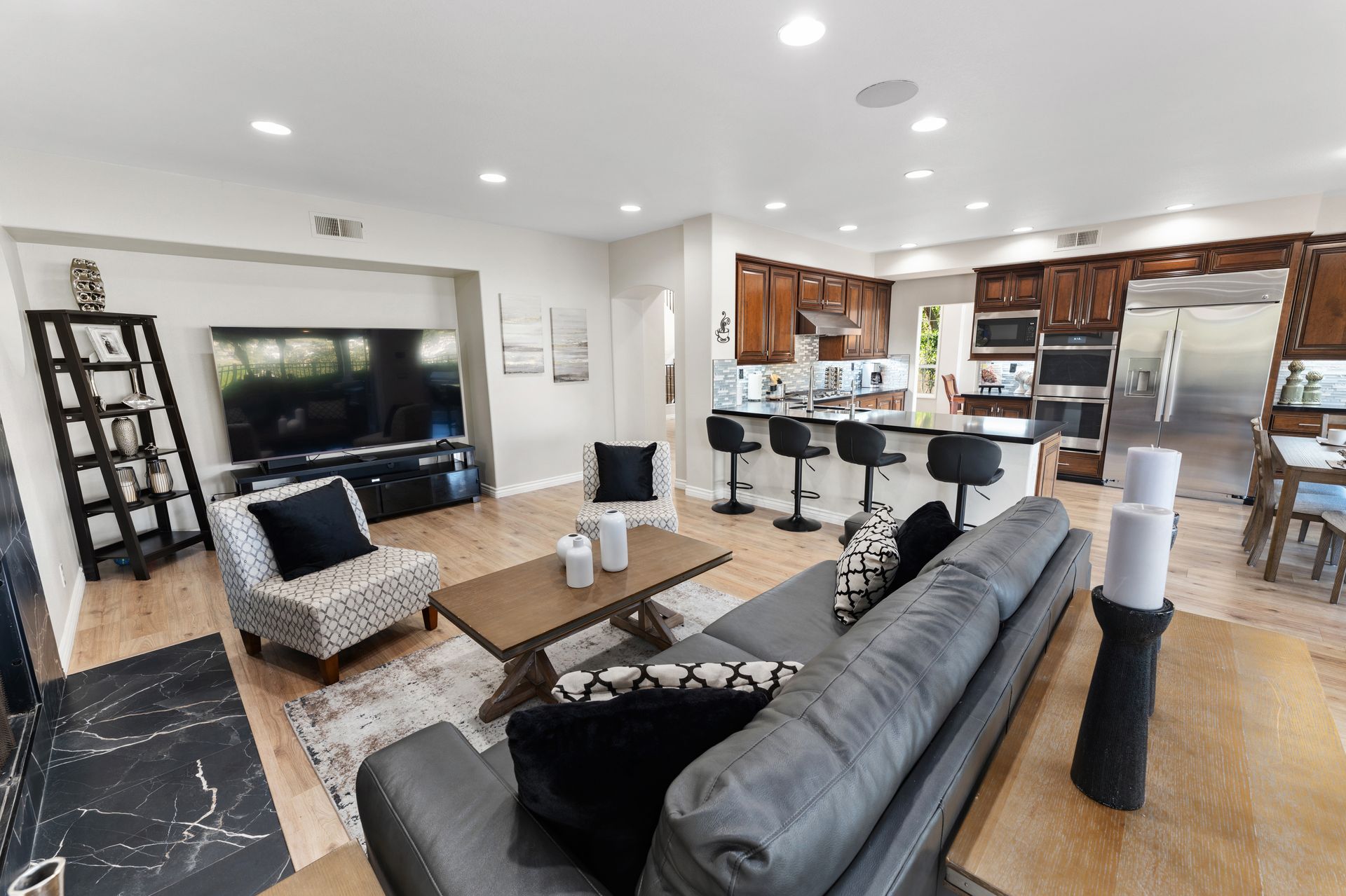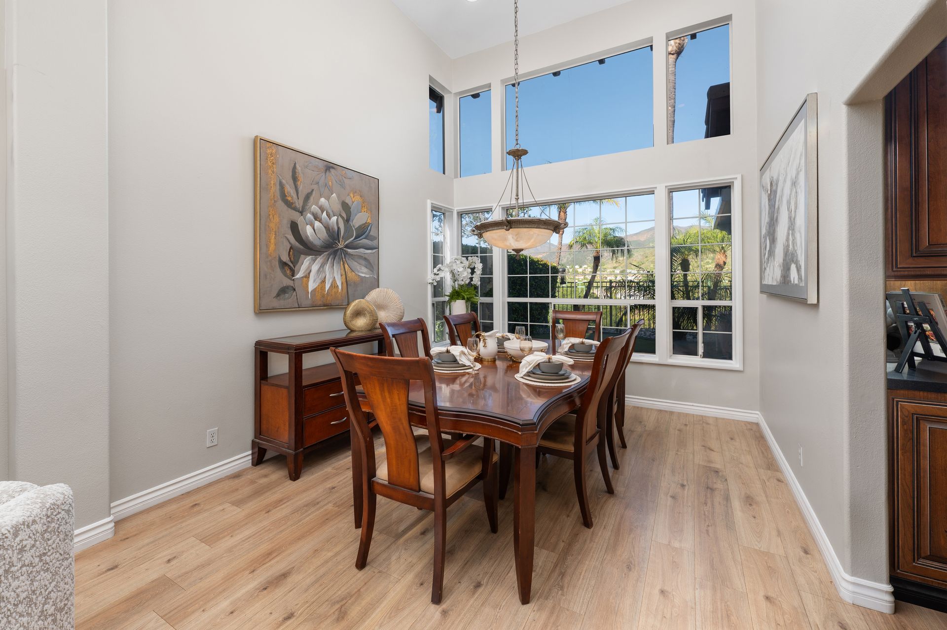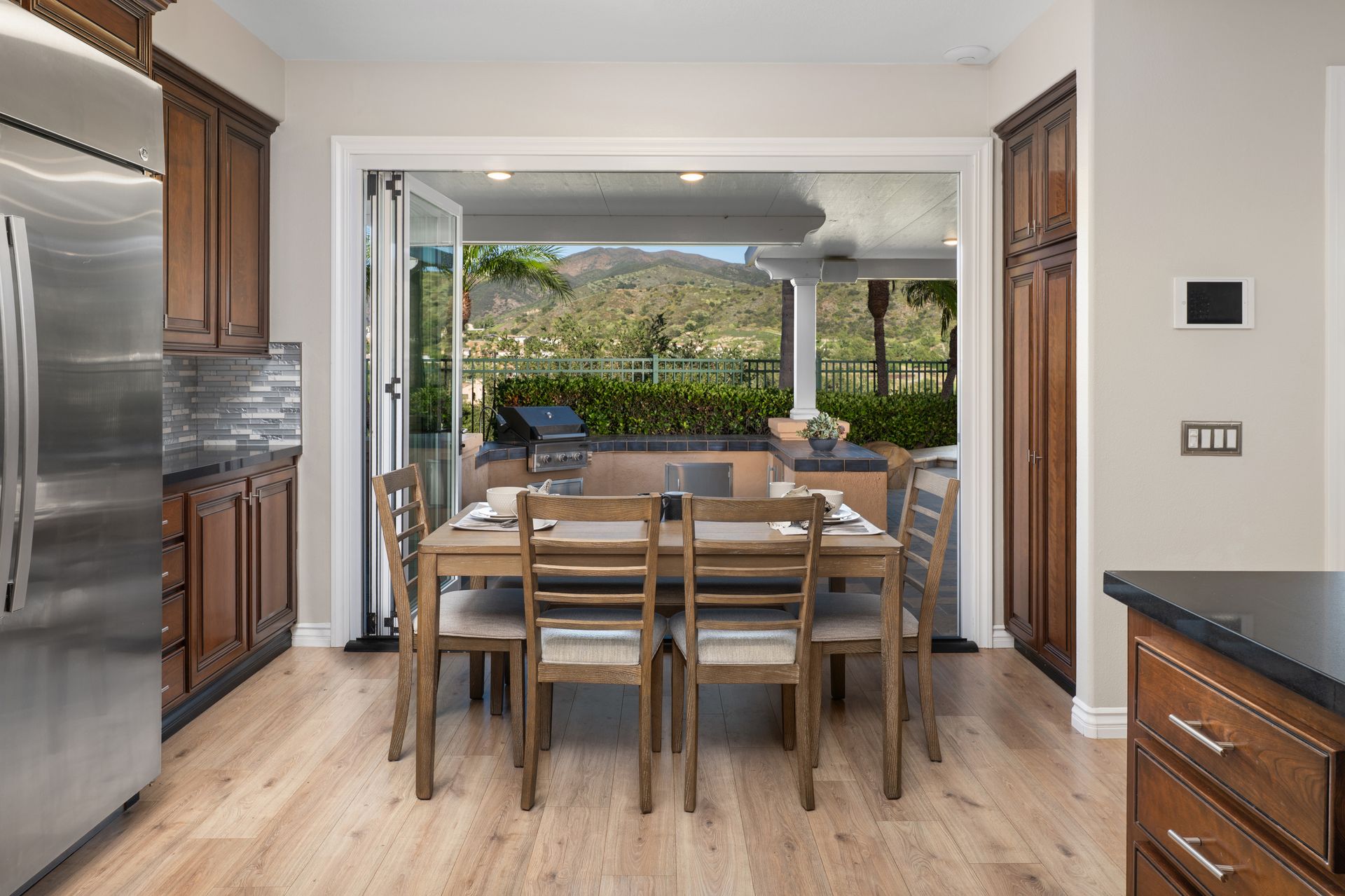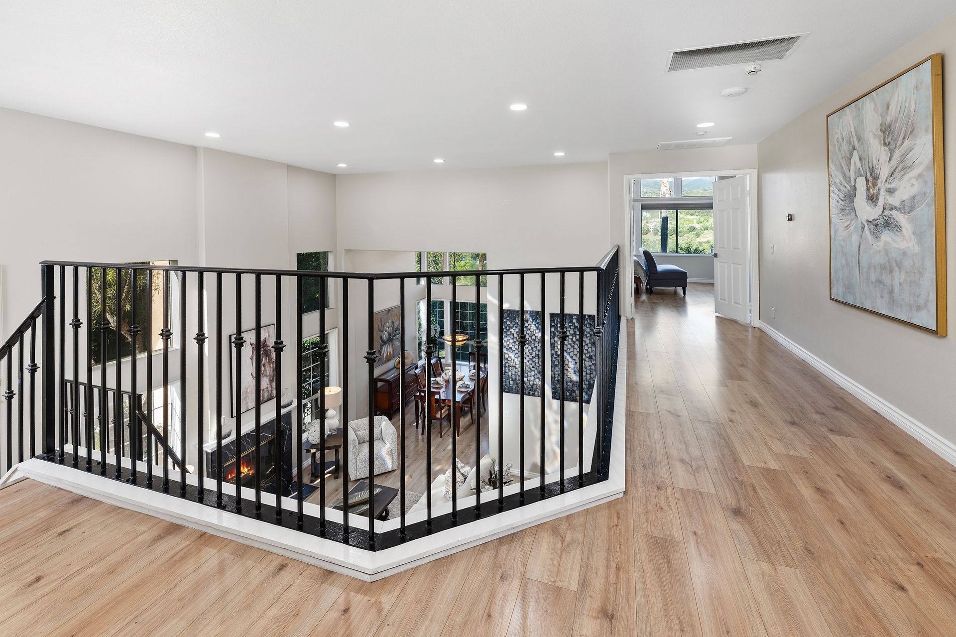 Nestled within the exclusive, guard-gated community of Dove Canyon, this wonderful Westcliff home offers some of the most spectacular views in the neighborhood. From the moment you step inside, you are greeted by a grand entrance with soaring ceilings and an abundance of natural light pouring through expansive windows. This beautifully upgraded home features four spacious bedrooms and three and a half bathrooms, including a convenient main-floor bedroom and bath—perfect for guests or multi-generational living. Three fireplaces add warmth and ambiance, while folding glass doors invite seamless indoor–outdoor living. The remodeled chef’s kitchen is a showstopper, featuring quartz countertops, decorative glass backsplash, brand-new stainless-steel appliances, and a new refrigerator. Upstairs, a versatile media/bonus room is ideal for movie nights, a home office, or a play area. Throughout the home, you will find new premium wide-plank flooring, three beautifully remodeled bathrooms, elegant wrought-iron railings, a new tankless water heater, and an included washer and dryer—every detail thoughtfully upgraded. Unwind in the luxurious primary suite, complete with a cozy fireplace, private balcony with serene canyon views, dual walk-in closets, and a spa-inspired bathroom featuring dual sinks, a walk-in shower, and a soaking tub. Step outside to your private backyard oasis, designed for relaxation and entertaining. Enjoy the spa, putting green, built-in BBQ, lush landscaping, and multiple seating areas—perfect for hosting family and friends. Residents of Dove Canyon enjoy access to resort-style amenities including a pool and spa, tennis and pickleball courts, tot lot, basketball court, and 24-hour security. Optional membership to the prestigious Dove Canyon Golf Club offers a Jack Nicklaus–designed course, fitness center, dining, and social events, enhancing the exceptional lifestyle this home provides.