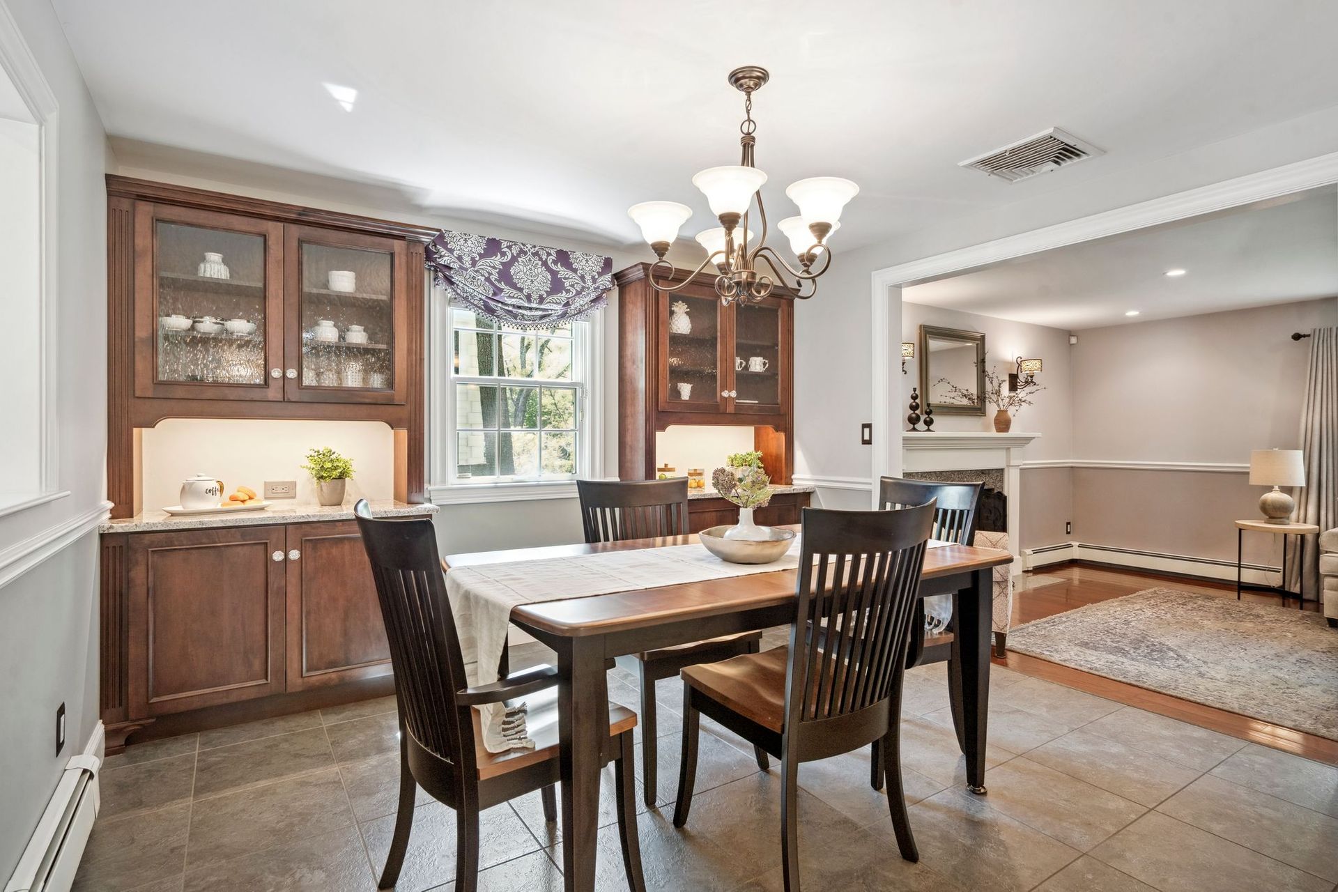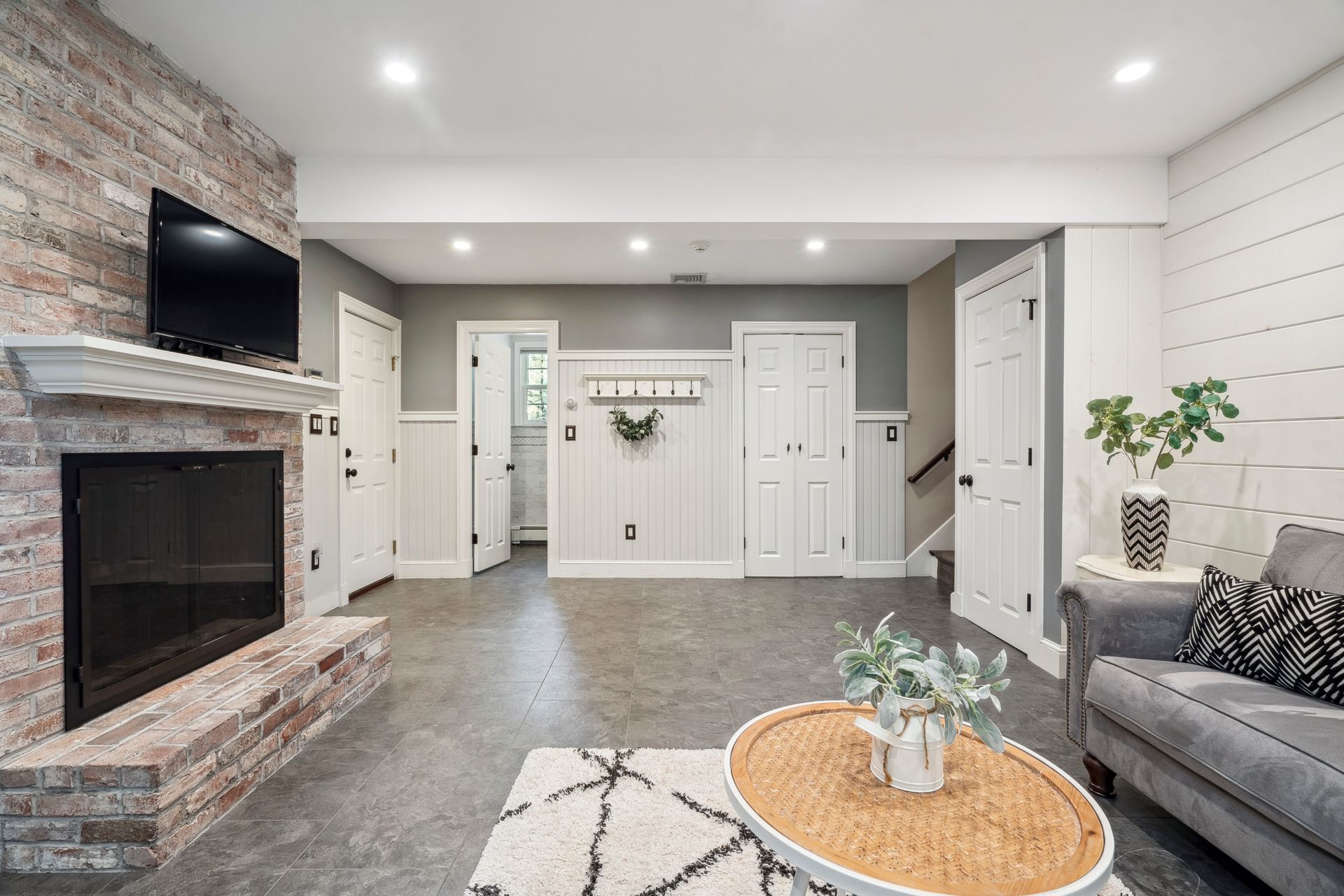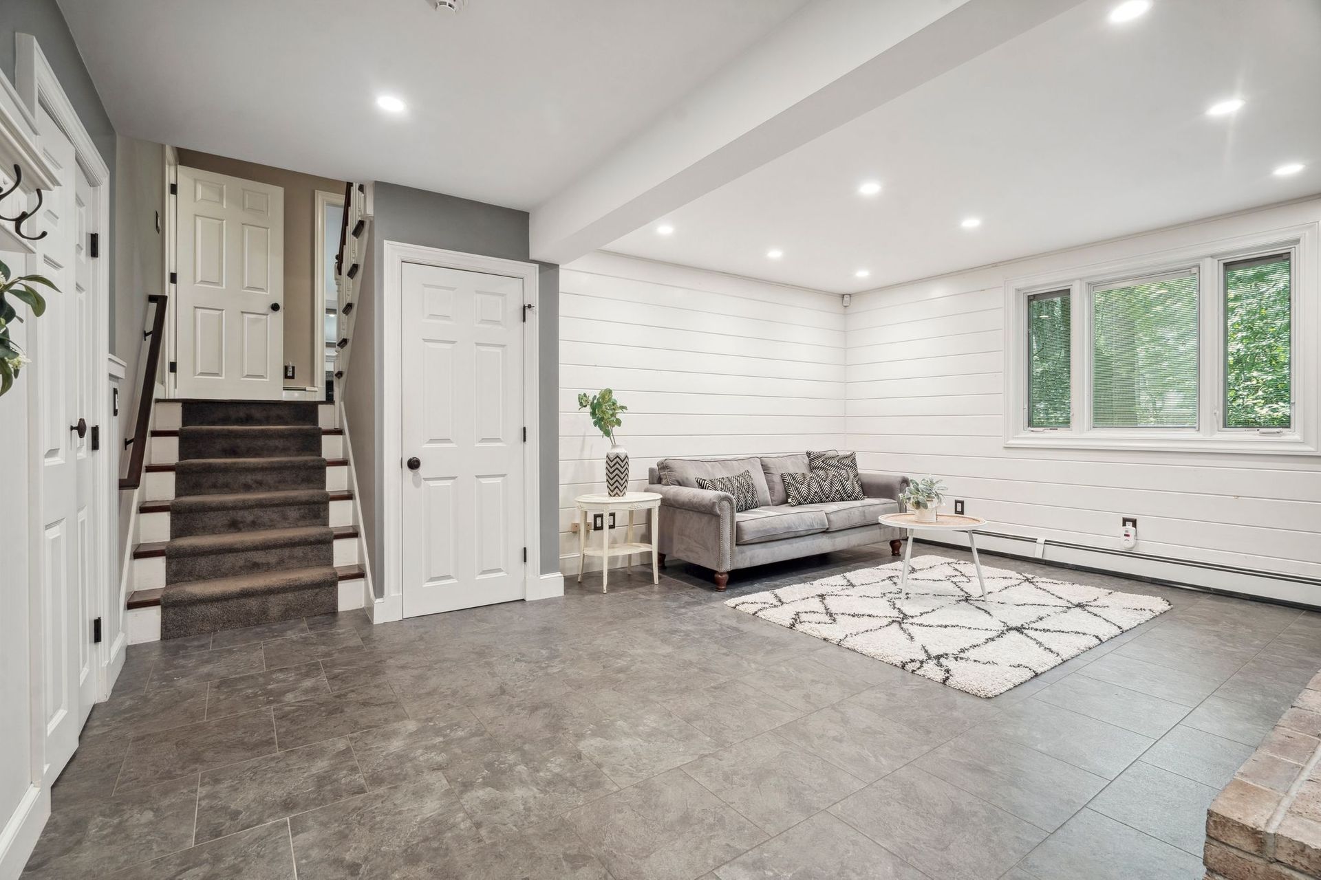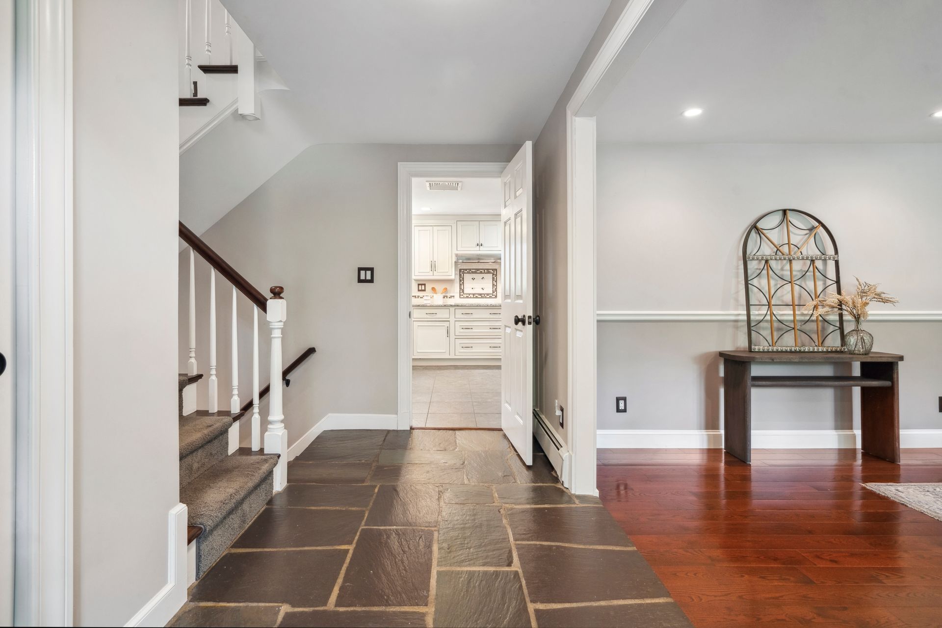 On the second floor, the private primary suite boasts an ensuite bathroom and bonus room, perfect for a walk-in closet or office. Four additional generously sized bedrooms and two well-appointed guest baths complete the upper levels. The lower level features a stylishly updated family room with shiplap walls and custom built-ins, along with a convenient updated 1/2 bathroom, laundry area with custom cabinetry, and two car garage. A sizable basement provides extensive storage and Buderus heating system. Close to major routes & shopping and dining at Market Street!