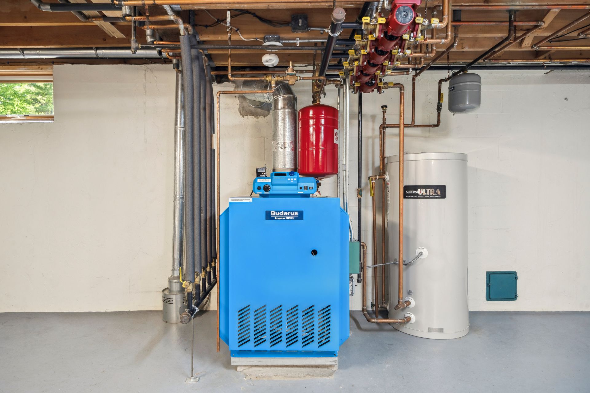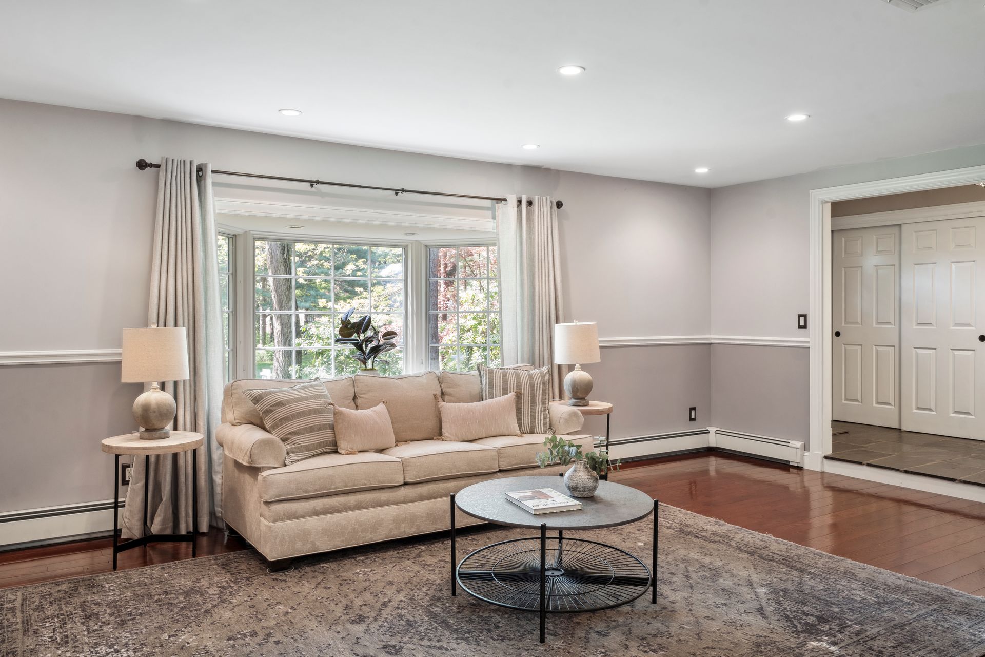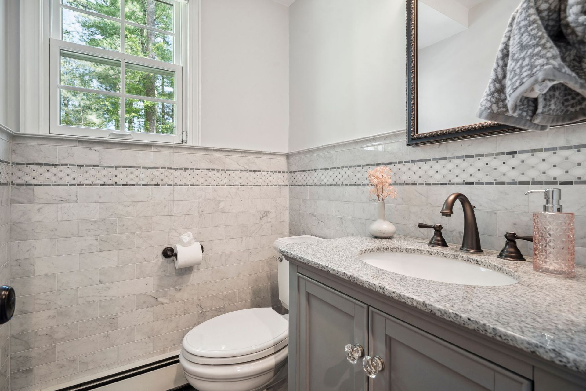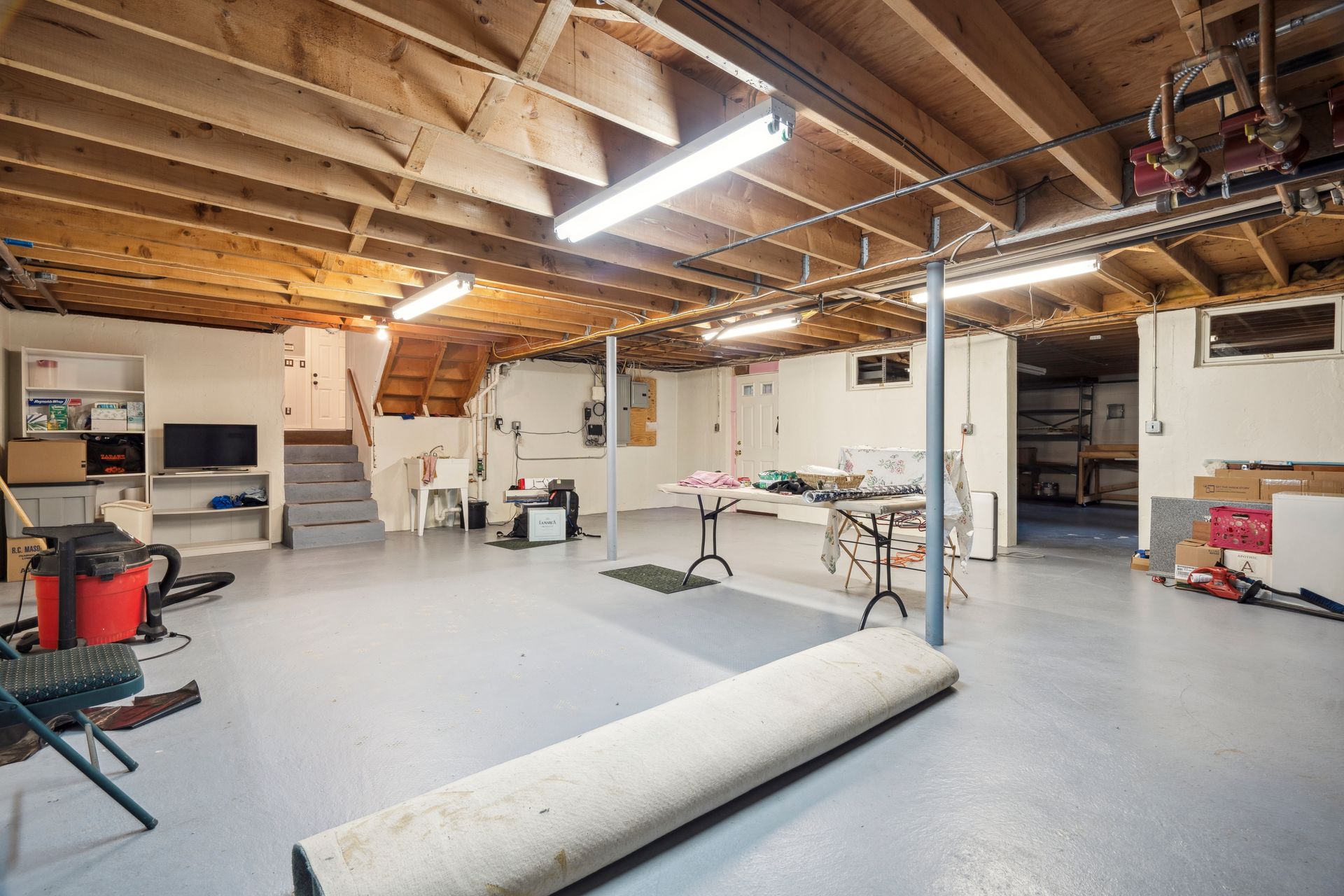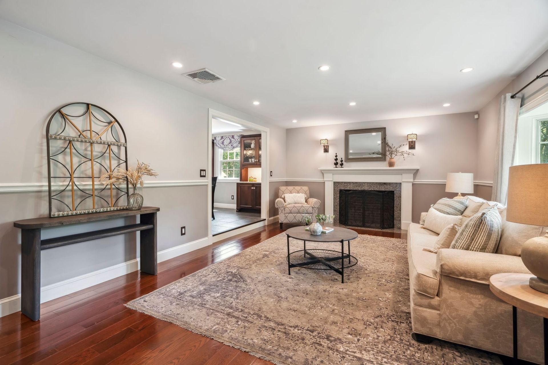 On the second floor, the private primary suite boasts an ensuite bathroom and bonus room, perfect for a walk-in closet or office. Four additional generously sized bedrooms and two well-appointed guest baths complete the upper levels. The lower level features a stylishly updated family room with shiplap walls and custom built-ins, along with a convenient updated 1/2 bathroom, laundry area with custom cabinetry, and two car garage. A sizable basement provides extensive storage and Buderus heating system. Close to major routes & shopping and dining at Market Street!