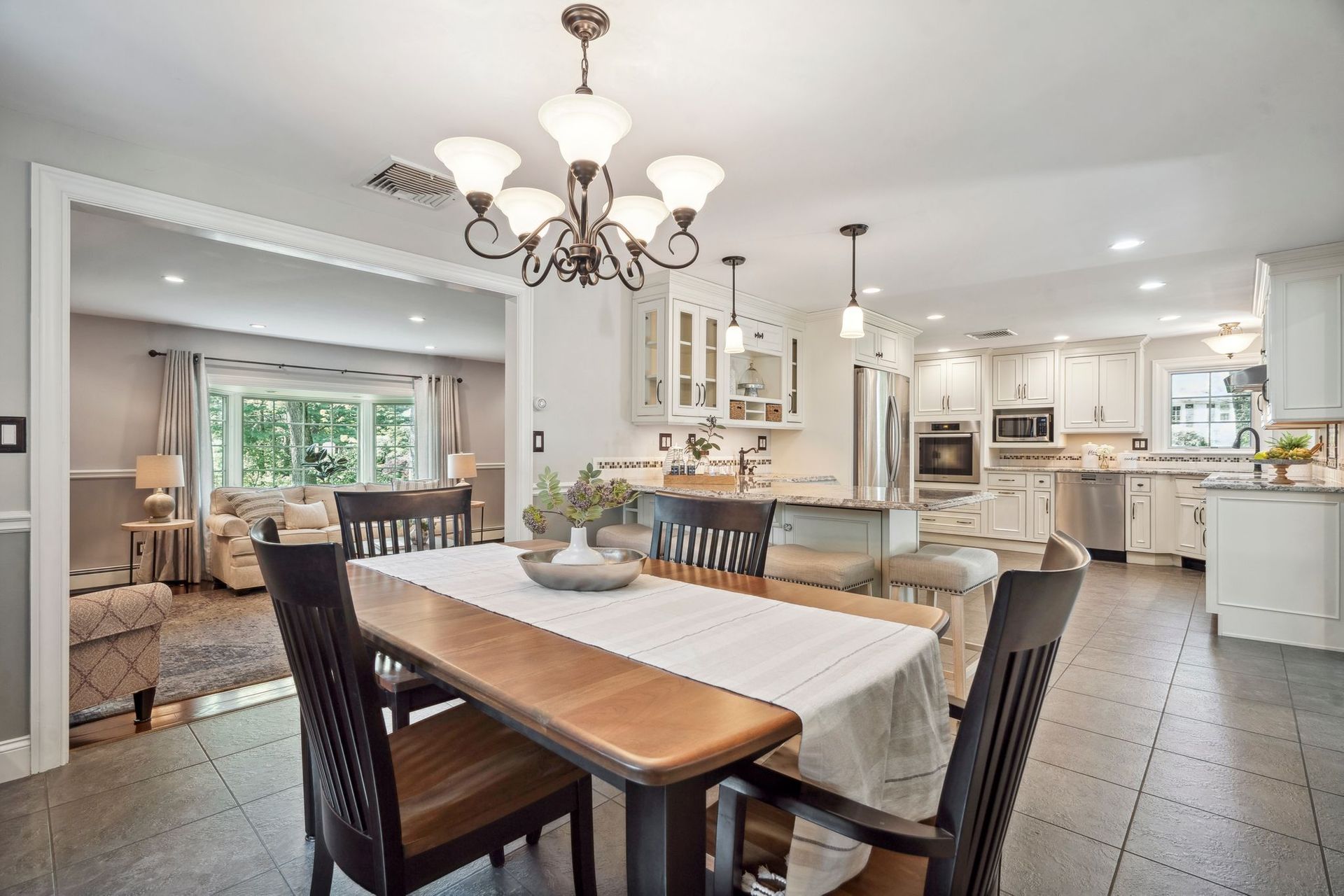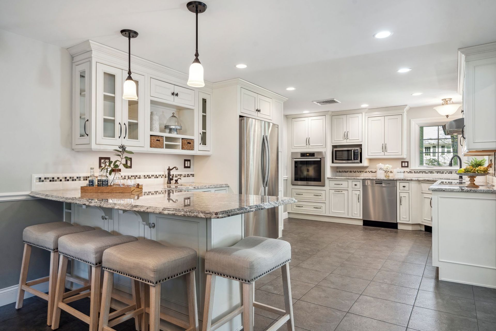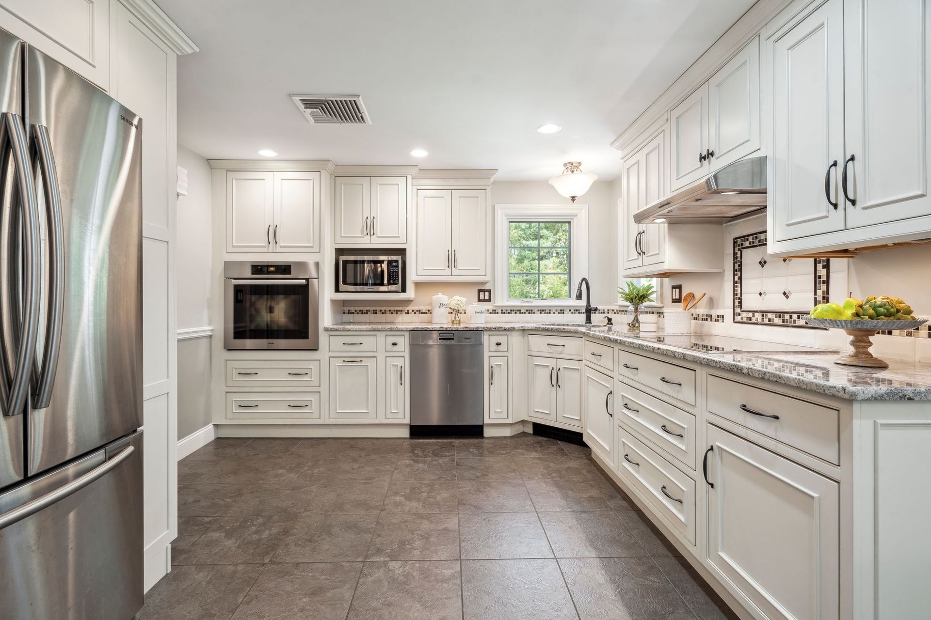 Nestled on a cul-de-sac, this exceptional multilevel home offers five bedrooms and 3.5 baths, thoughtfully designed for comfort and entertaining. The open-concept first floor welcomes you with a formal living room featuring a cozy fireplace, leading into a stunning eat-in chef’s kitchen equipped with high-end appliances, custom white cabinetry, prep sink and granite countertops. The kitchen seamlessly flows into a vaulted-ceiling family room, offering access to a spacious composite deck and serene backyard—an ideal space for gatherings and outdoor enjoyment.
