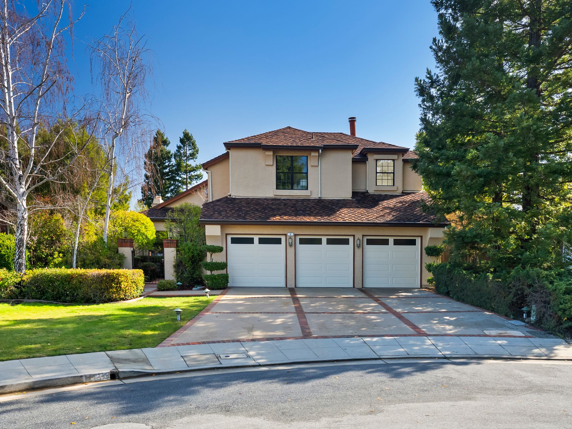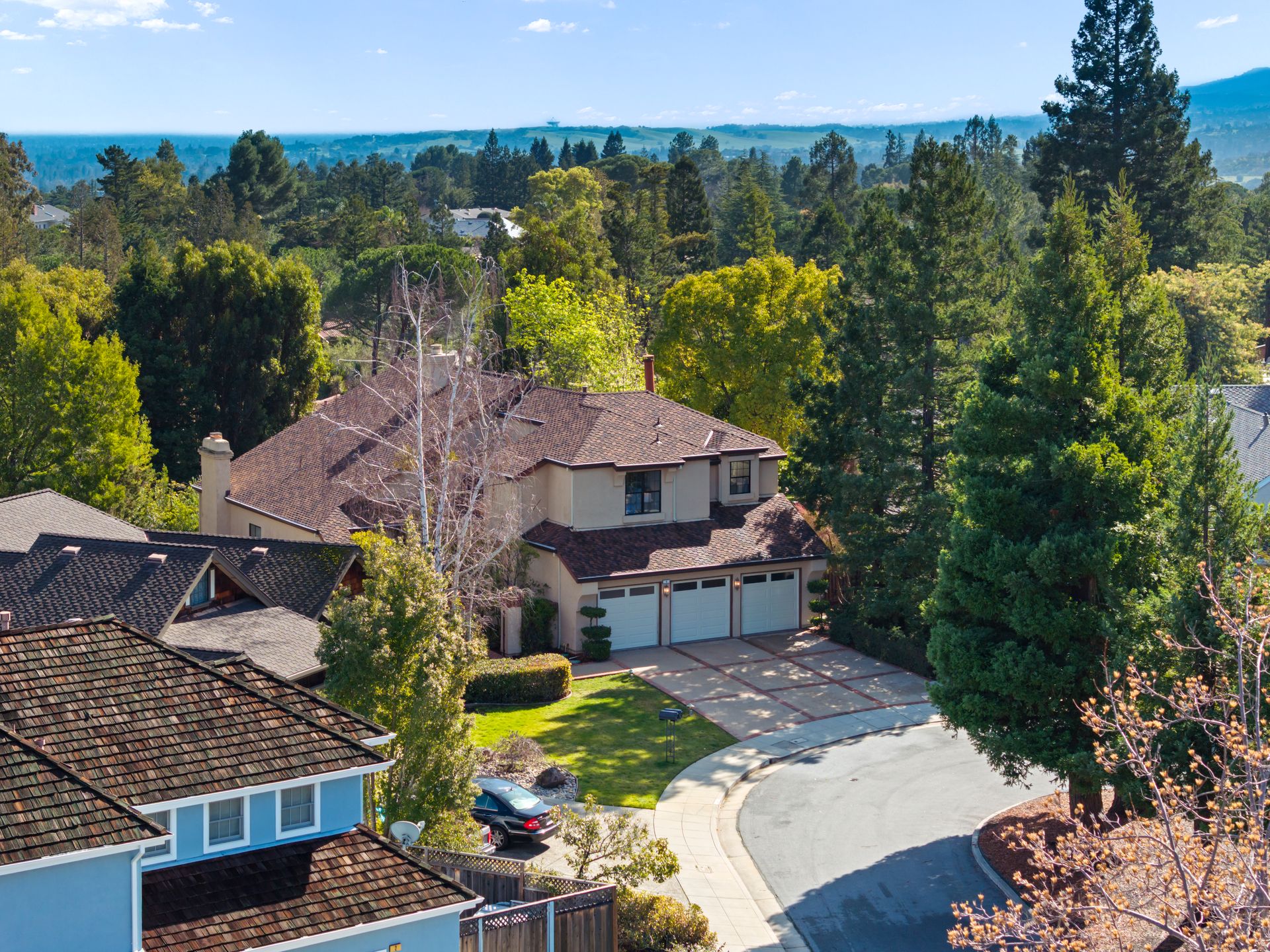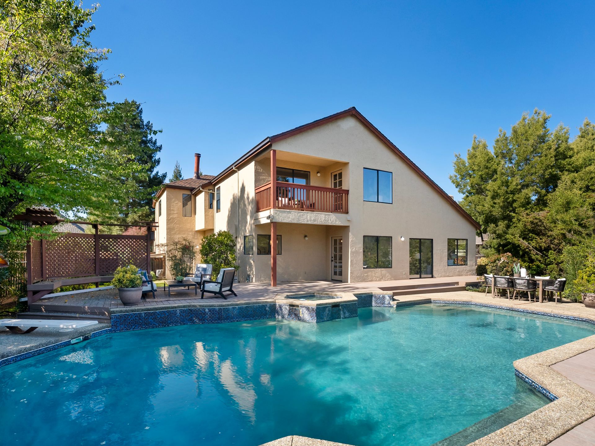 The primary suite features its own fireplace with a comfortable sitting area, two walk-in closets, dual vanities, a true soaking tub, and a separate stall shower. Large windows frame peaceful views of the backyard and beyond towards Woodside Hills, while a private balcony offers a tranquil space to enjoy morning coffee and sunrises.