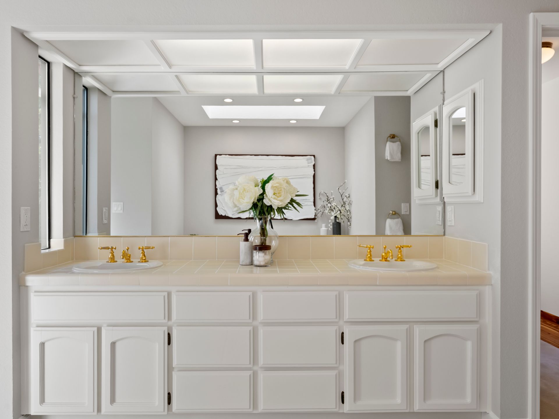 A separate bedroom wing provides two generously sized bedrooms, and hall bathroom complete with dual sinks and a shower-over-tub.