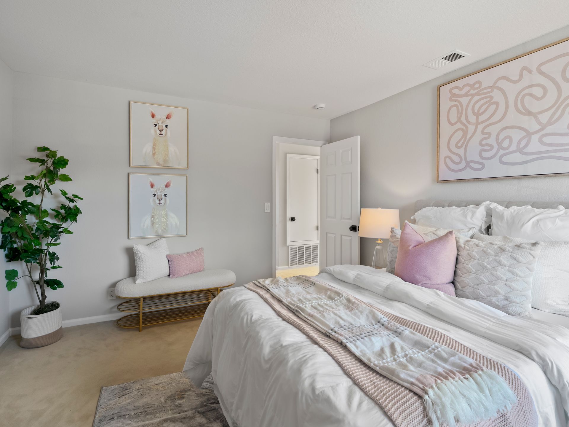 An elegant arched entryway reminiscent of classic architecture gracefully leads into the family room. Here, a warm fireplace anchors the space while a sliding glass door opens seamlessly to the side yard. The dedicated laundry room adds everyday convenience and access to the 3-car garage. A versatile ground floor bedroom and adjacent bathroom featuring dual sinks and a shower-over-tub is perfect for a home office or guest suite.