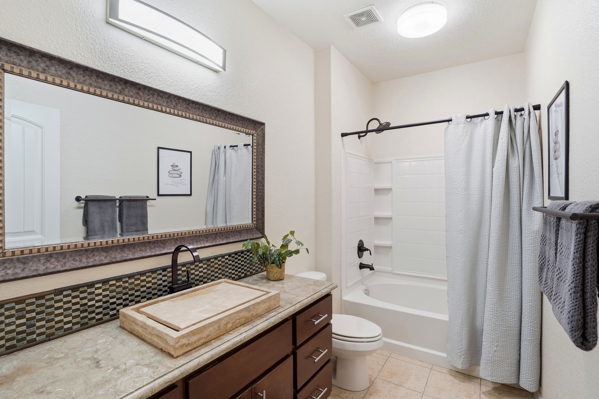 A welcoming foyer opens to the home’s well-planned layout, beginning with a convenient powder room and an open, upgraded kitchen featuring solid-surface countertops, reflective backsplash, a galor of cabinetry and a central island. Barely used appliances in the kitchen and laundry room complement the sparkling kitchen, creating a space that is both functional and elegant. The kitchen flows seamlessly into sun-filled dining and living areas, wrapped in a neutral color palette that feels warm, airy, and inviting.