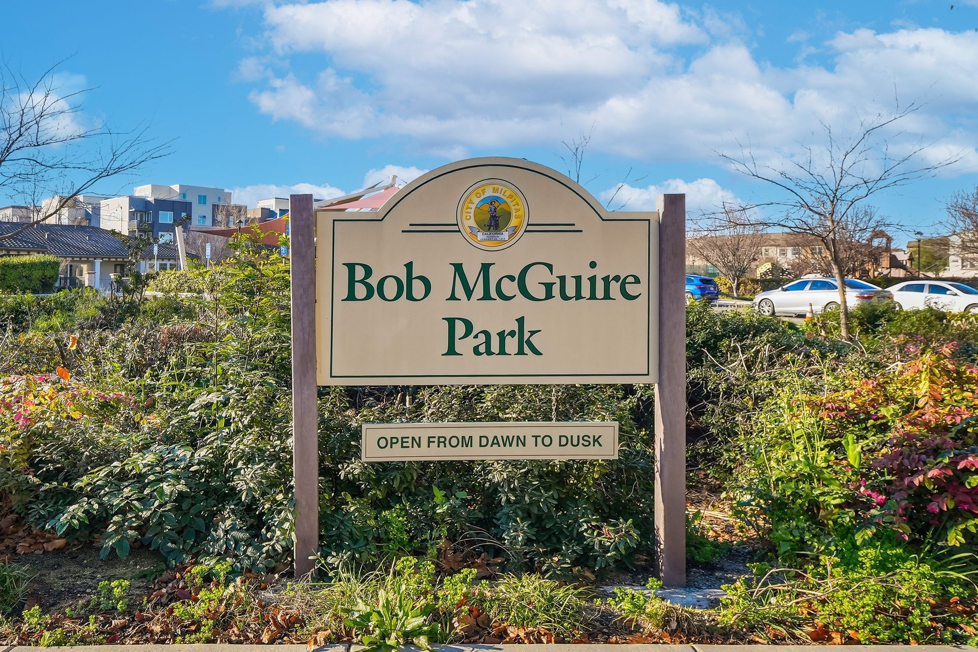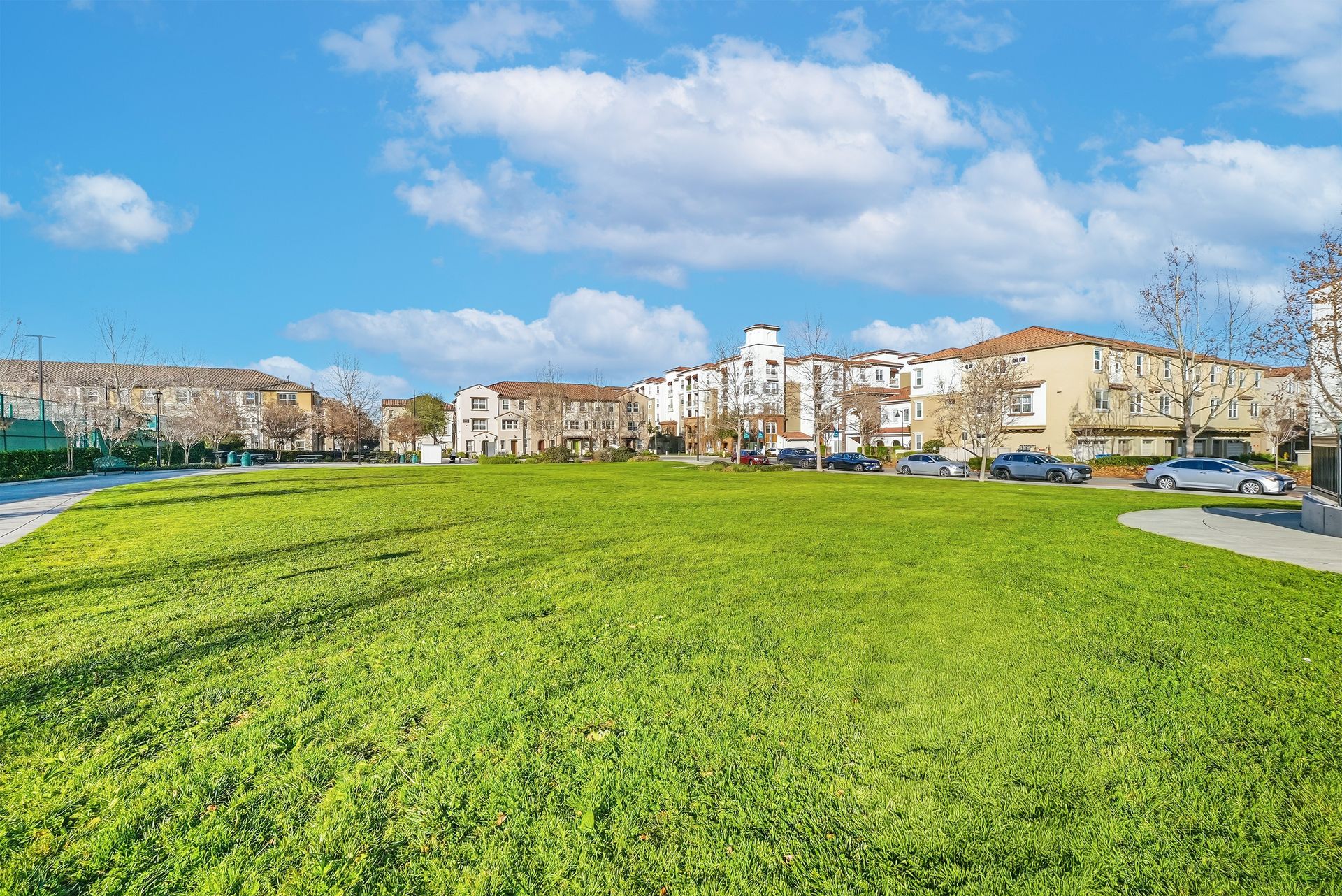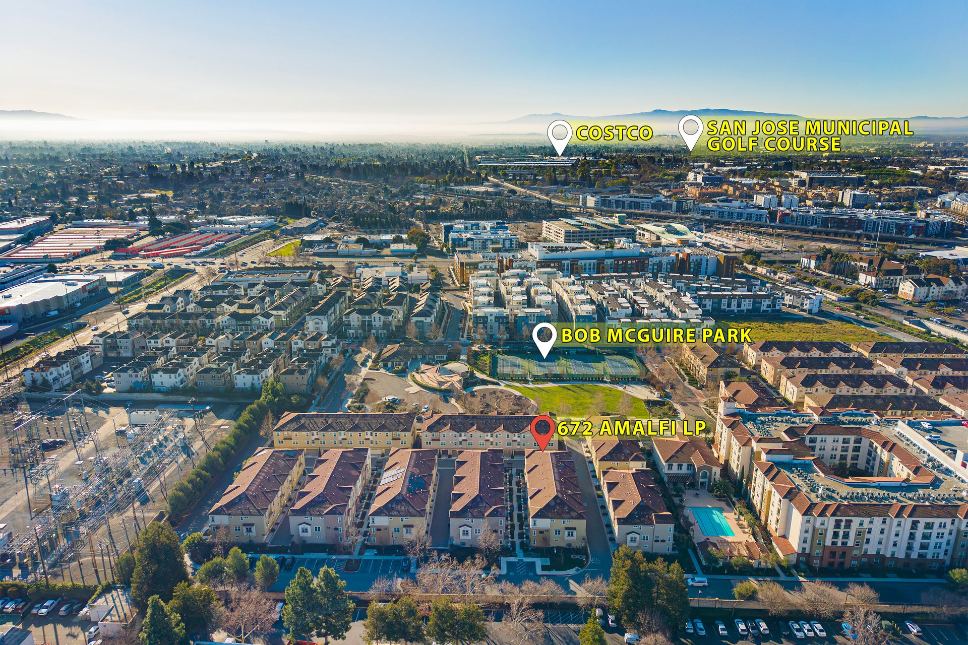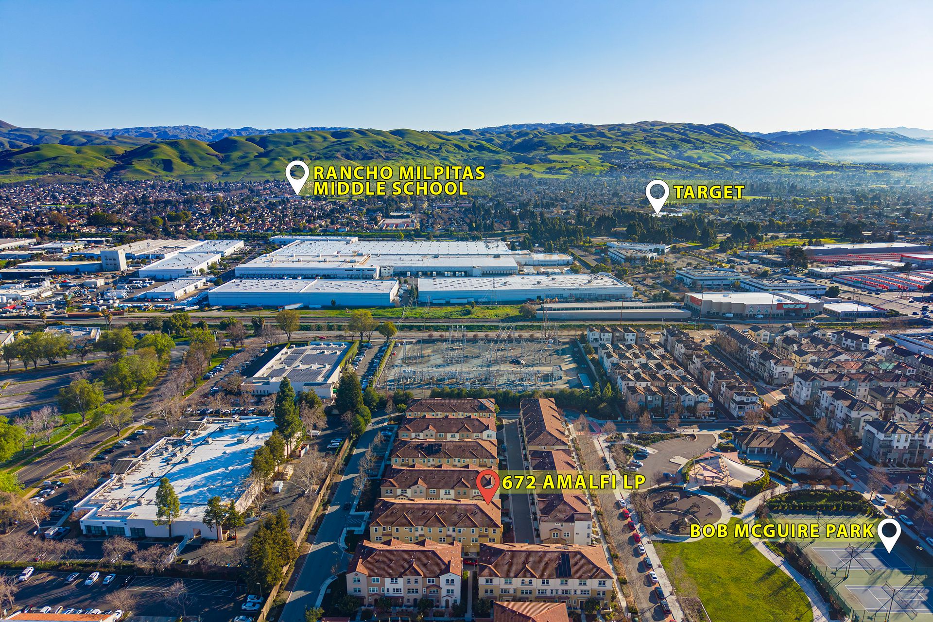 Nestled in a prime east-facing corner location with views of Bob McGuire Park, this stunning townhome offers luxury living in the highly sought-after Siena community. Built in 2019 and featuring the largest floor plan, this nearly new 3-beds, 3.5-baths residence spans approximately 1,988 sq ft and is filled with natural light, 9-foot ceilings, and an open-concept layout. The first level offers a versatile bonus room with a half bath and laundry closet, ideal for a home office or gym. The main living level features a spacious living and dining area and a gourmet stadium-style kitchen with premium cabinetry, white quartz countertops, large island, mosaic backsplash, and stainless steel Italian Bertazzoni appliances (Free standing gas range, Microwave dishwasher and refrigerator). A bedroom with a full bath on this level adds flexibility. The top level includes two private bedroom suites, highlighted by a luxurious primary retreat with a walk-in closet and spa-like bath with dual sinks and a glass-enclosed shower. Walk to Bob McGuire Park with tennis courts, playground, BBQ area, and amphitheater. Close to Milpitas BART, 680/880/237, Great Mall, Trader Joe’s, Safeway, dining, and top-rated schools: Mabel Mattos Elementary, Rancho Milpitas Middle, and Milpitas High School.