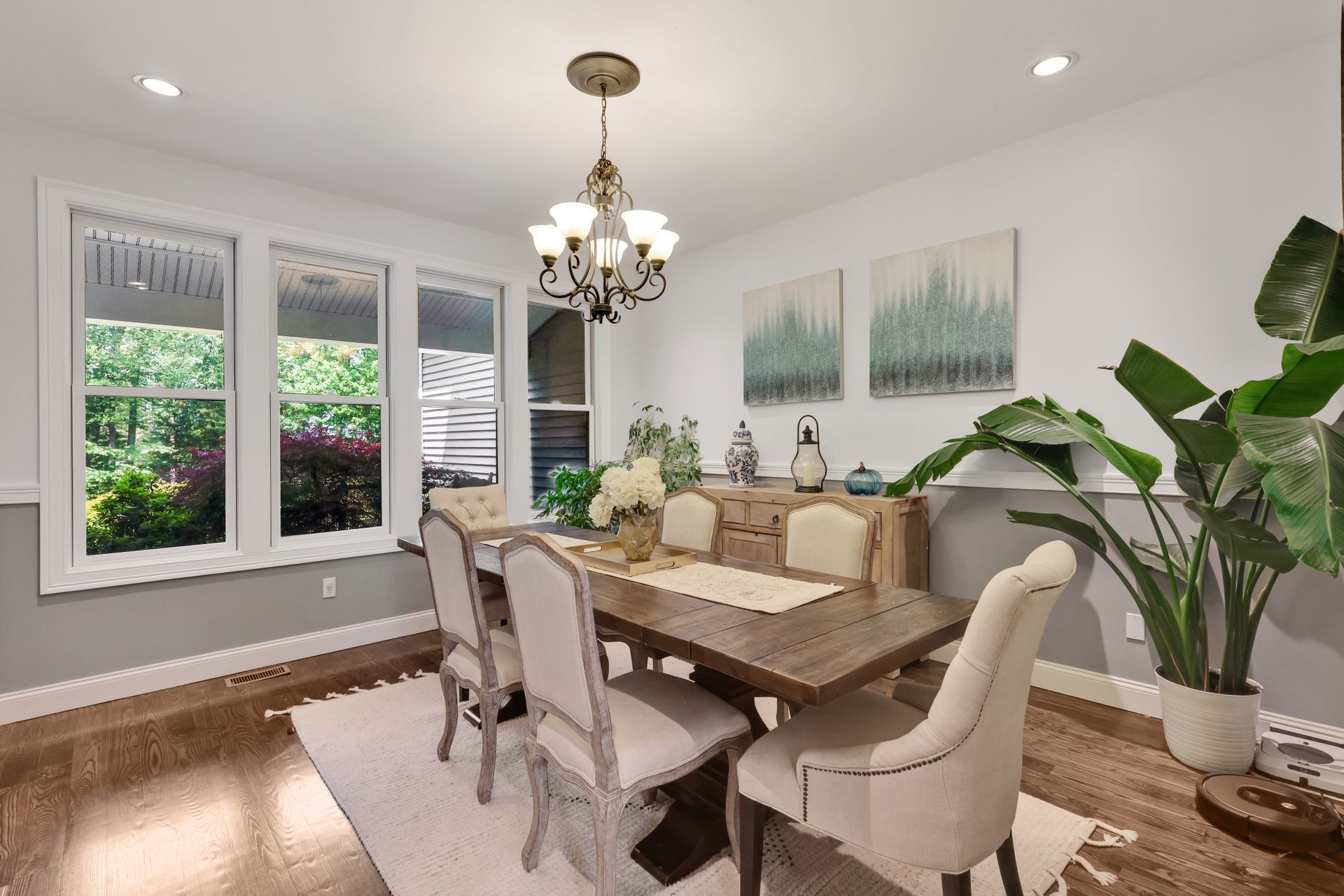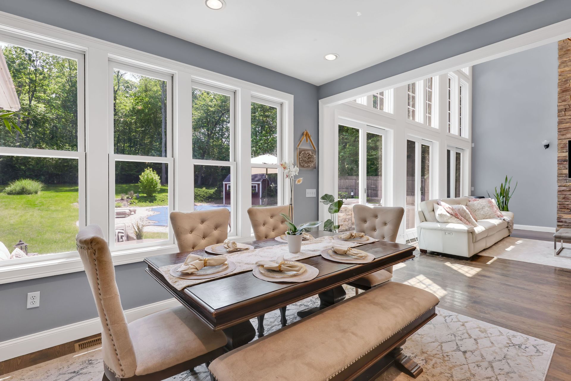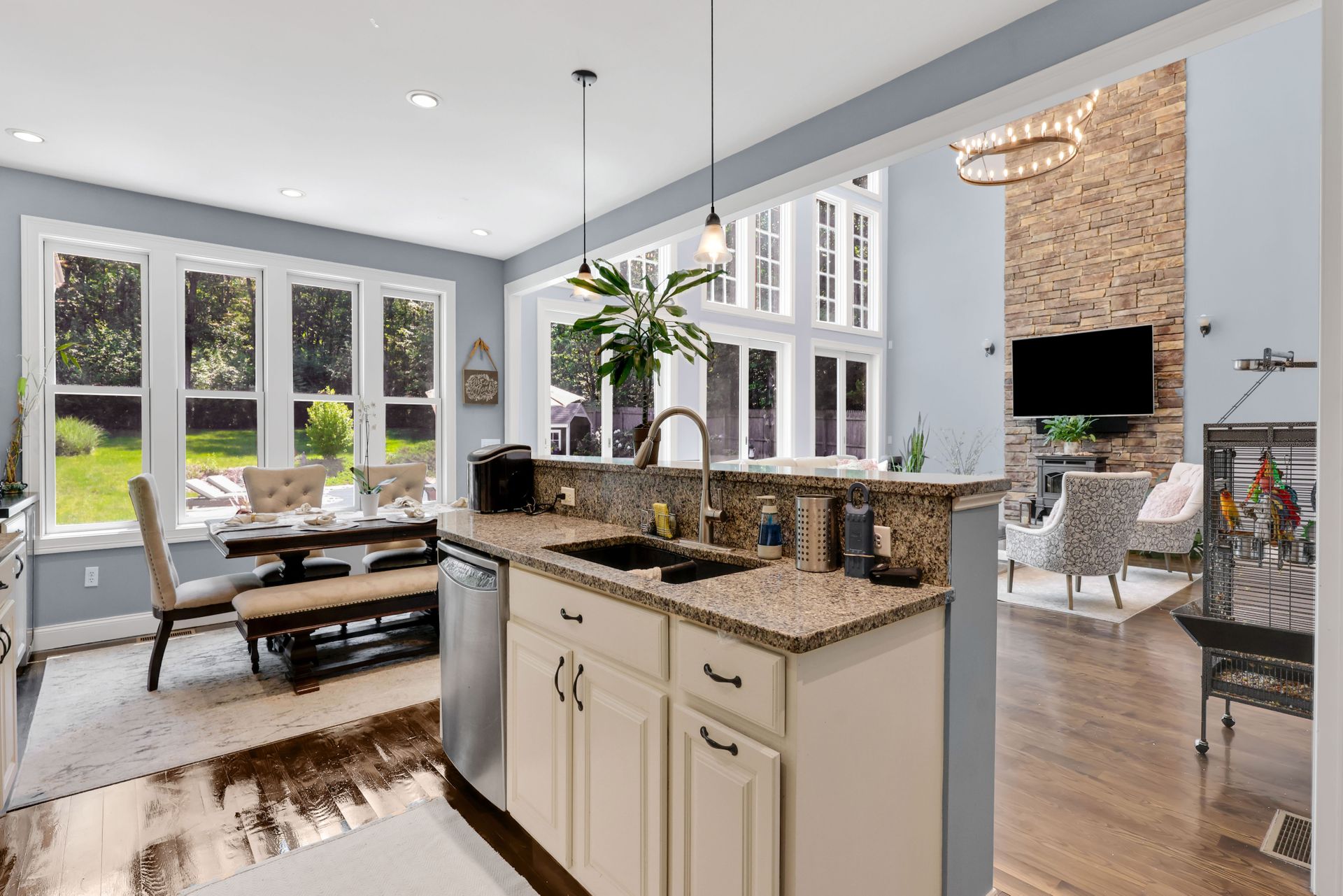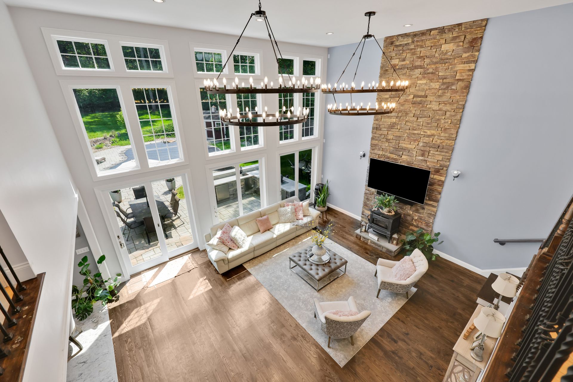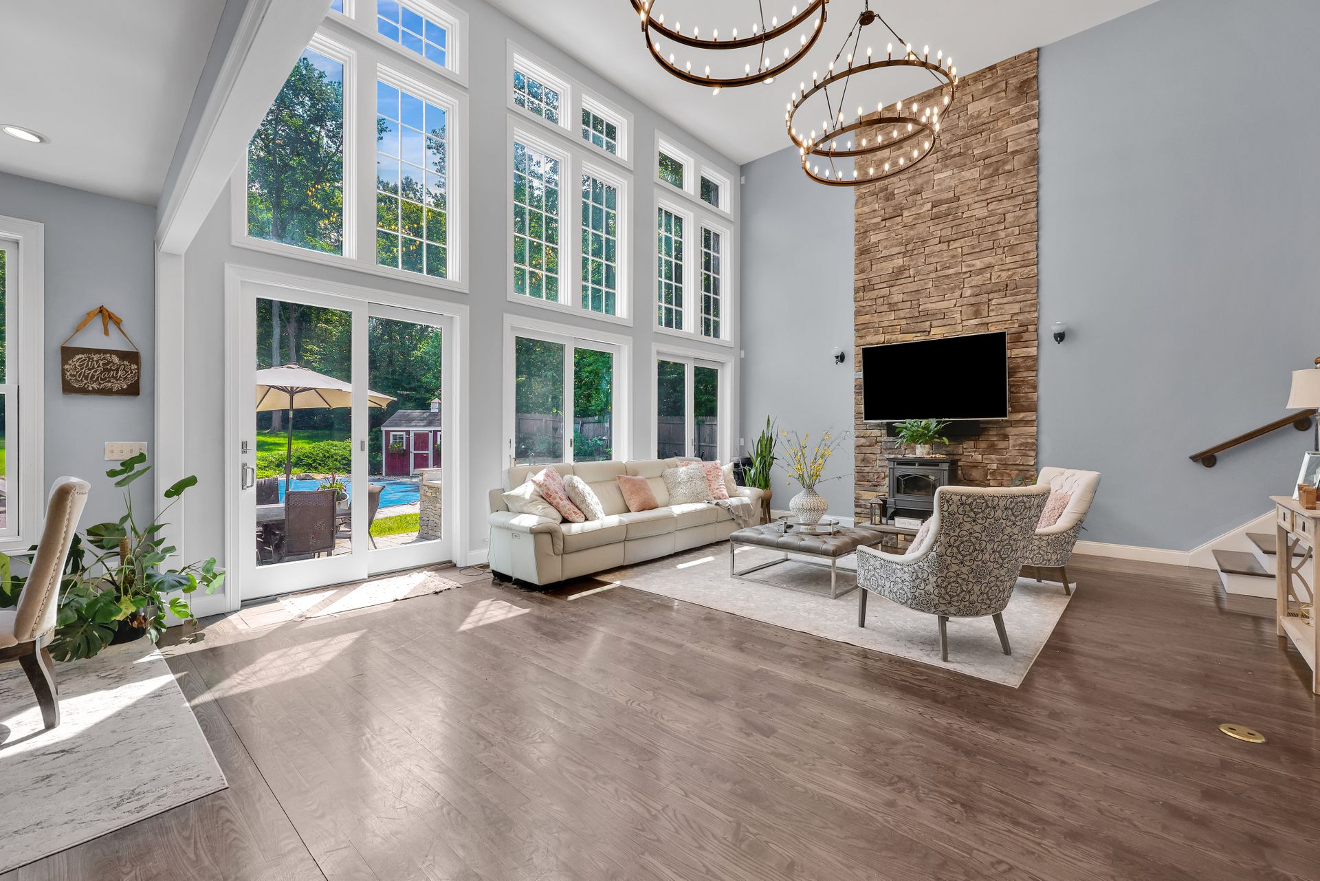 Step inside and experience a sense of grandeur. The expansive Great Room, kitchen, and dining area flow together in an impressive open-concept design, featuring soaring 16-foot ceilings, two-story windows that flood the space with natural light, and magnificent chandeliers that make a lasting impression.