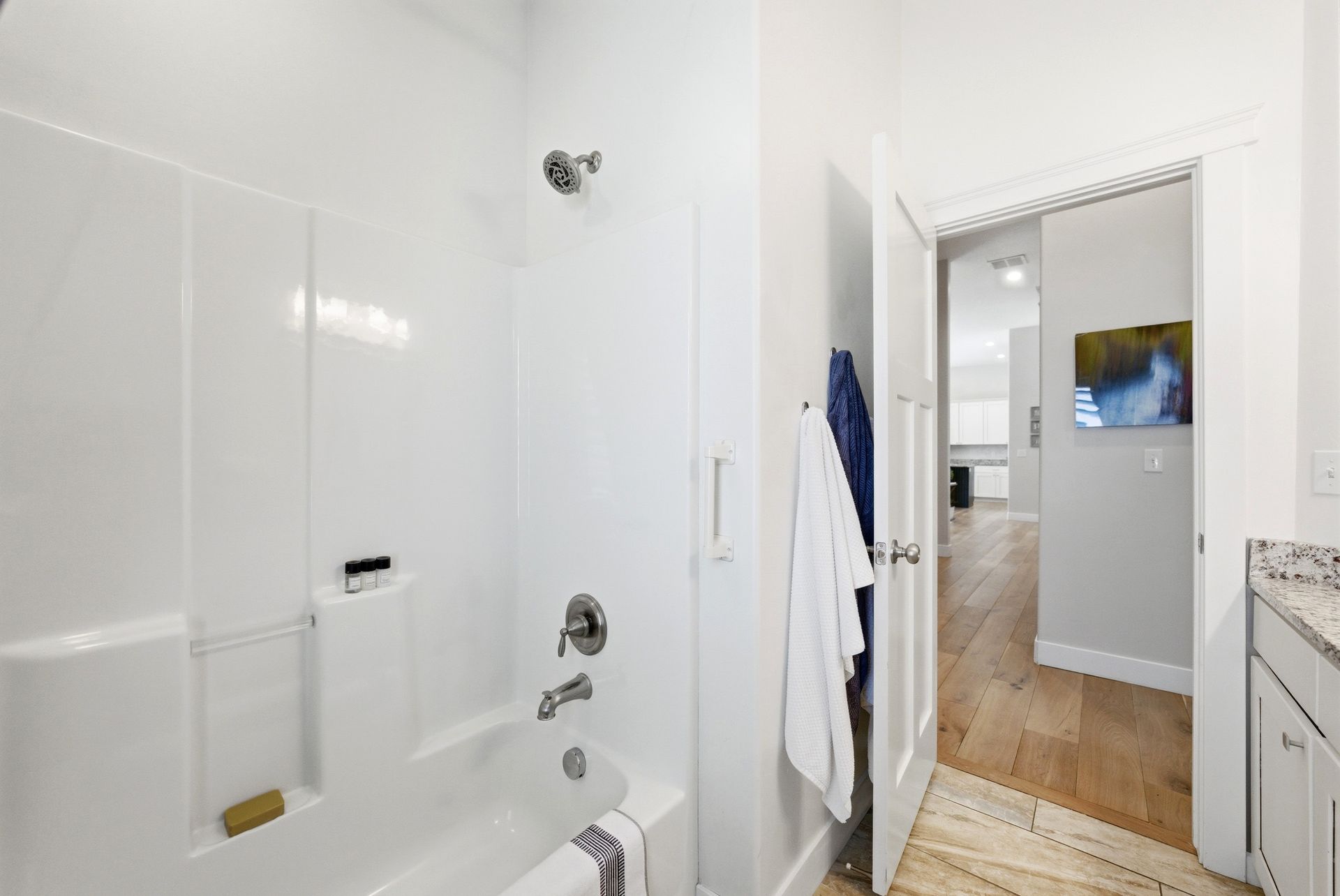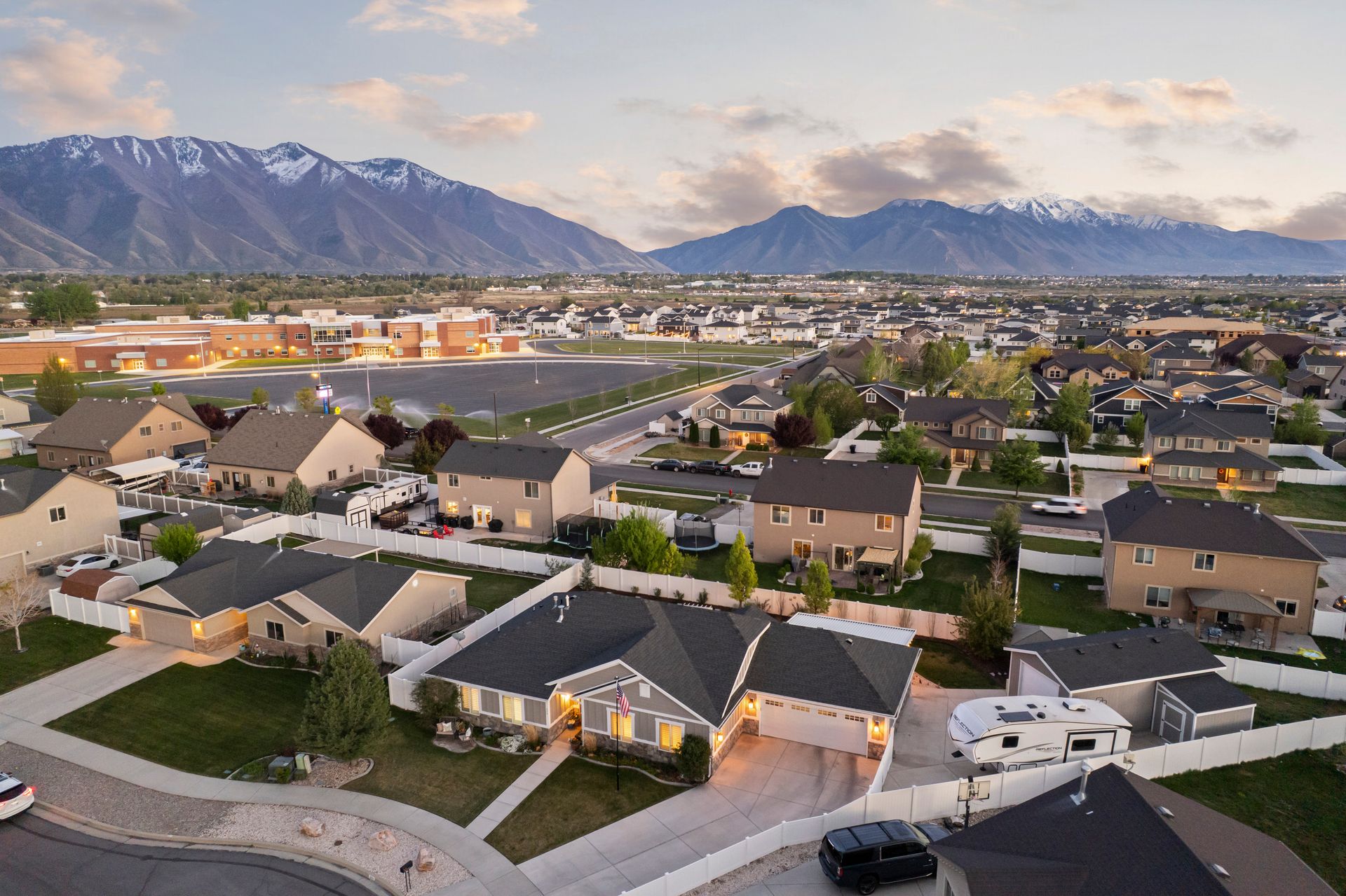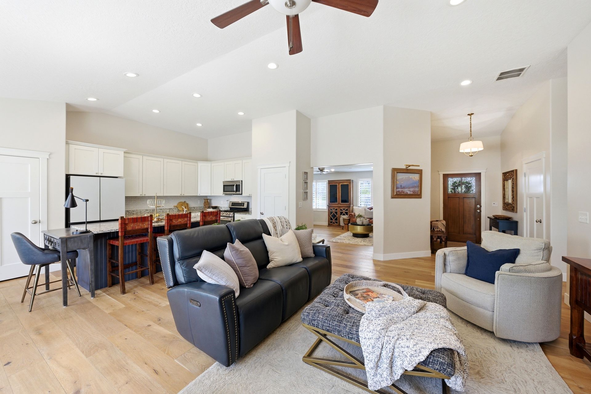 Immaculate, sun-filled Craftsman-style home that blends charm, quality, and functionality with easy one-level living. This beautifully maintained residence features vaulted ceilings throughout, including all three bedrooms, creating an airy and spacious feel. The open-concept main living area is perfect for both everyday living and entertaining. The kitchen is thoughtfully designed with custom cabinetry, granite countertops, a center island, plus two pantries. Just off the main living space, the home opens to a large back patio ideal for outdoor dining, gatherings, or simply relaxing in your fully fenced and landscaped backyard. A backyard gazebo, already wired for a hot tub, is the perfect place to sit back, relax, and take in the mountain views. An additional great room offers exceptional flexibility, whether as a second living space, home office, or media room. You'll also appreciate the quality details throughout, including plantation shutters, updated flooring, and recessed lighting. The home is wired and plumbed for both gas and electric appliances, including the kitchen range and dryer. Built-in humidifier and a Radon Mitigation system offer comfort and peace of mind. Completing the package is a finished extra-large third-car garage (30x16), attached two-car garage (24x24), and dedicated RV parking (potentially up to 35-feet - currently a 27-foot 5th wheel fits easily with the gates closed). This is a rare opportunity to own a move-in-ready home in one of Springville's most desirable locations, plus the new Buc-ee's!