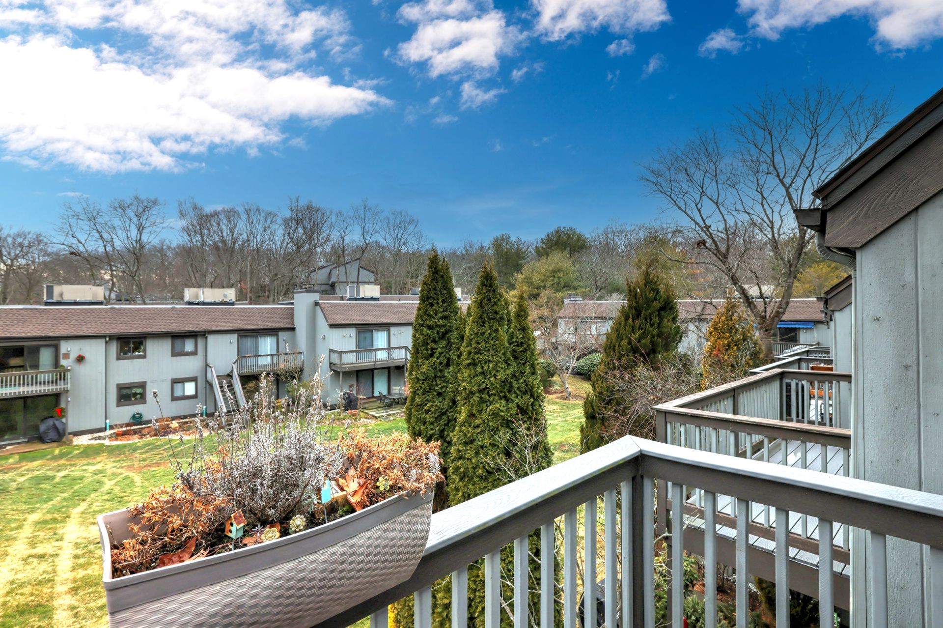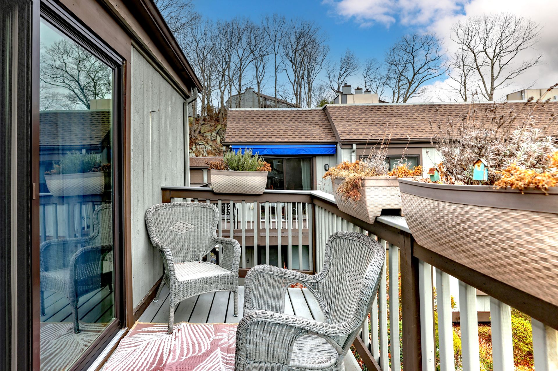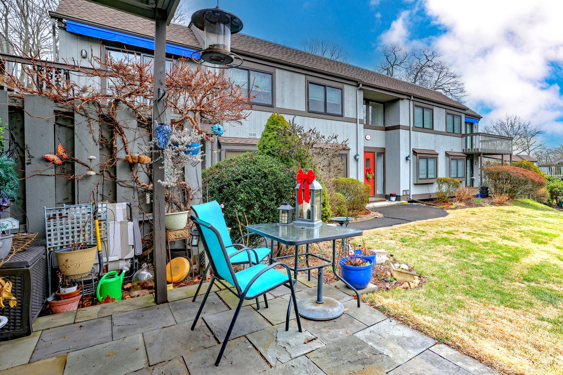 The open living room/dining room layout includes a fireplace and a sliding door that opens to a private, sun-filled patio, great for relaxing or entertaining. Upstairs, the primary bedroom features its own slider to a private porch with southern exposure, a private full bath, and generous closet space. A second large bedroom offers double closets, and an additional full bath serves the second floor. Laundry is conveniently located between the bedrooms, while a powder room on the first floor adds everyday functionality.