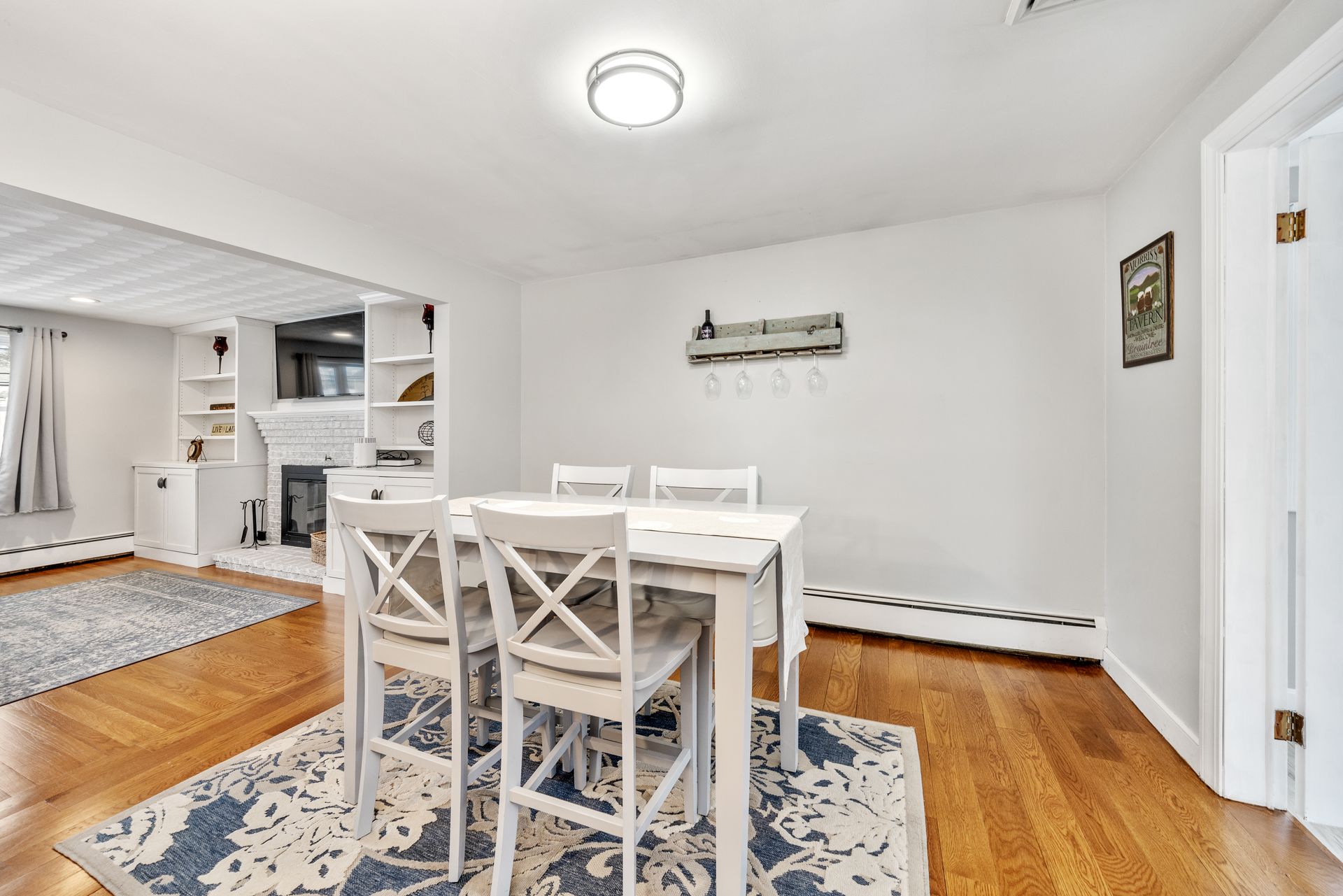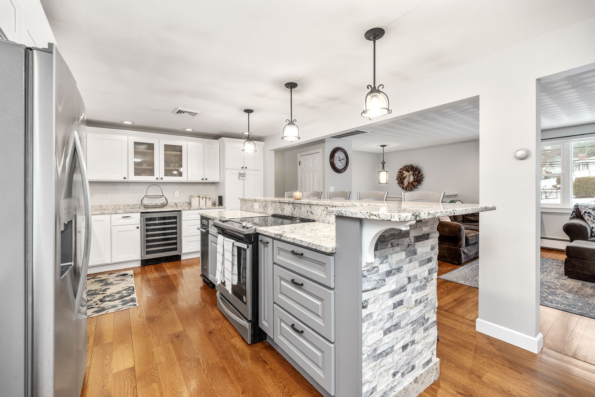 The open main level is designed for both comfort and connection, featuring an updated eat-in kitchen with stainless steel appliances, a beverage refrigerator, and a large island with seating for five, seamlessly flowing into the fireplaced living room. On warmer days, step from the dining area into the sunroom and out onto the deck overlooking a private, level backyard that borders peaceful wooded views.