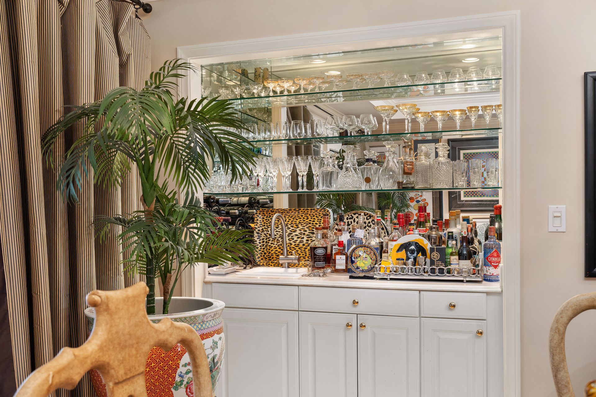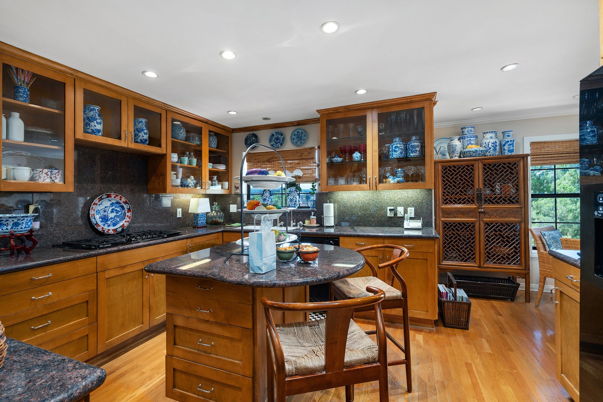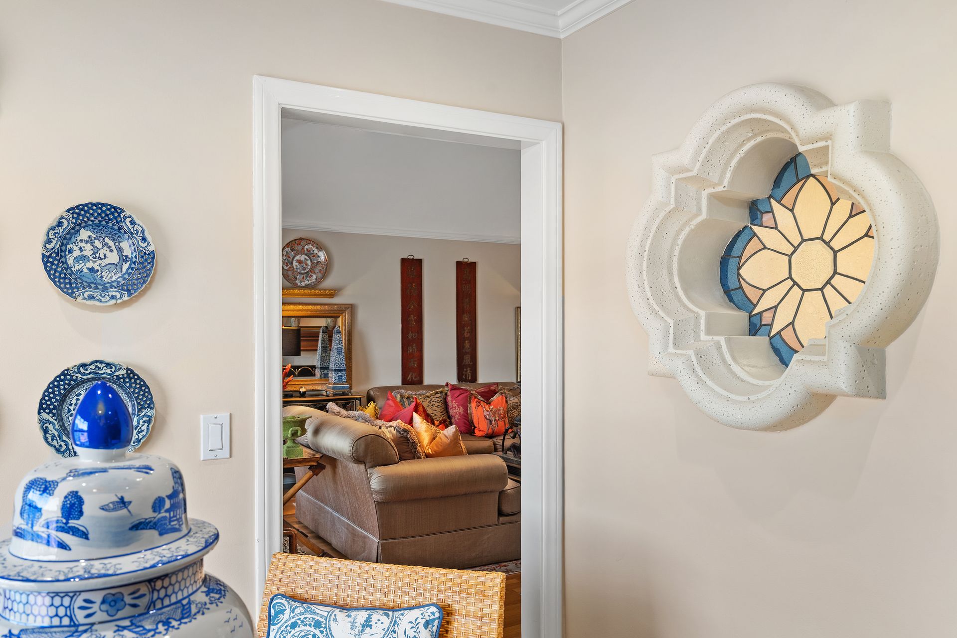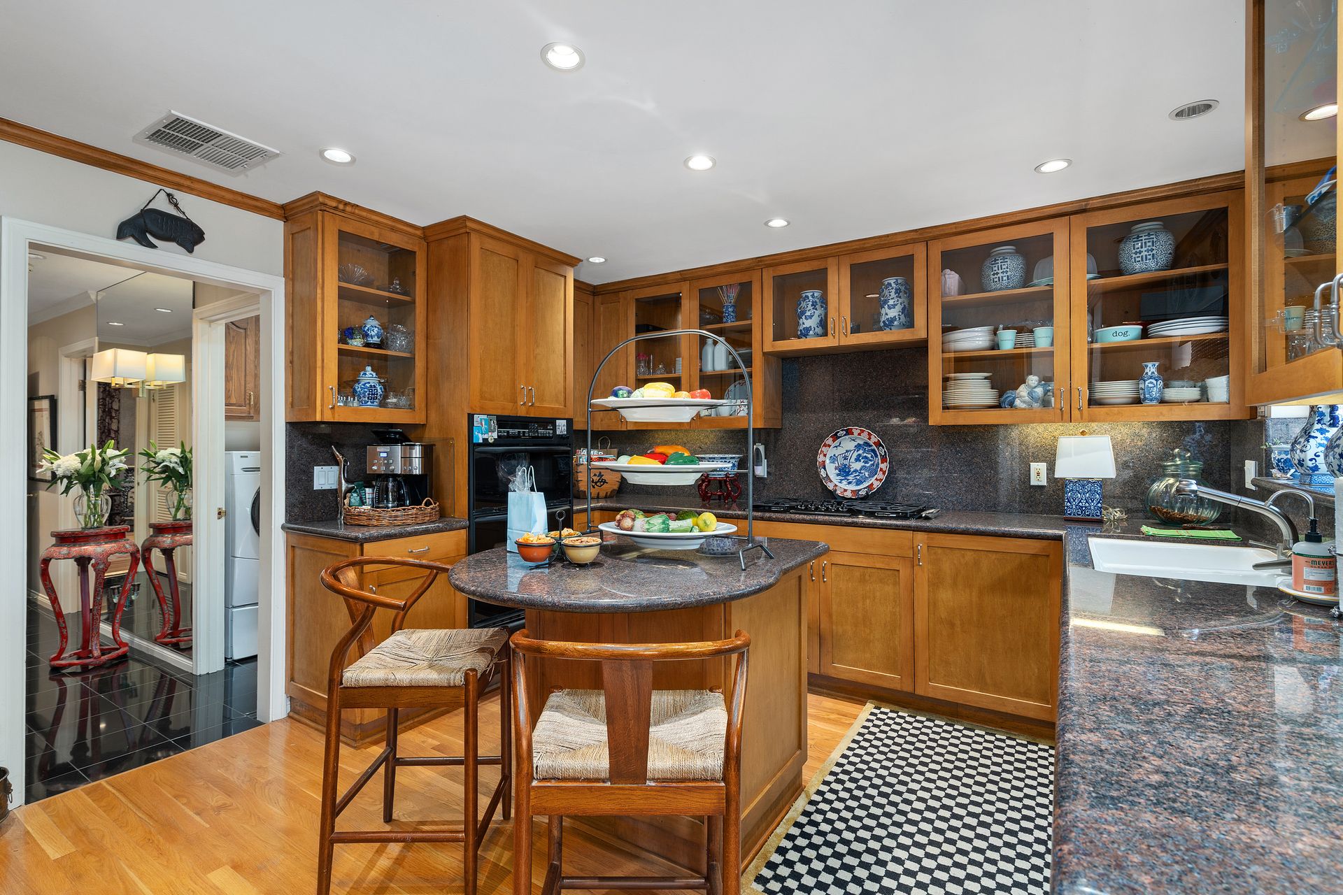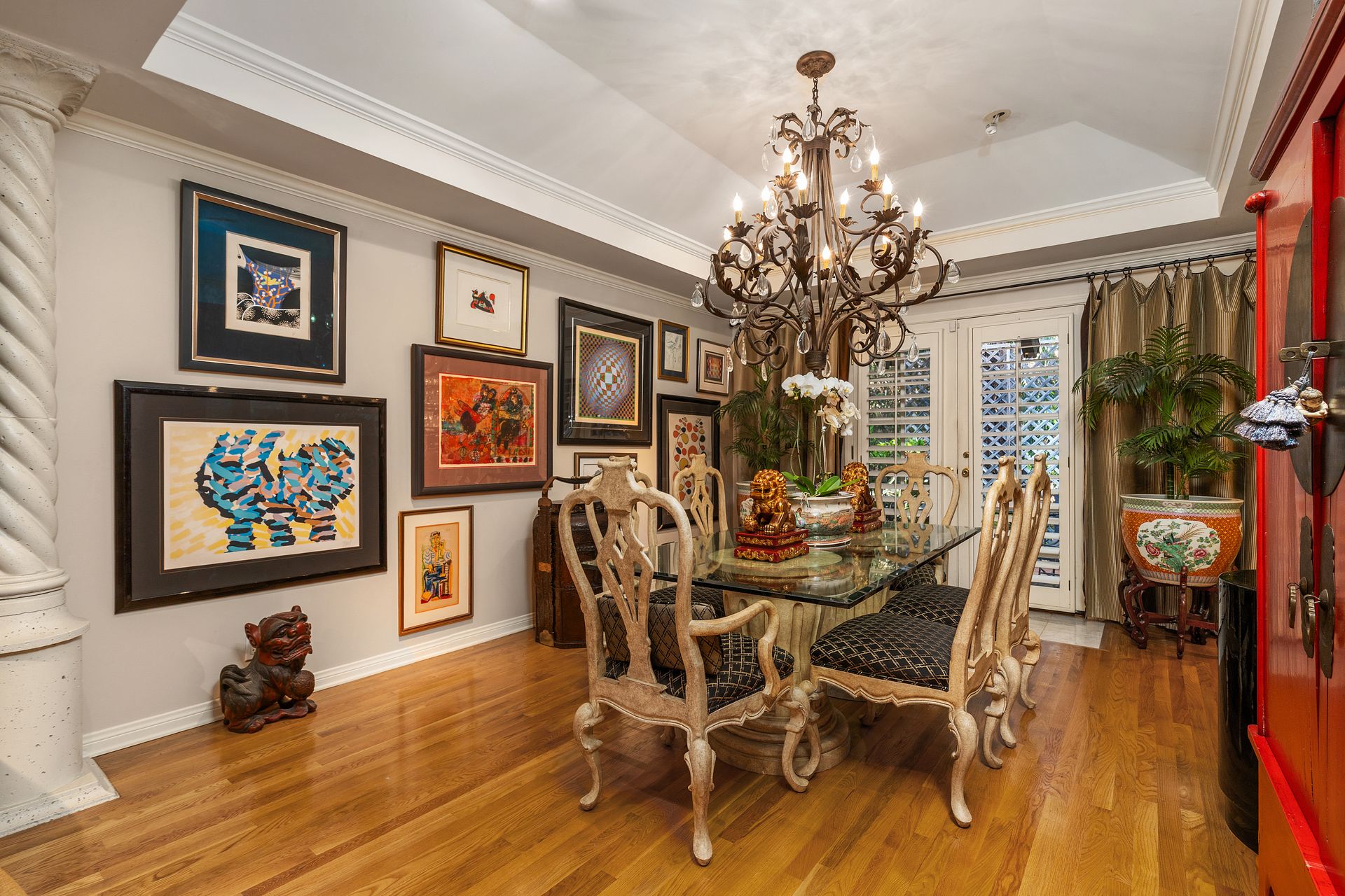 Elegant finishes like stone columns, a dazzling crystal chandelier, and a wet bar with shimmering glass cabinetry welcome you into the dining room. Outside is a large patio off the dining room. The gourmet kitchen features an island with bar seating and a breakfast nook, showcasing the townhouse's expansive views. A third bedroom is used as a den and has a three-quarter bathroom nearby.