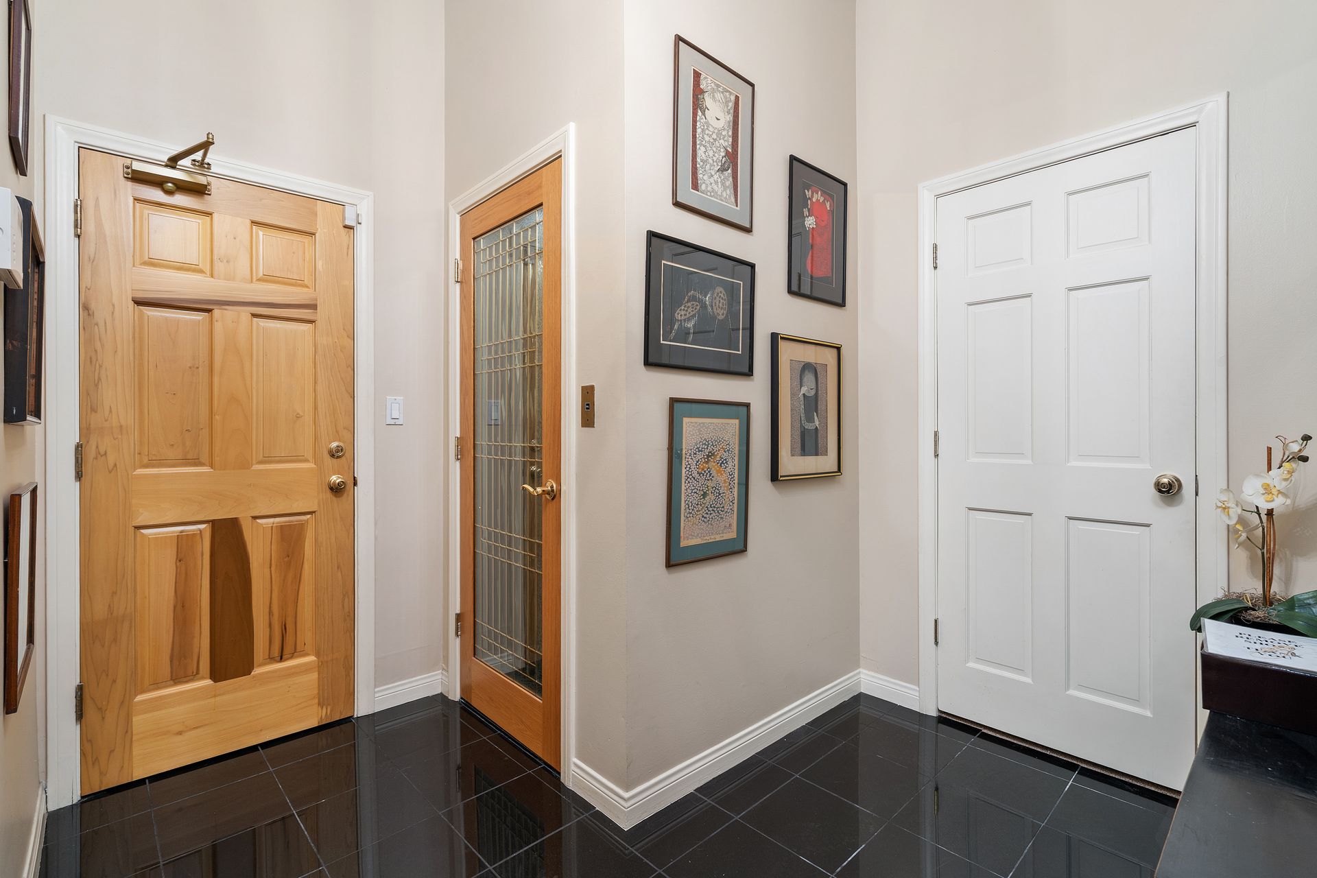 Fine appointments include leaded glass elevator doors, recessed lighting throughout, vaulted ceilings, abundant storage, a laundry room with a side-by-side washer and dryer, and copper plumbing.