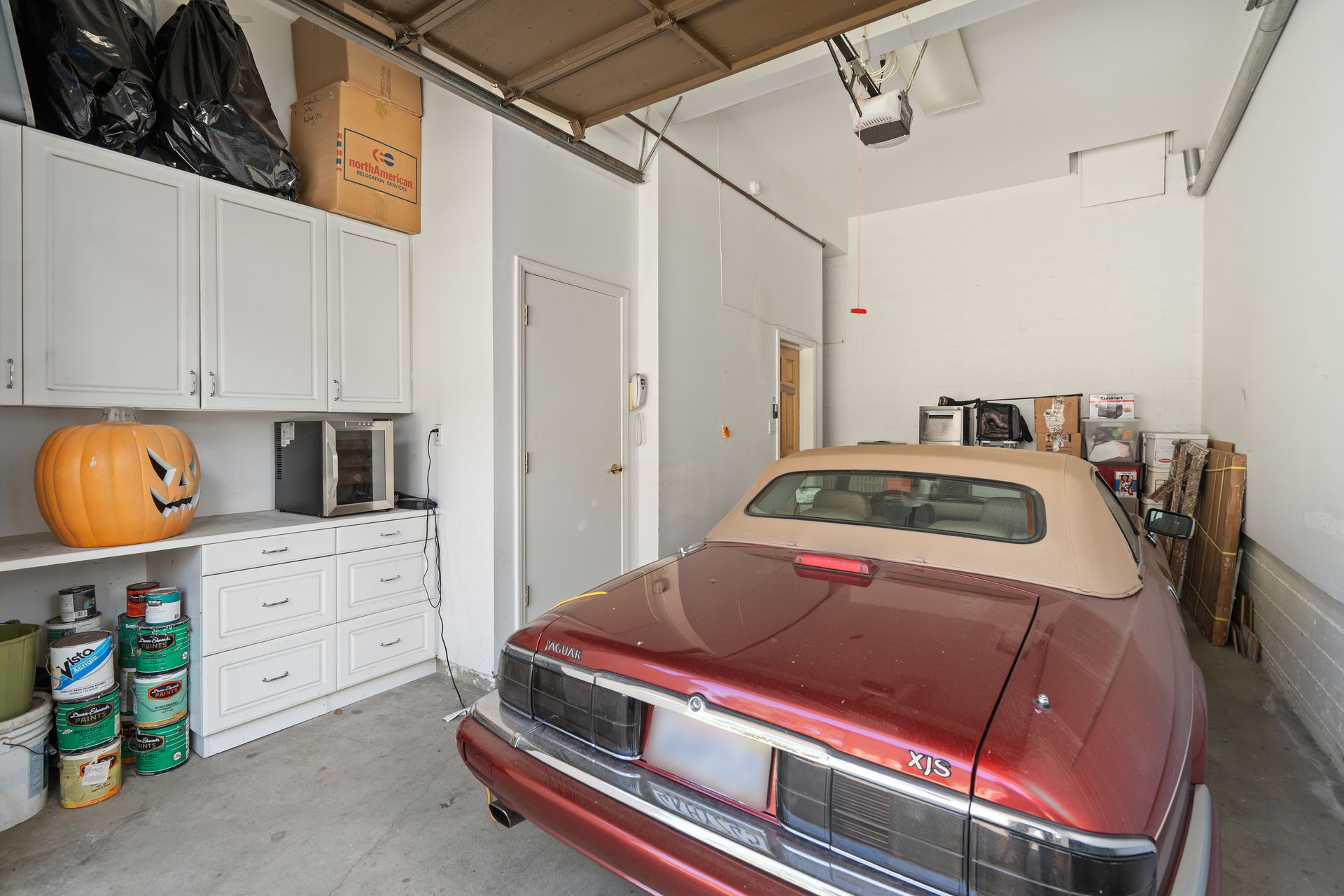 The lower level is at ground level, featuring two private garages with storage rooms.