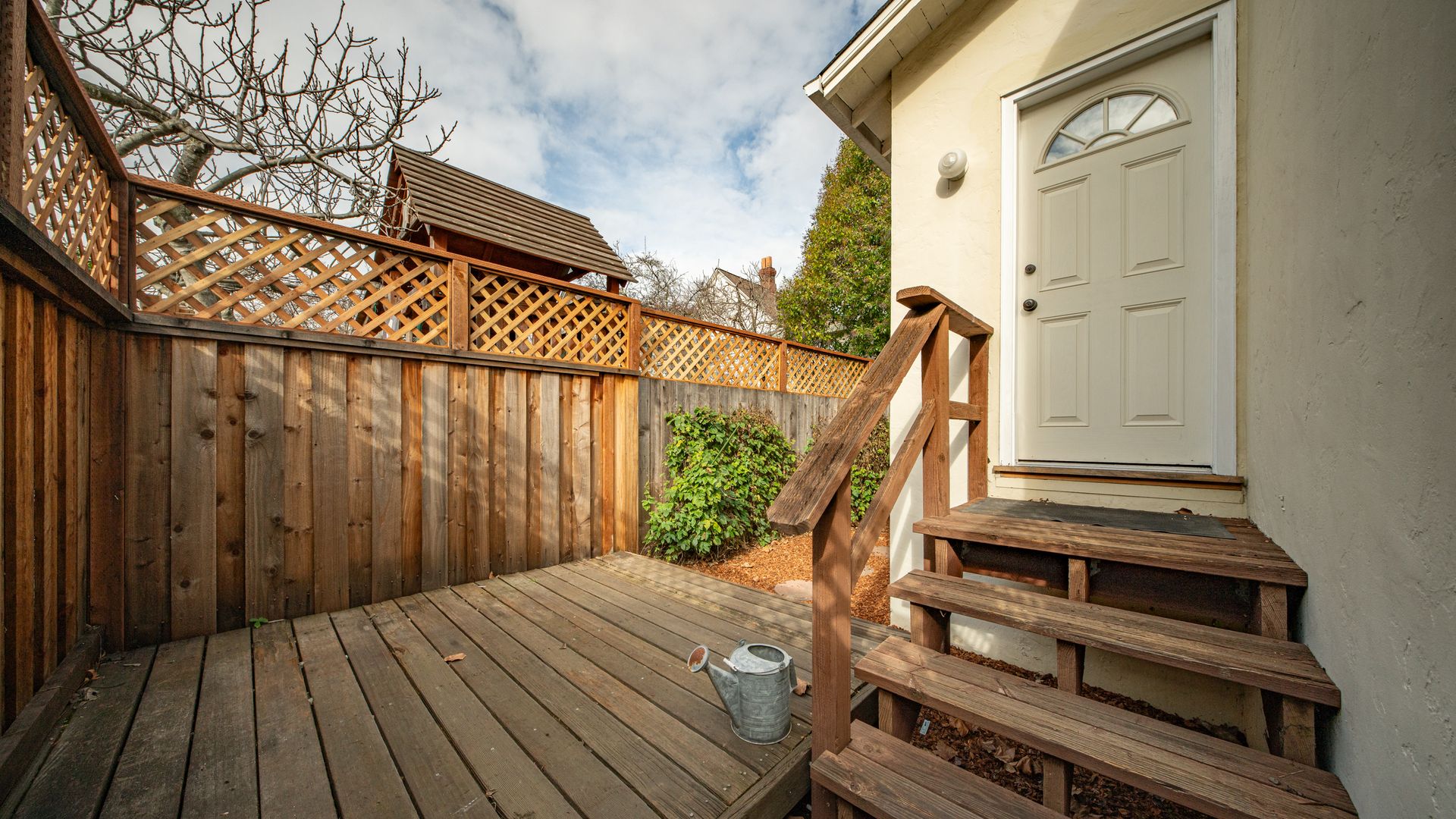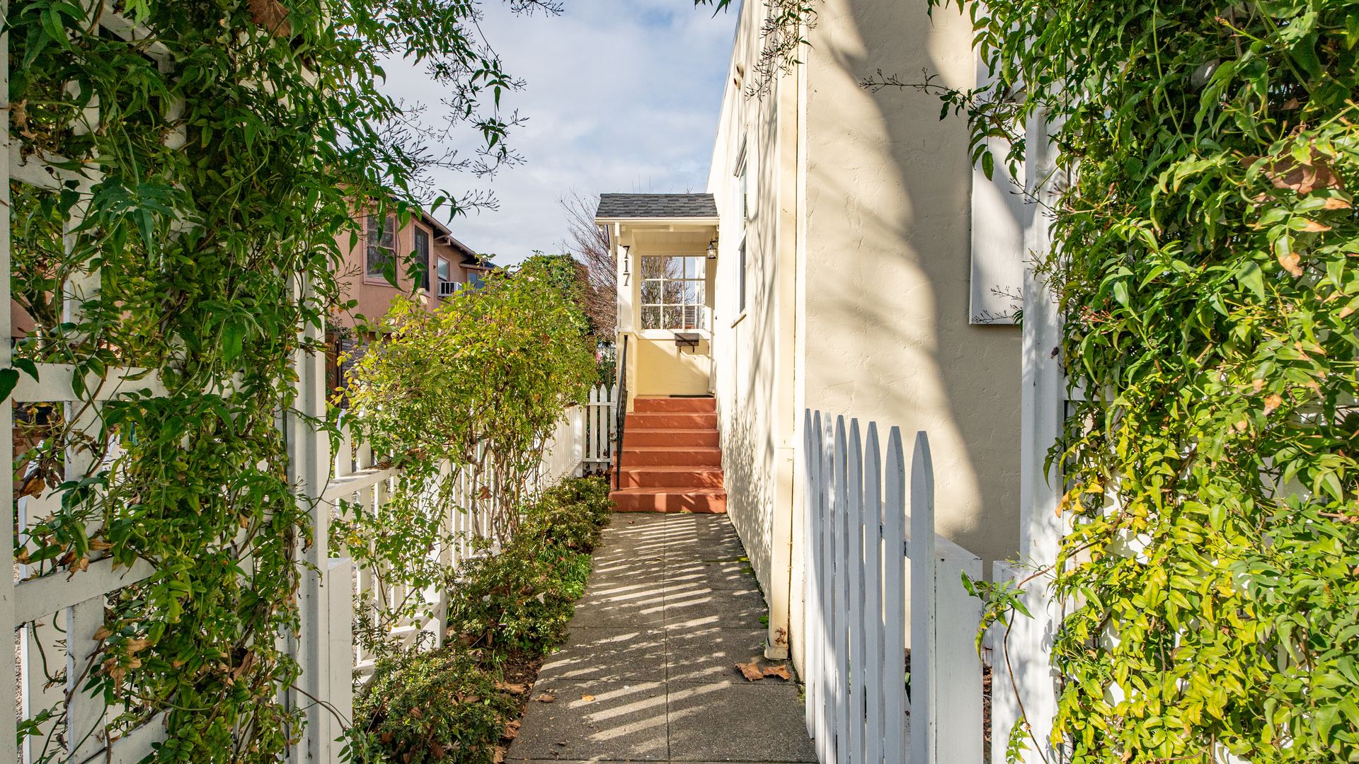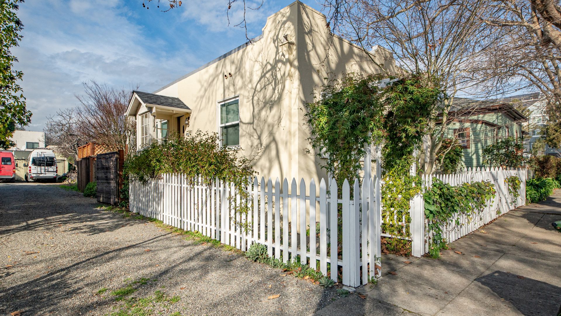 Framed by a classic white picket fence and welcoming entry arbor, the property is fully fenced for privacy and features quaint outdoor spaces with a small deck and garden areas filled with natural light.