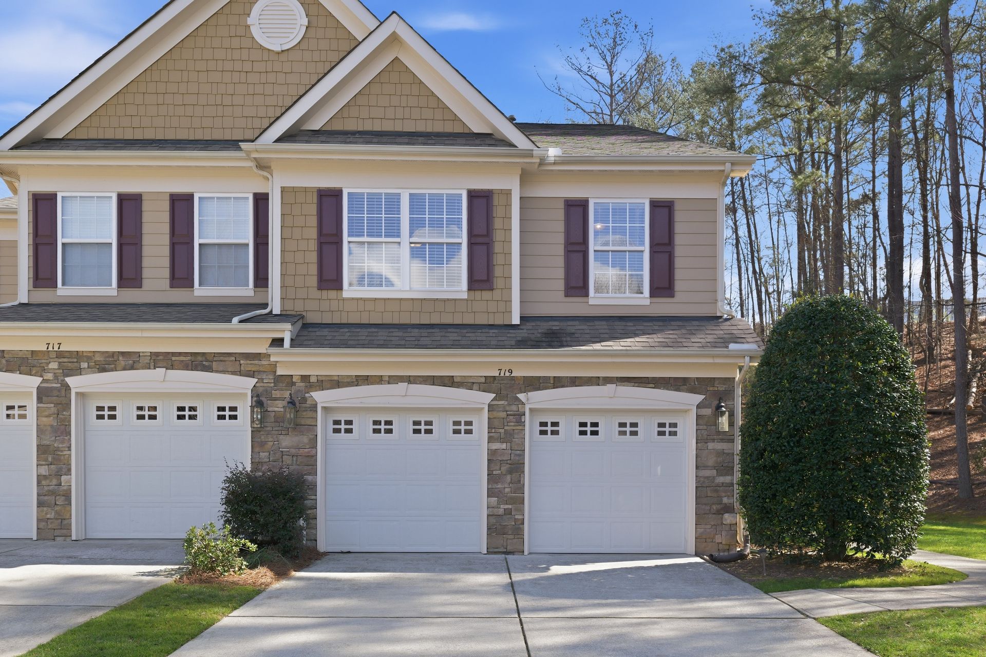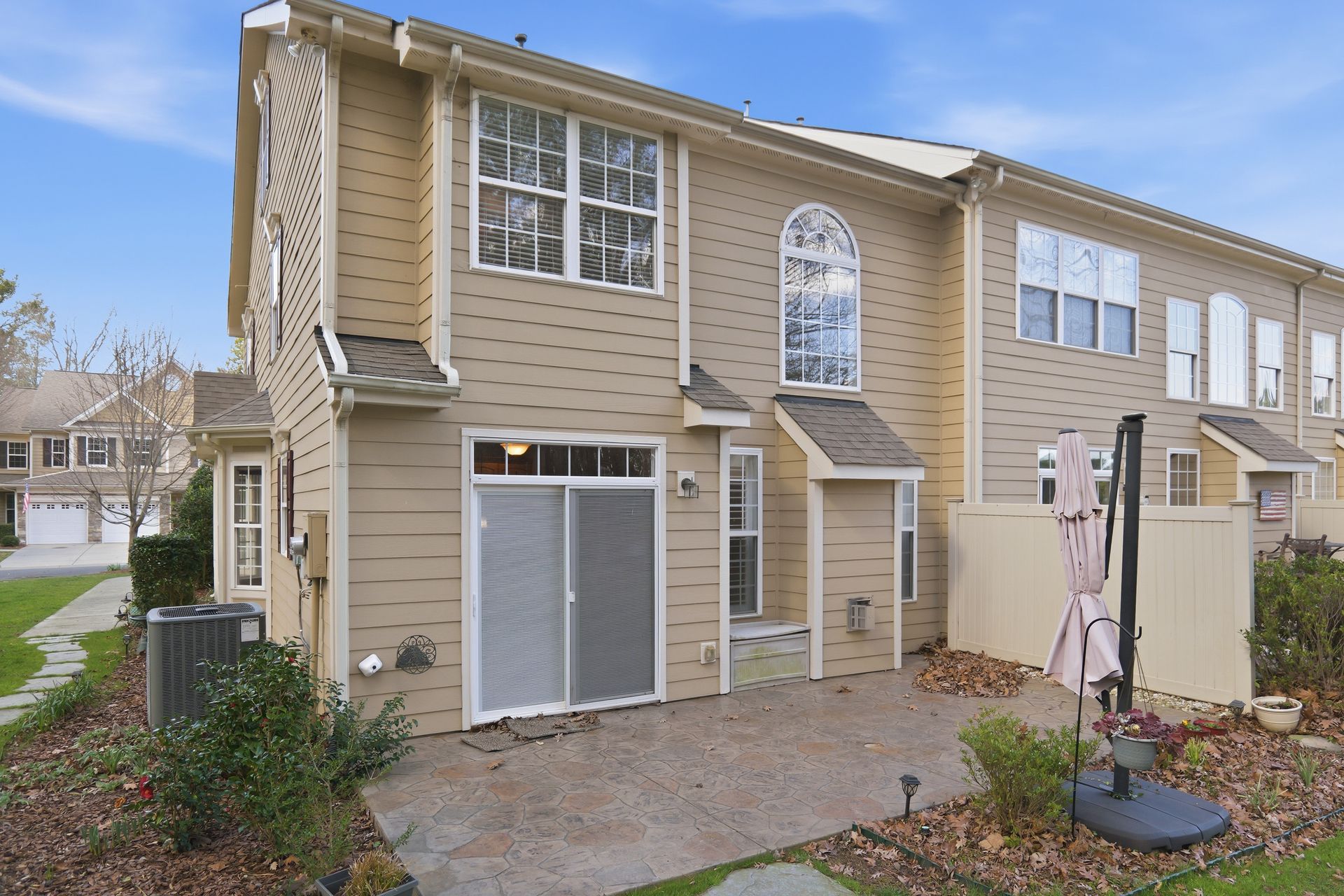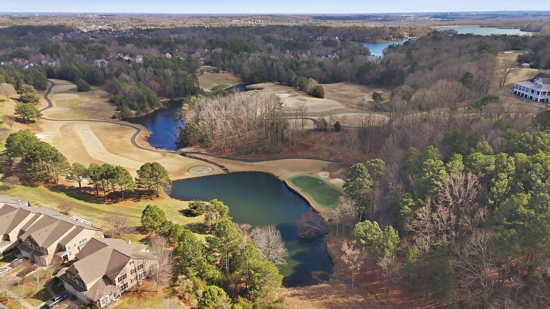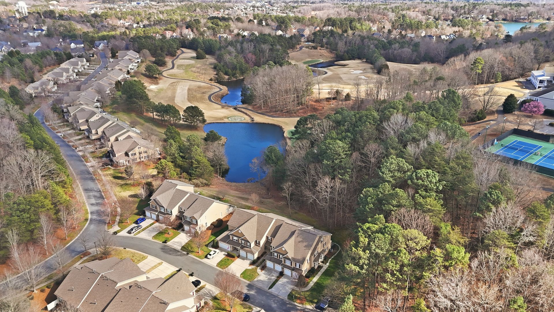 Discover Tega Cay living at its finest in this stunning 2.5 story townhome, tucked away in a serene setting with views of the pond and the 18th hole of Tega Cay Golf Club. Step inside to an inviting open layout where the living, dining, and family rooms flow seamlessly. Large windows over the fireplace fill the space with natural light, enhancing the cozy atmosphere. The kitchen features updated appliances and a breakfast nook, ideal for enjoying your morning coffee on the scenic oversized concrete stamped patio. The second floor hosts a primary suite, two additional bedrooms, a full bath, and laundry, while the third floor offers a versatile bonus room and extra bath. The beautifully landscaped yard showcases vibrant perennials. Recent upgrades include a new roof 2018, HVAC 2017, plantation shutters, primary bath updated tile and shower, and kitchen appliances. All Pex plumbing replaced 2019 and hot water tank 2022. End unit backs up to woods with 2-car epoxy garage. Embrace the resort style amenities and active lifestyle and charm of Tega Cay!
