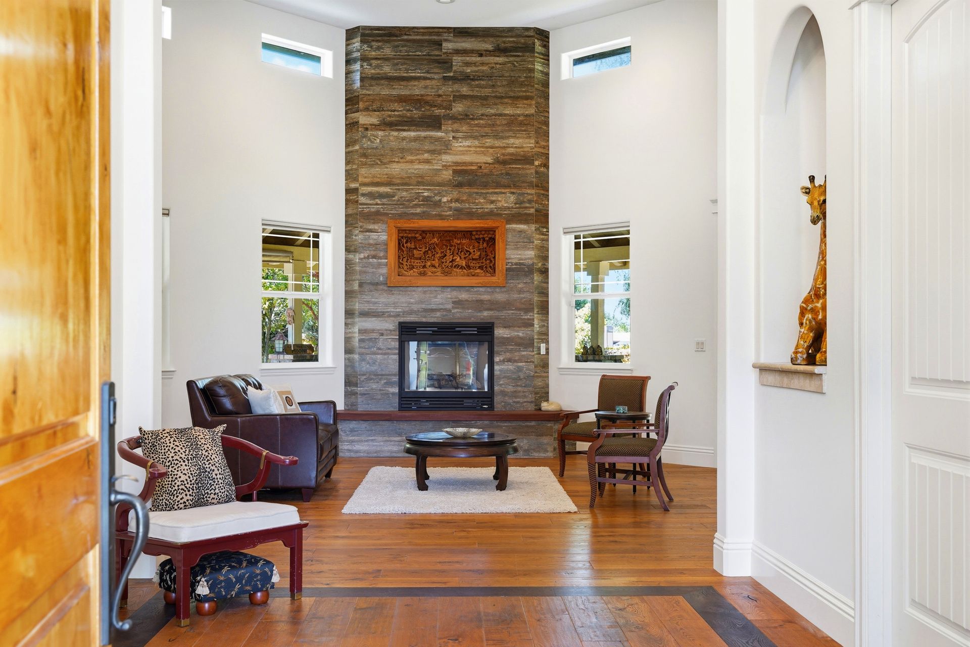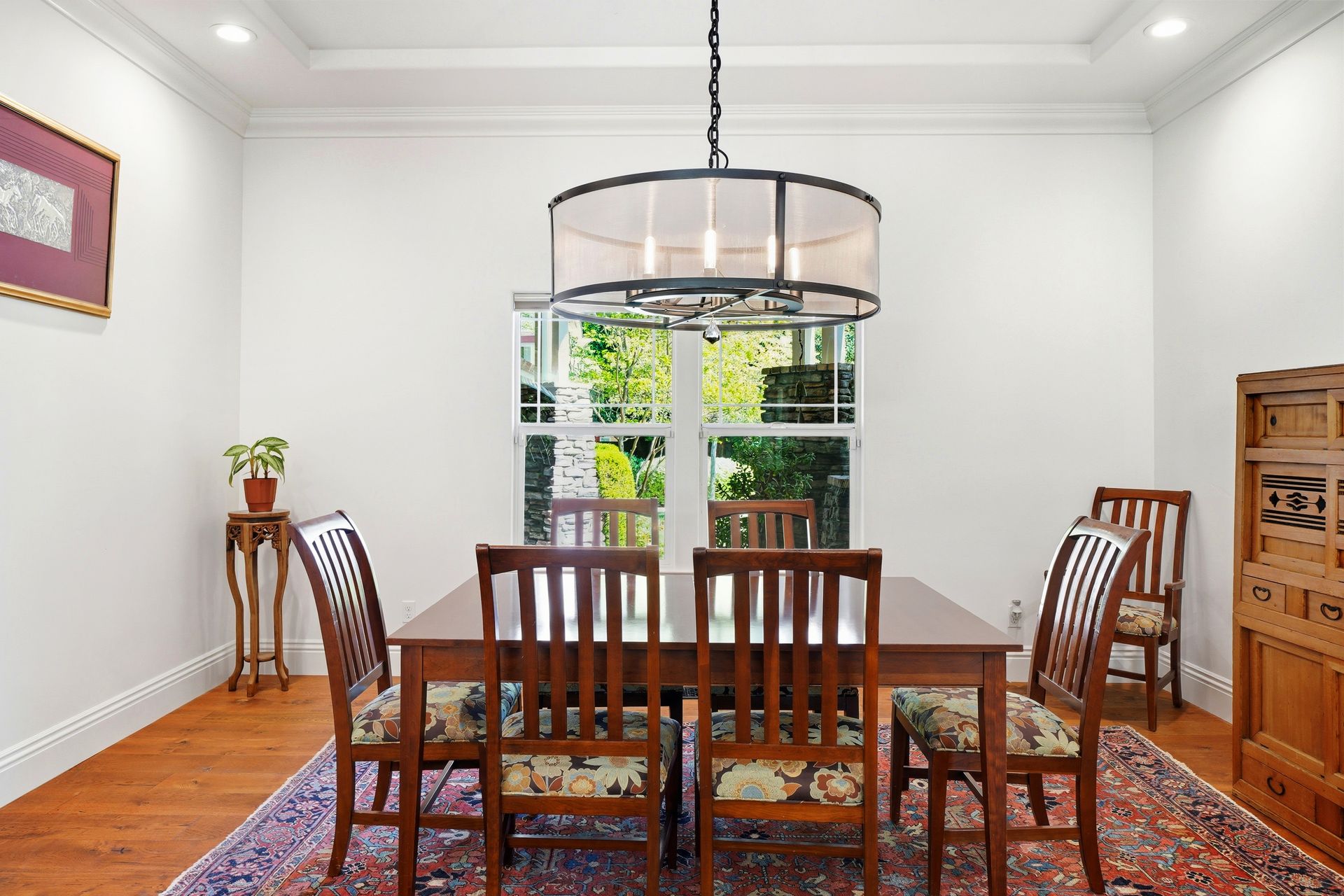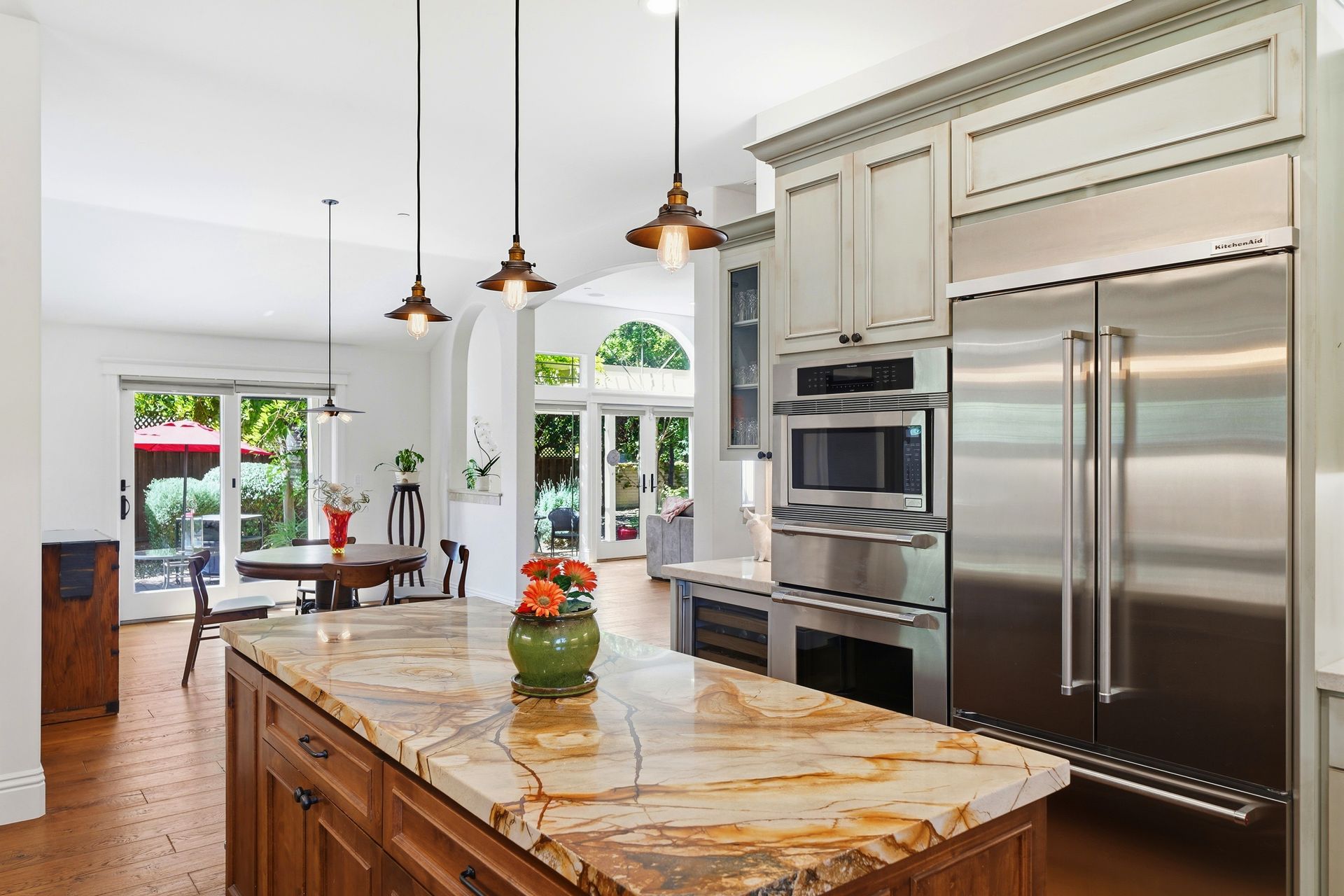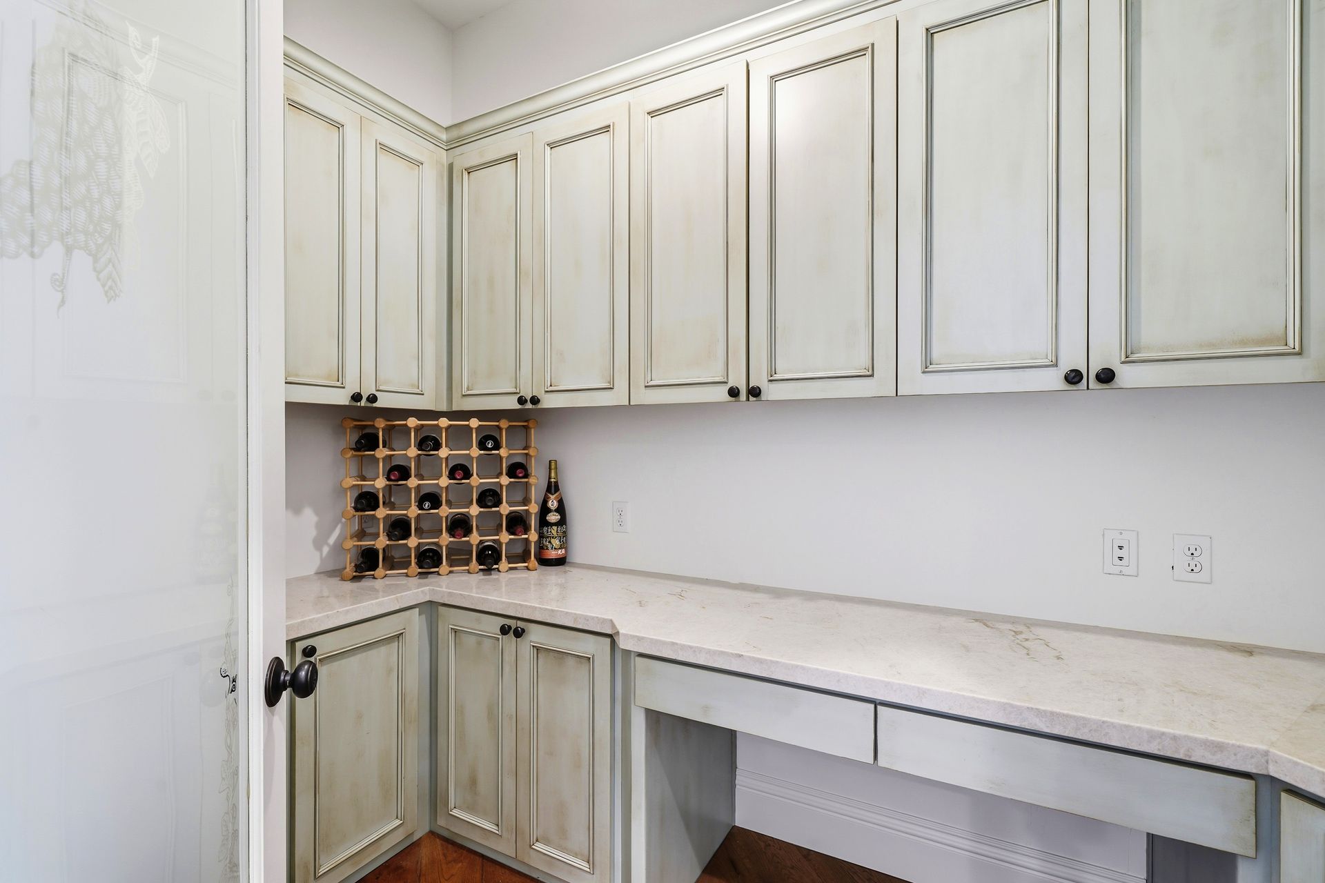 The front door opens to a formal foyer that expands to the living room with a grand stoned fireplace and French doors to the yard. From here, the single-story home has two wings. The first wing has a spacious family room with abundant natural light. It is framed with open arches with marbled sills allowing natural light to flow to the dining and kitchen areas. The formal dining room features a Butler's Pantry for entertaining ease. An amazing gourmet kitchen with high-end appliances, copper sink, gas stove with pot filling faucet at the ready, beverage/wine refrigerator, a large island for additional prepping area, and cabinets. A separate walk-in pantry has ample room for supplies. Across from the kitchen is an informal dining area for everyday convenience. There is a full bath near the kitchen. A breezeway to the garage has a hall tree and bench.