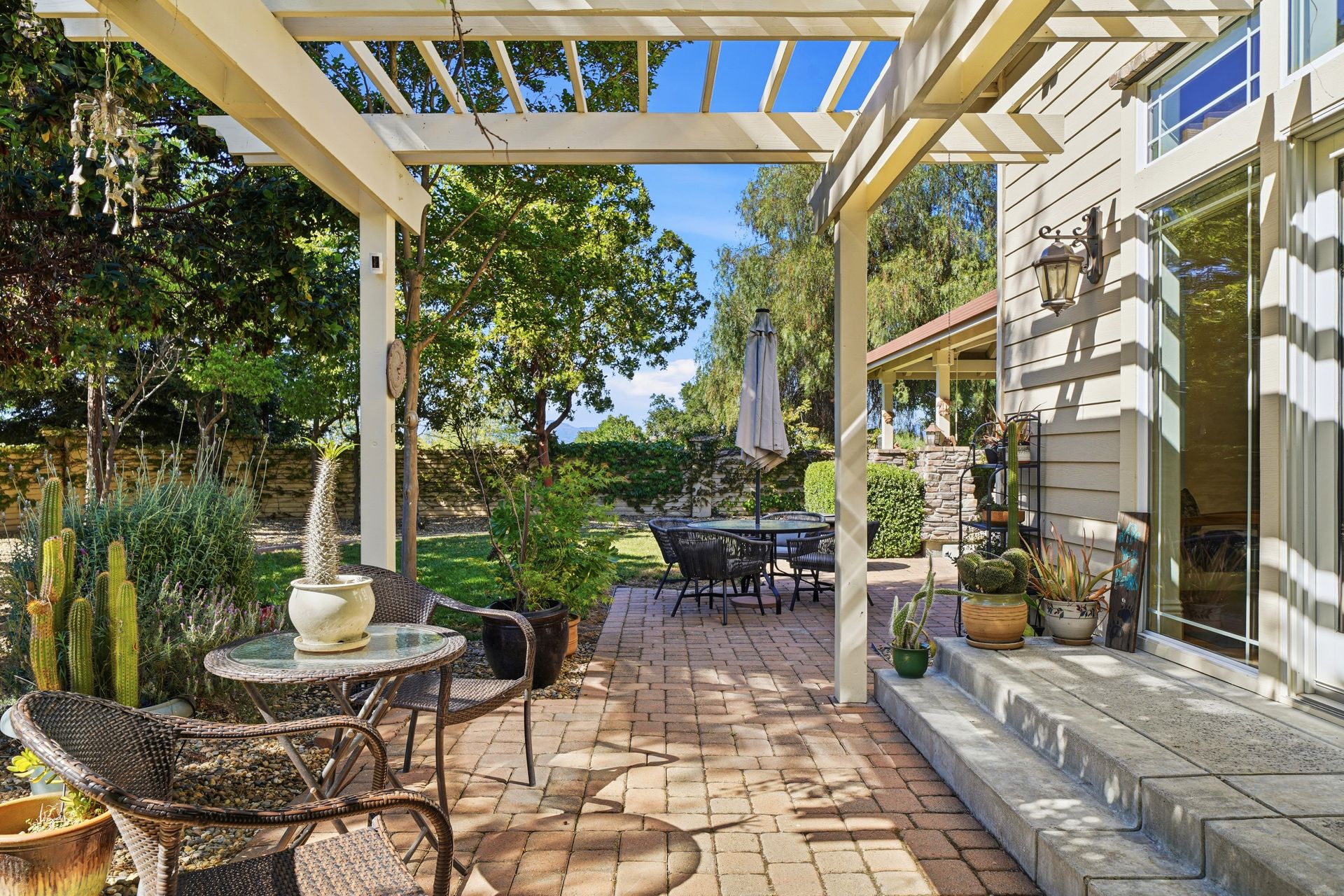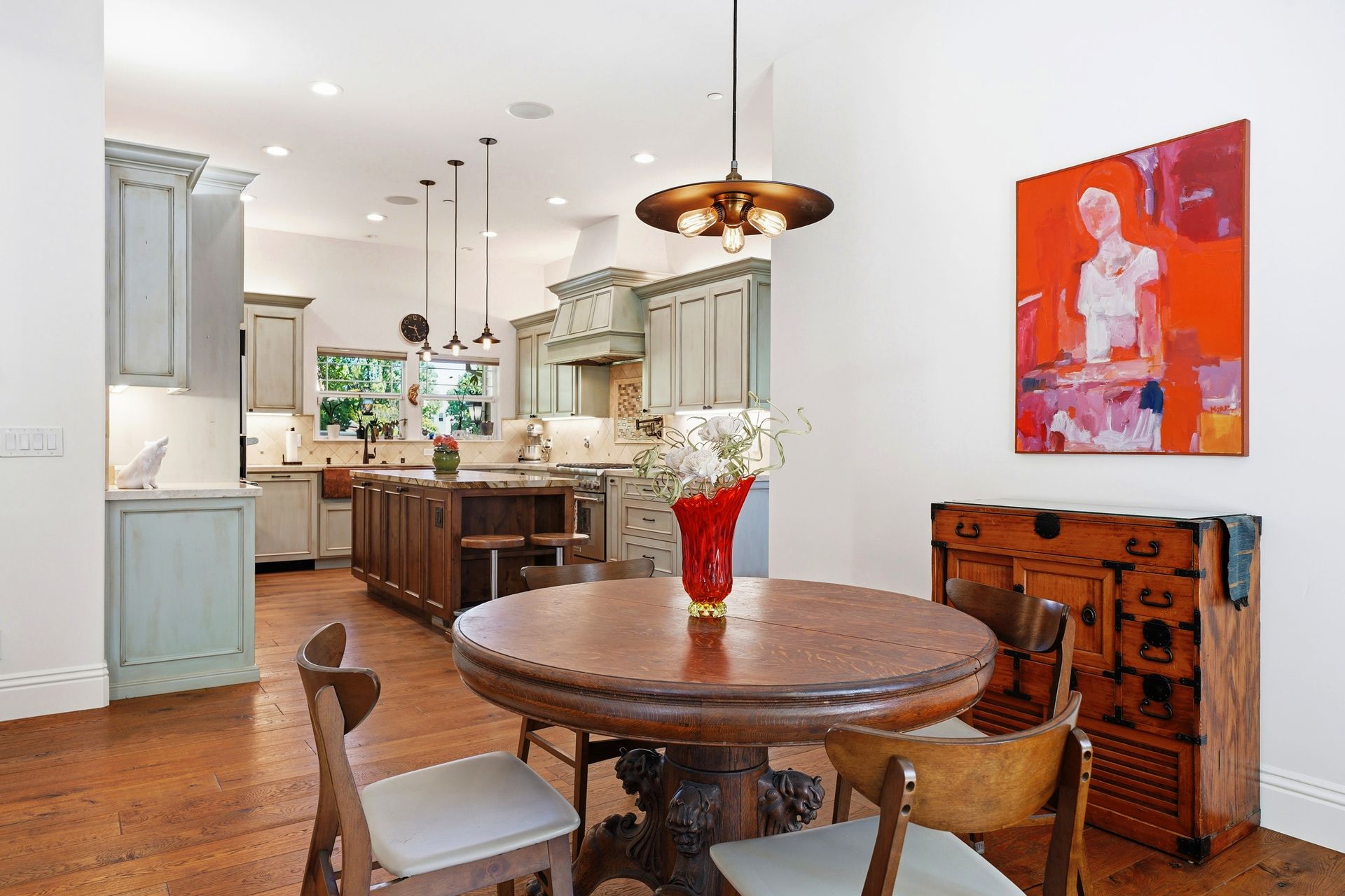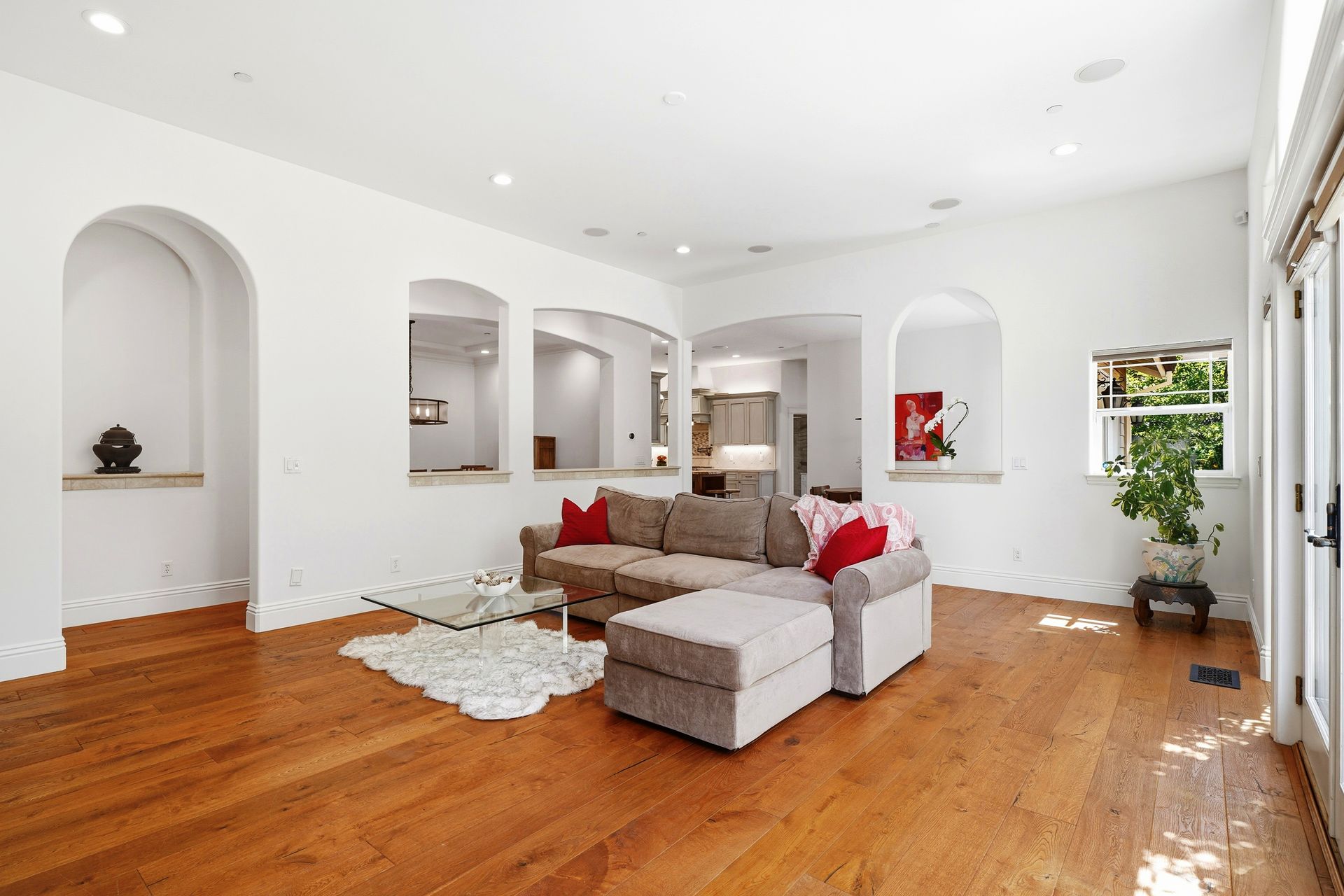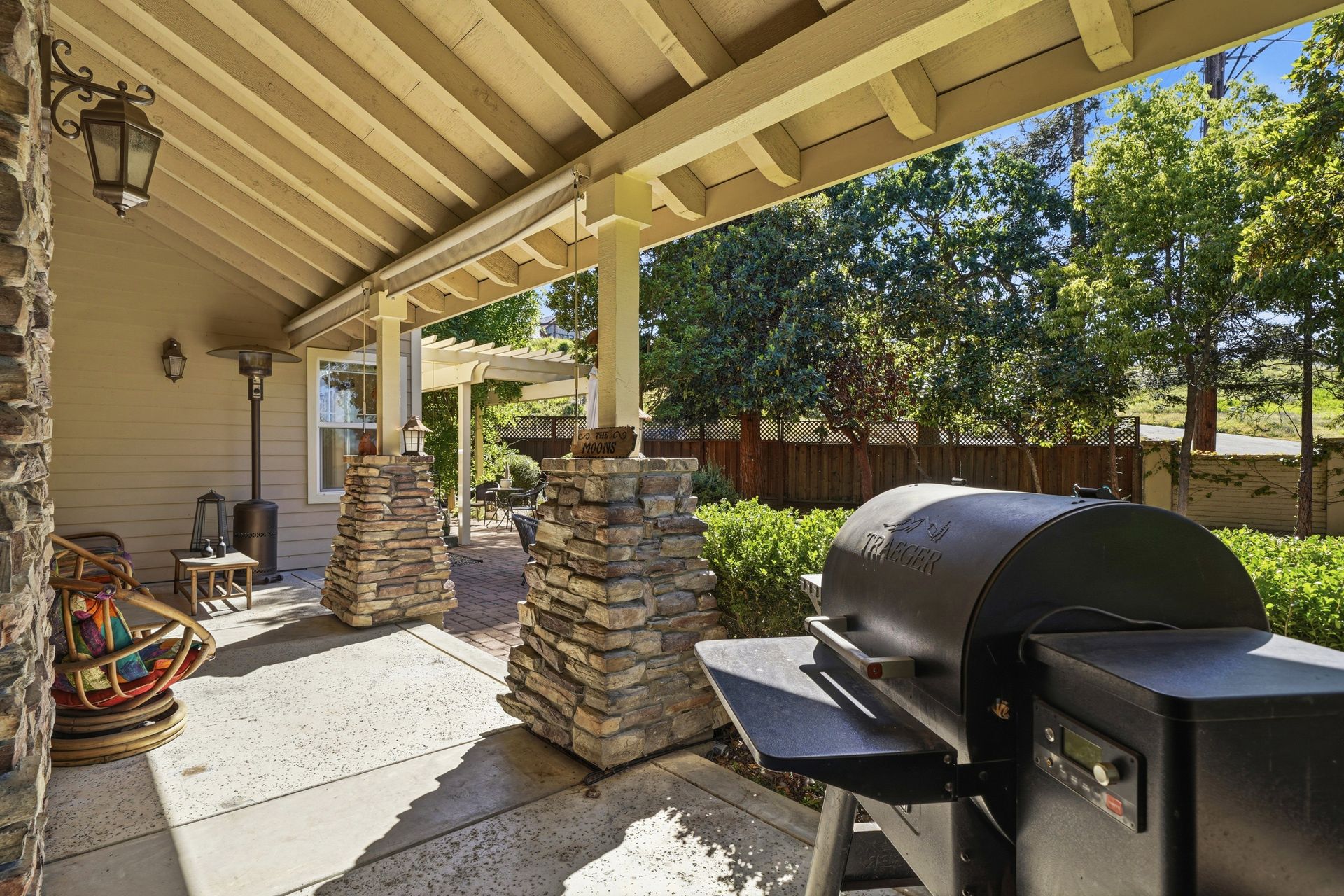 The front door opens to a formal foyer that expands to the living room with a grand stoned fireplace and French doors to the yard. From here, the single-story home has two wings. The first wing has a spacious family room with abundant natural light. It is framed with open arches with marbled sills allowing natural light to flow to the dining and kitchen areas. The formal dining room features a Butler's Pantry for entertaining ease. An amazing gourmet kitchen with high-end appliances, copper sink, gas stove with pot filling faucet at the ready, beverage/wine refrigerator, a large island for additional prepping area, and cabinets. A separate walk-in pantry has ample room for supplies. Across from the kitchen is an informal dining area for everyday convenience. There is a full bath near the kitchen. A breezeway to the garage has a hall tree and bench.