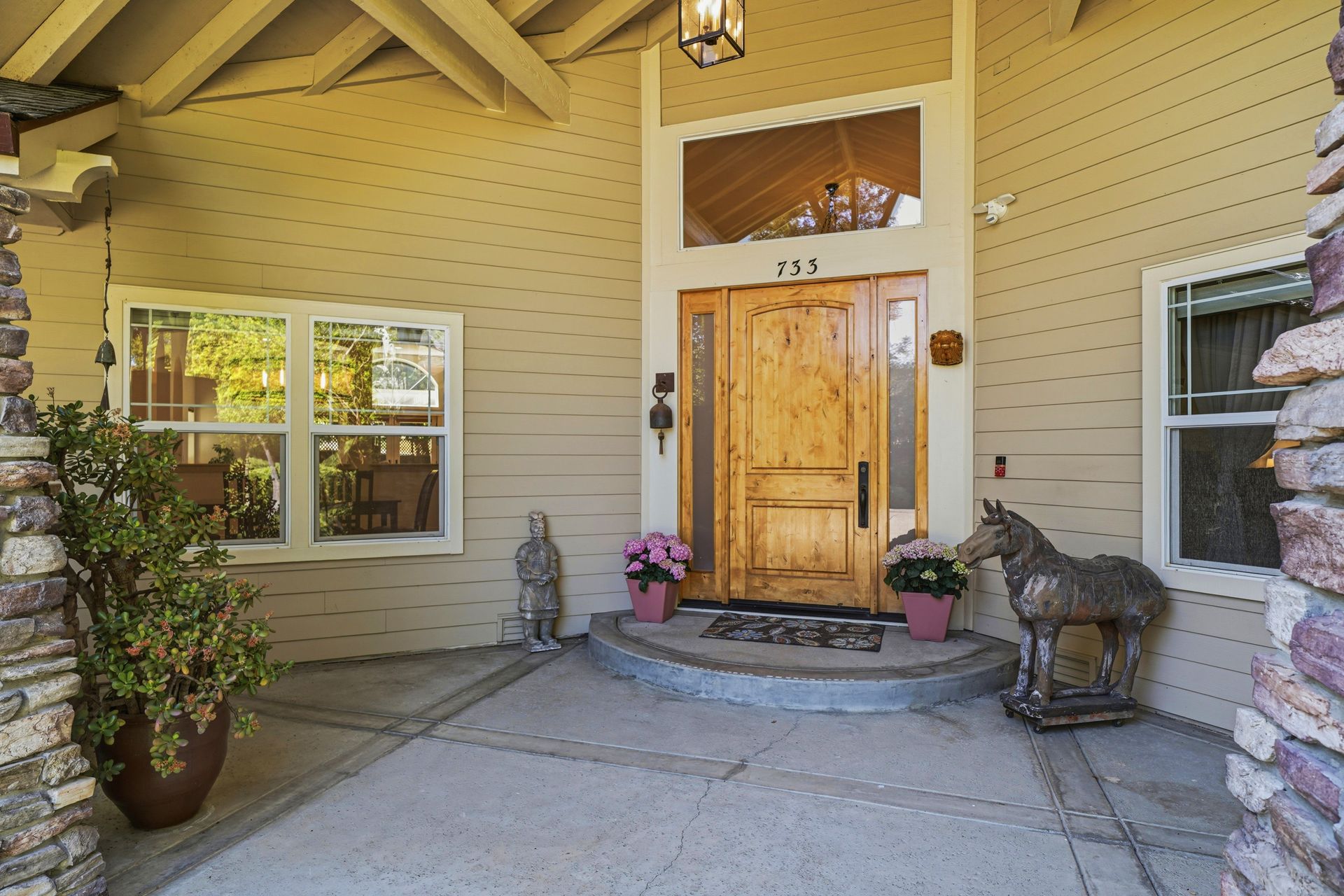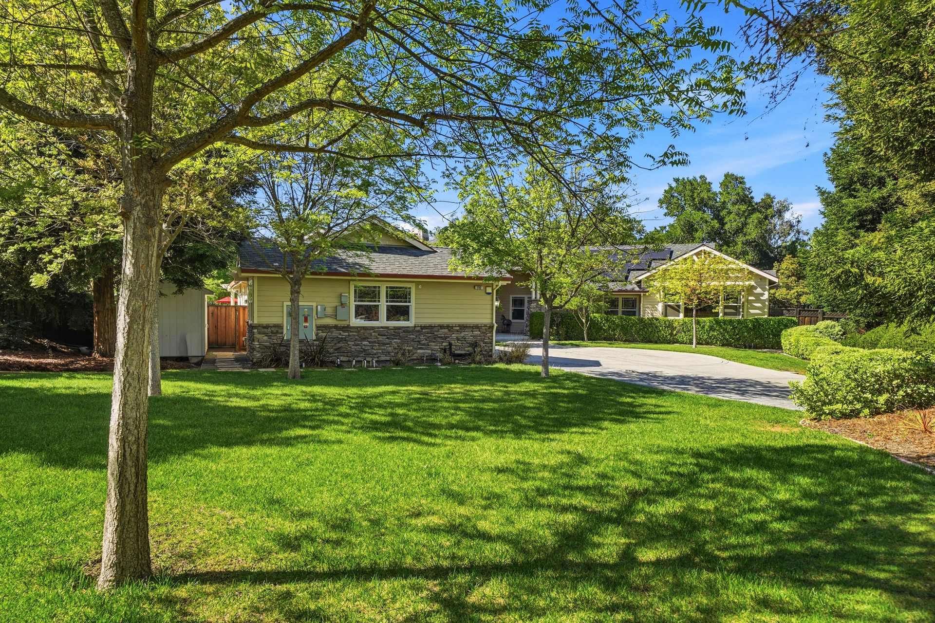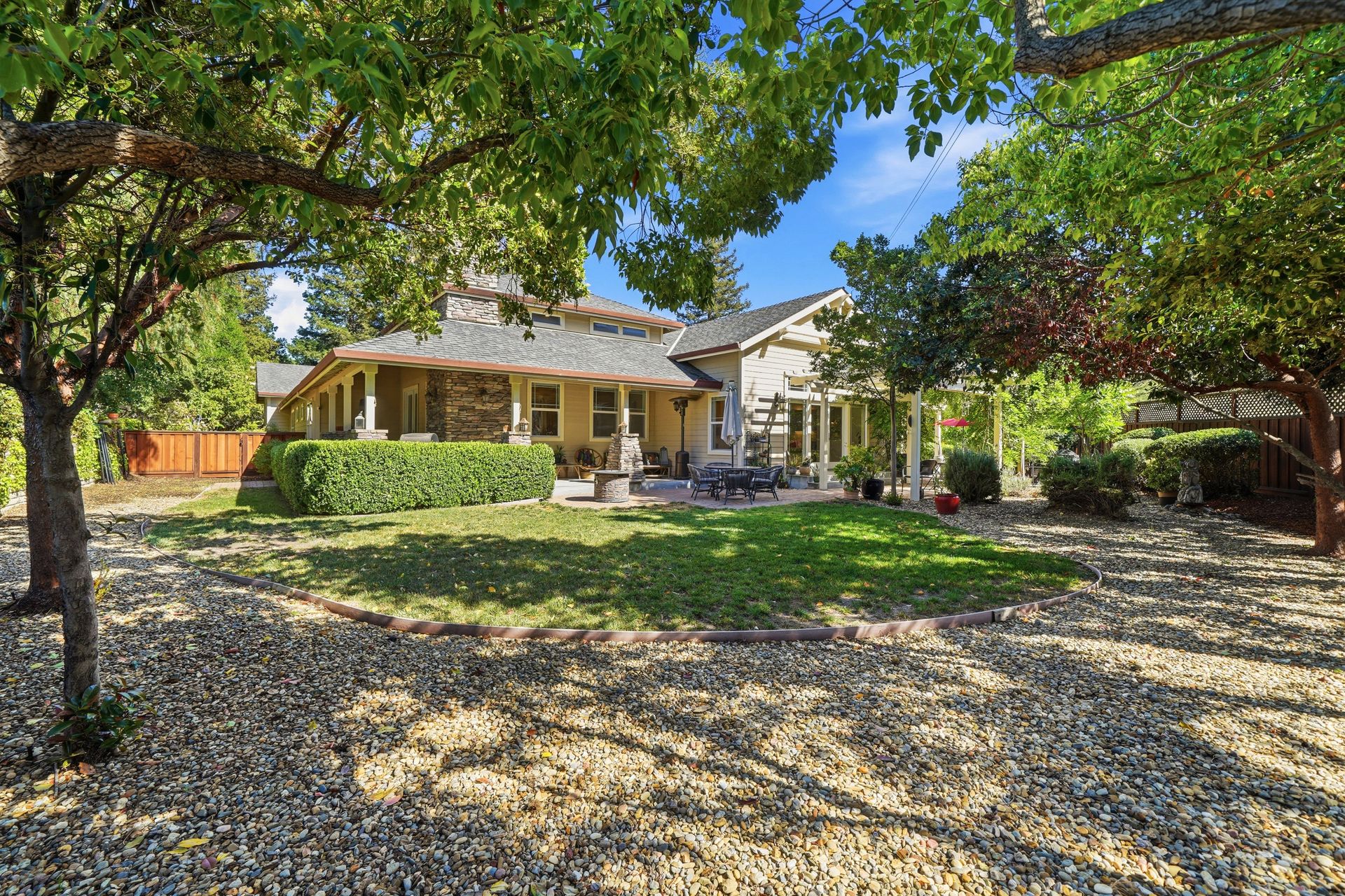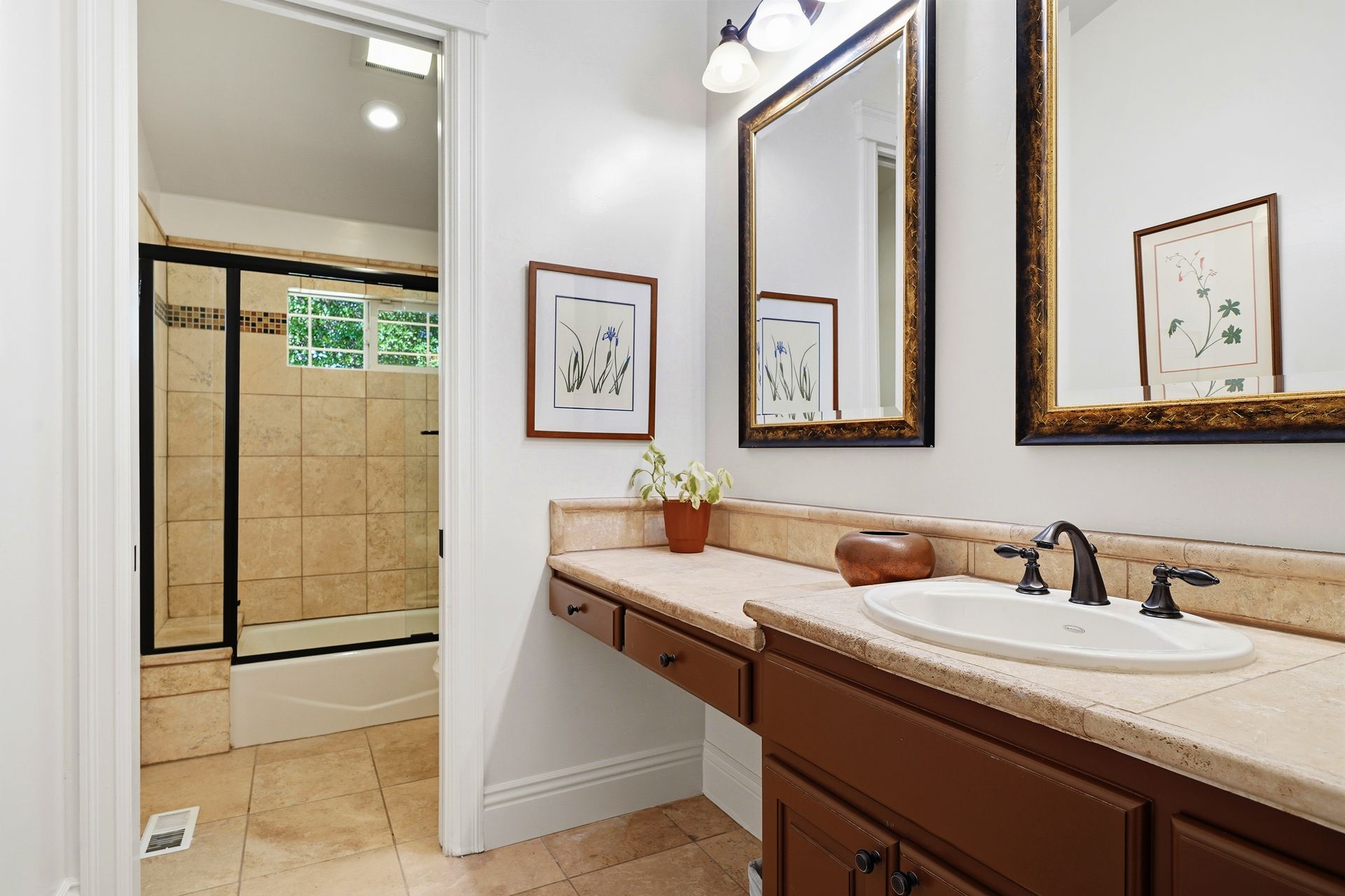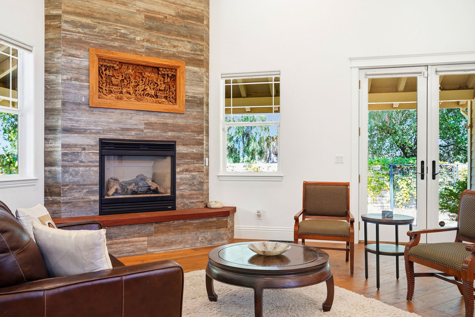 The front door opens to a formal foyer that expands to the living room with a grand stoned fireplace and French doors to the yard. From here, the single-story home has two wings. The first wing has a spacious family room with abundant natural light. It is framed with open arches with marbled sills allowing natural light to flow to the dining and kitchen areas. The formal dining room features a Butler's Pantry for entertaining ease. An amazing gourmet kitchen with high-end appliances, copper sink, gas stove with pot filling faucet at the ready, beverage/wine refrigerator, a large island for additional prepping area, and cabinets. A separate walk-in pantry has ample room for supplies. Across from the kitchen is an informal dining area for everyday convenience. There is a full bath near the kitchen. A breezeway to the garage has a hall tree and bench.